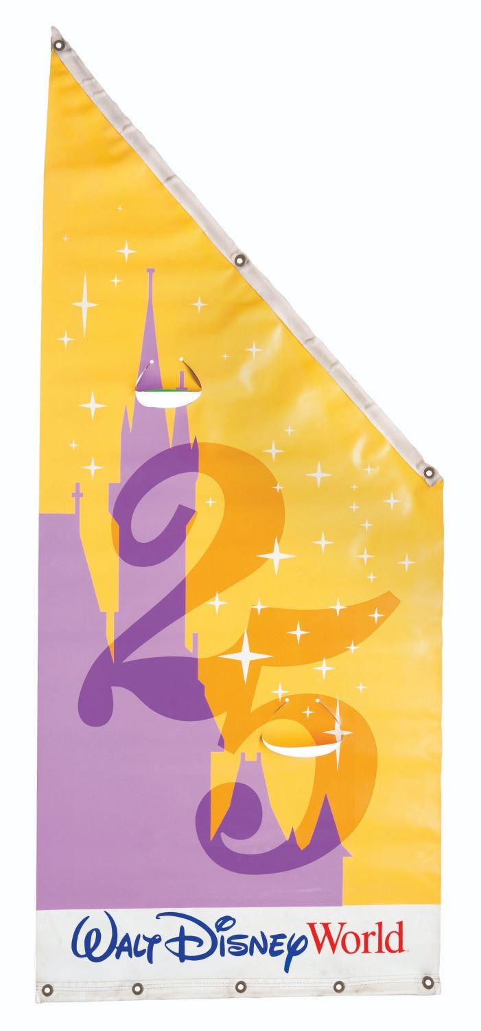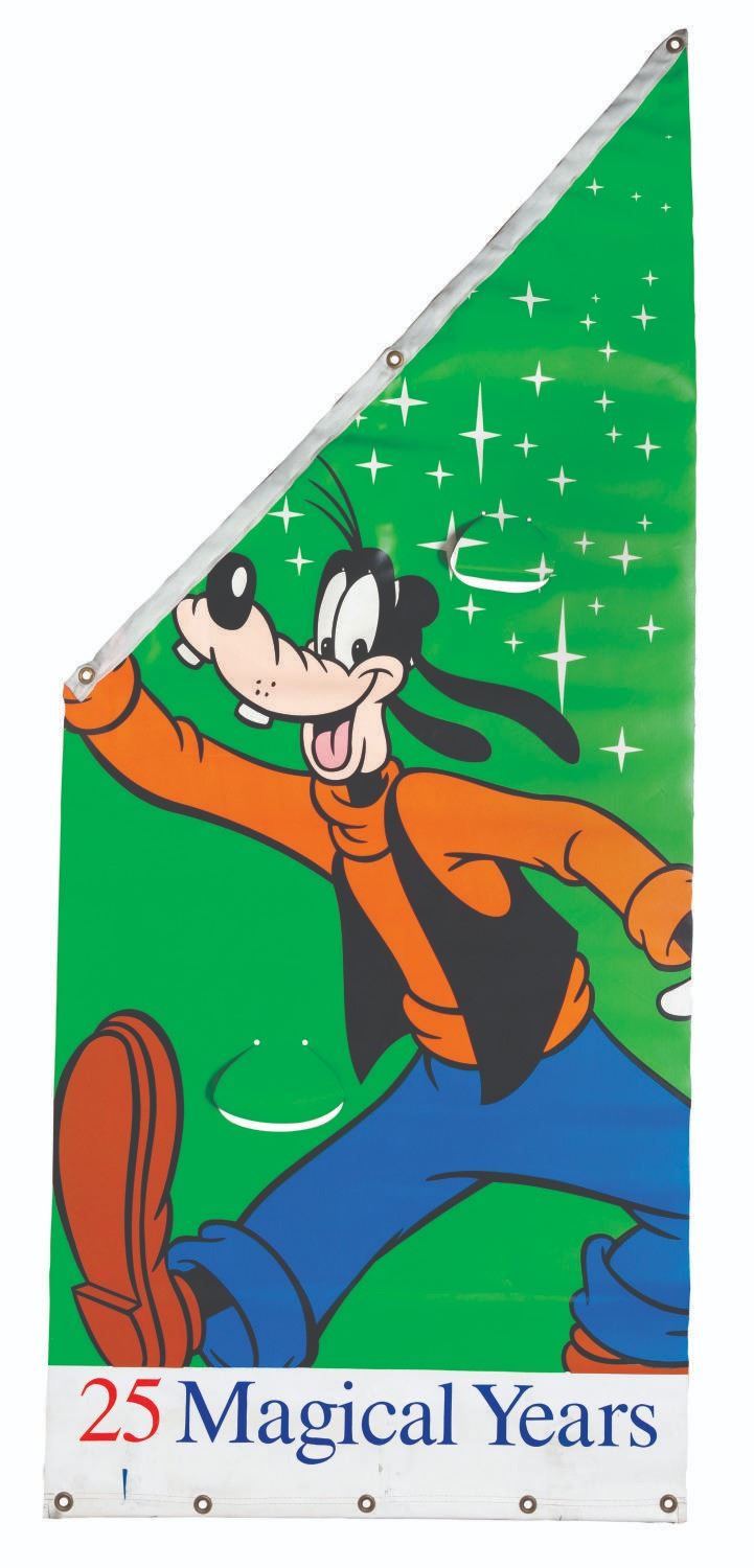 (Walt Disney World, 1996) A double-sided banner celebrating the 25th anniversary of Walt Disney World. One side features Goofy and the text “25 Magical Years,” while the reverse shows a “25” and Cinderella Castle. Measuring 29.75” x 70.5”, the banner is in very good condition with two intentional holes for wind resistance and typical wear from Park use.