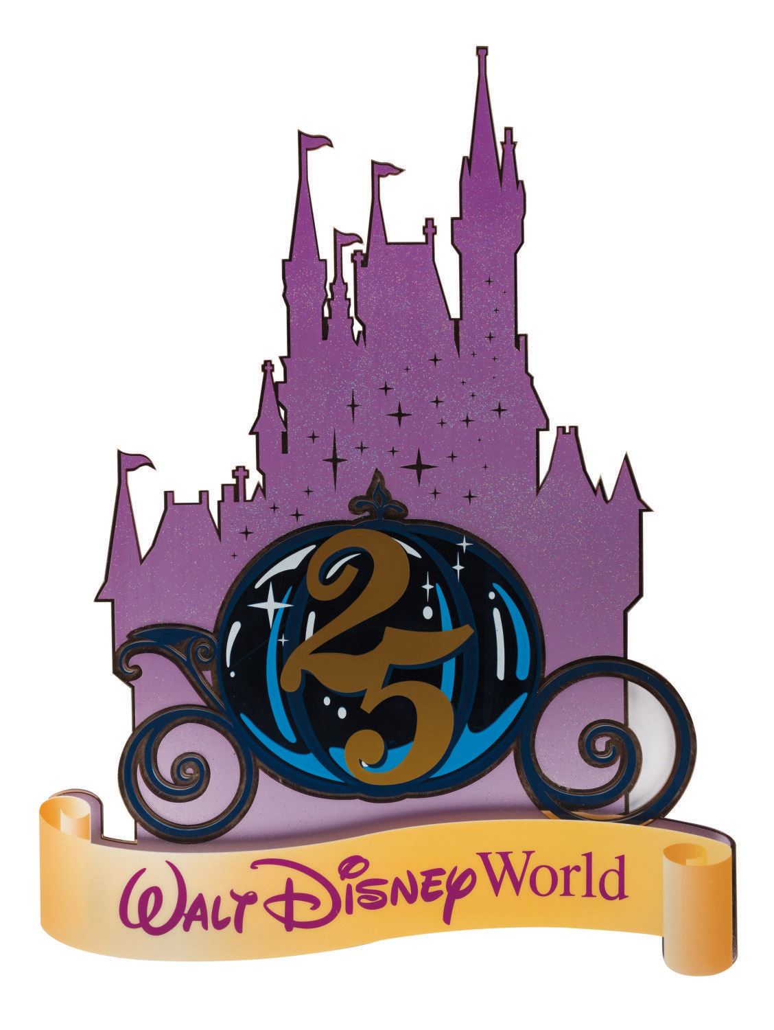 (Walt Disney World, 1996) A lamppost sign advertising the 25th anniversary celebration of Walt Disney World. The glittering, reflective, and dimensional sign features Cinderella Castle and Pumkin Coach. Measuring 25.25"x34.25", the sign is in very good condition with a few scuffs, and wear to the reverse.