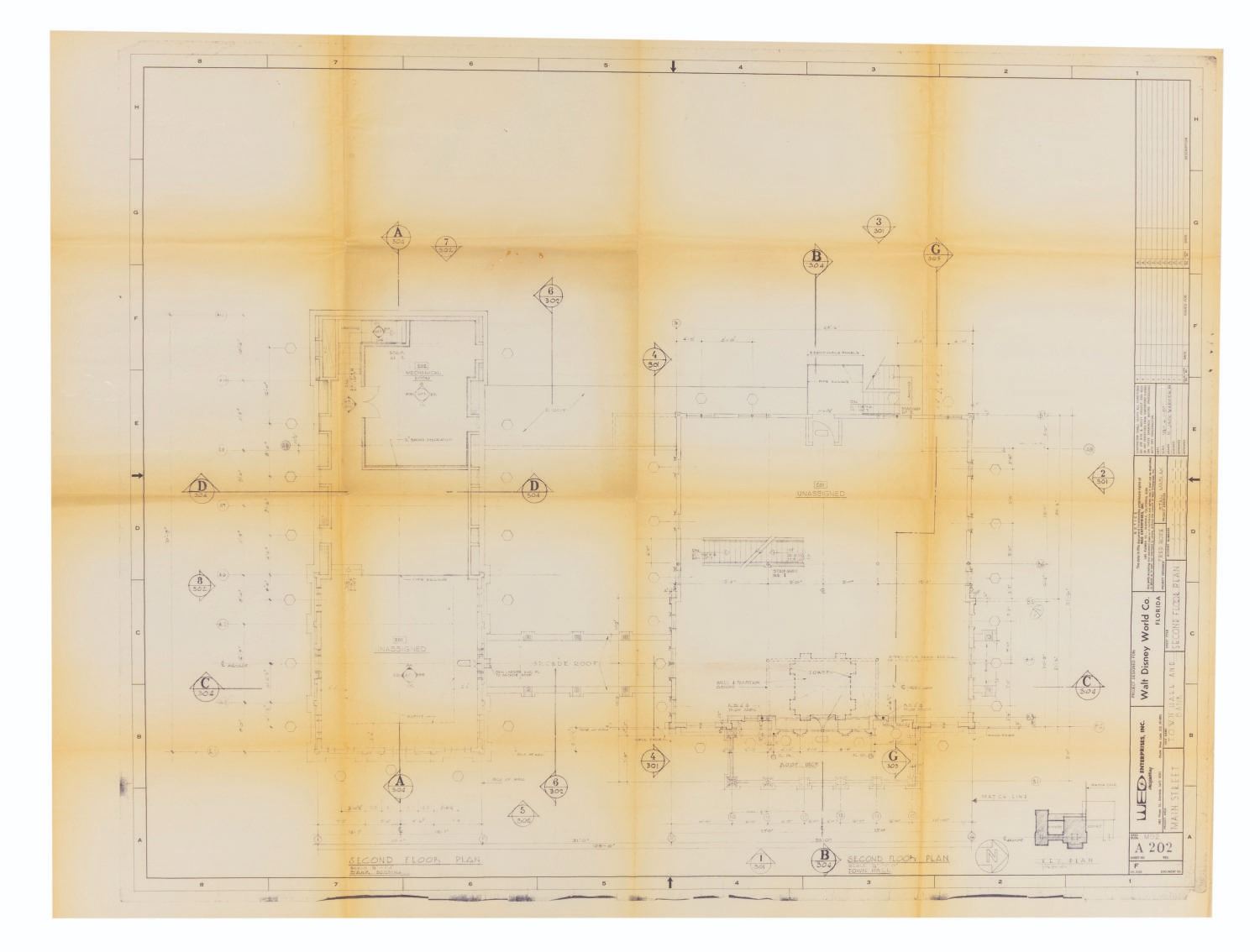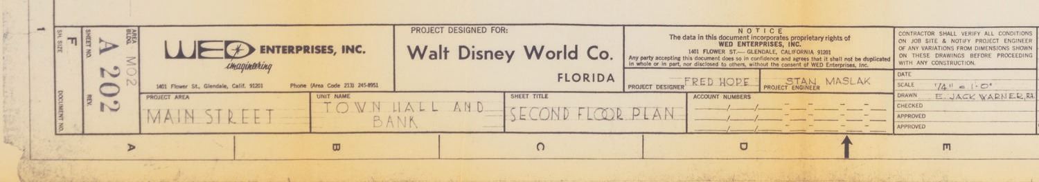 (Walt Disney World, 1960s) A Walt Disney World blueprint for the second floor of the Town Hall and Bank on Main Street U.S.A. The plans include space for a tower, a mechanical room, and a roof deck. Measuring 36" x 48", the blueprint displays in good condition with heavy discoloration along the edges and folds, and light edge wear and creasing.