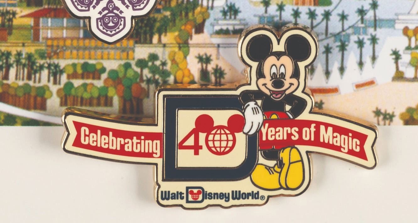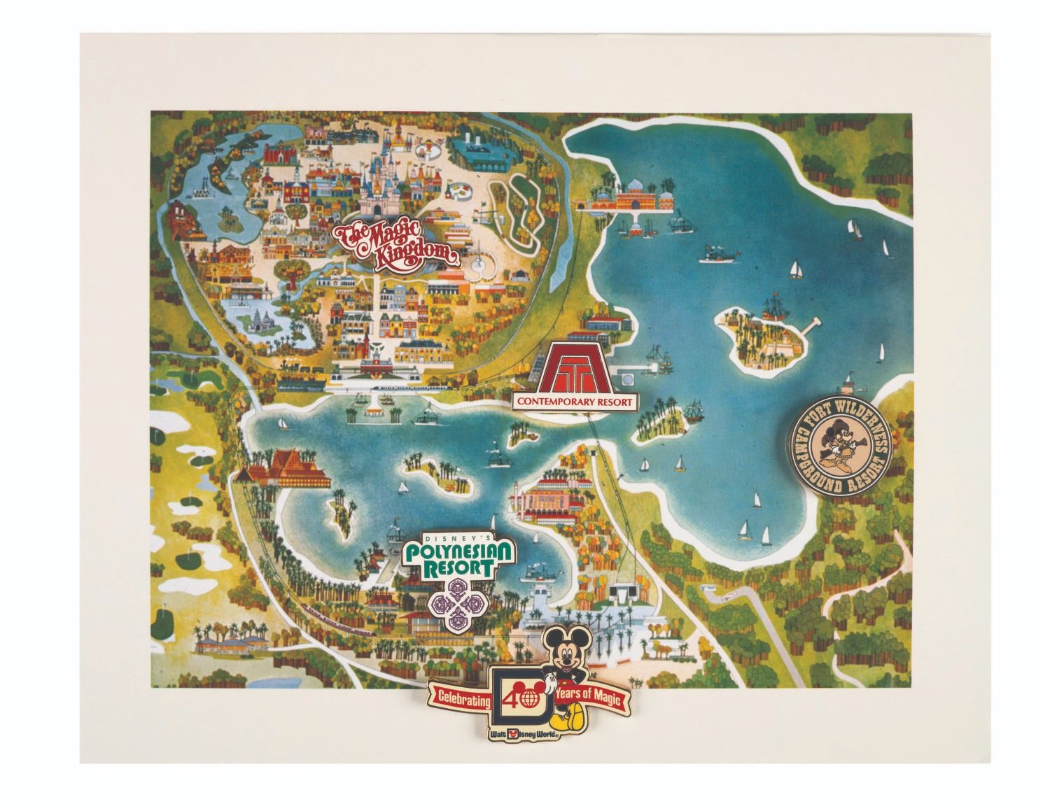 (Walt Disney World, 2011) A Walt Disney World 40th Anniversary 5-pin set including pins of the logos for The Magic Kingdom, the Contemporary Resort, Disney’s Polynesian Resort, Fort Wilderness Campground Resort, and “40 Years of Magic.” Measuring from 1" x 1" to 2.25" x 1.25", each pin is in fine condition and is presented on a fine-condition 8" x 10" map backdrop.