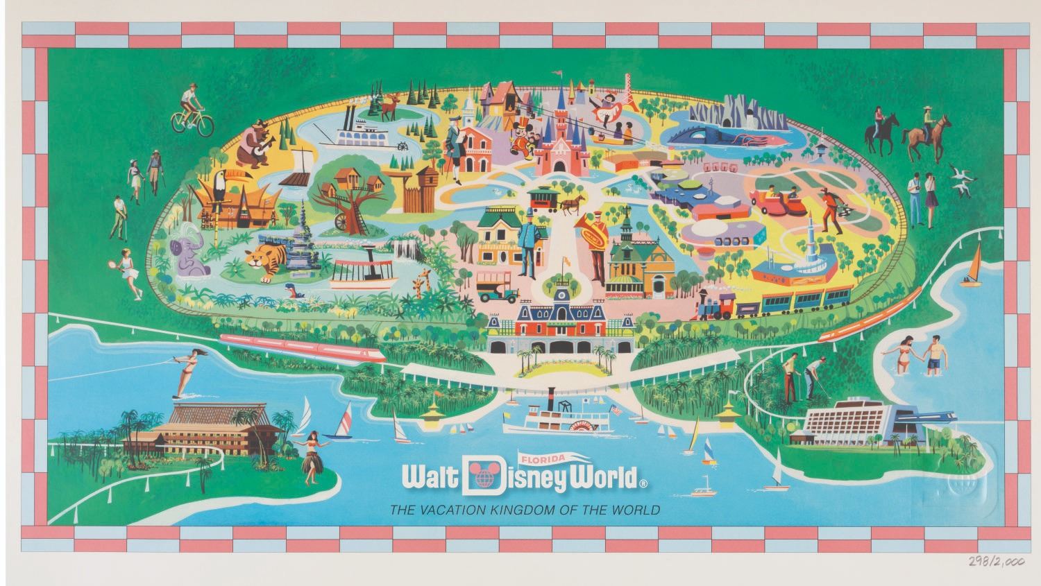 (Walt Disney World, 2011) A limited edition print released for the 40th anniversary of Walt Disney World. This print reproduces the very rare Preview Edition map that was sold at the Walt Disney World Preview Center before the Park opened in 1971. Numbered 298/2,000 with a WDW40 imprint, the map measures 12” x 21” and is in very good condition with light edge wear, a .5” creased corner, and a few very small smudges in the border.
