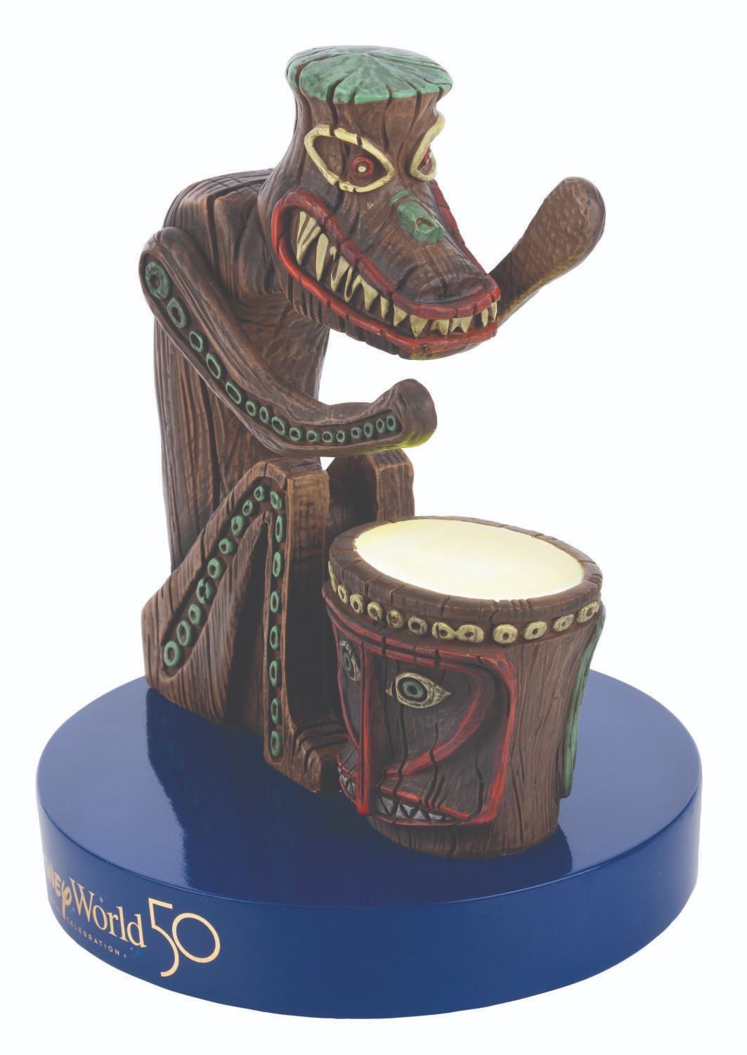 (Walt Disney World, 2021) A Walt Disney World Tiki Drummer Medium Figure. The figural statue was based on the original concepts of Marc Davis, designed by Disney Artist Costa Alavezos, features wind-up musical and battery-operated illuminating elements, and issued for the "Walt Disney World 50: The World's Most Magical Celebration." Measuring 11.75" tall and 8.25" in diameter, the statue is in fine working condition in its original box.