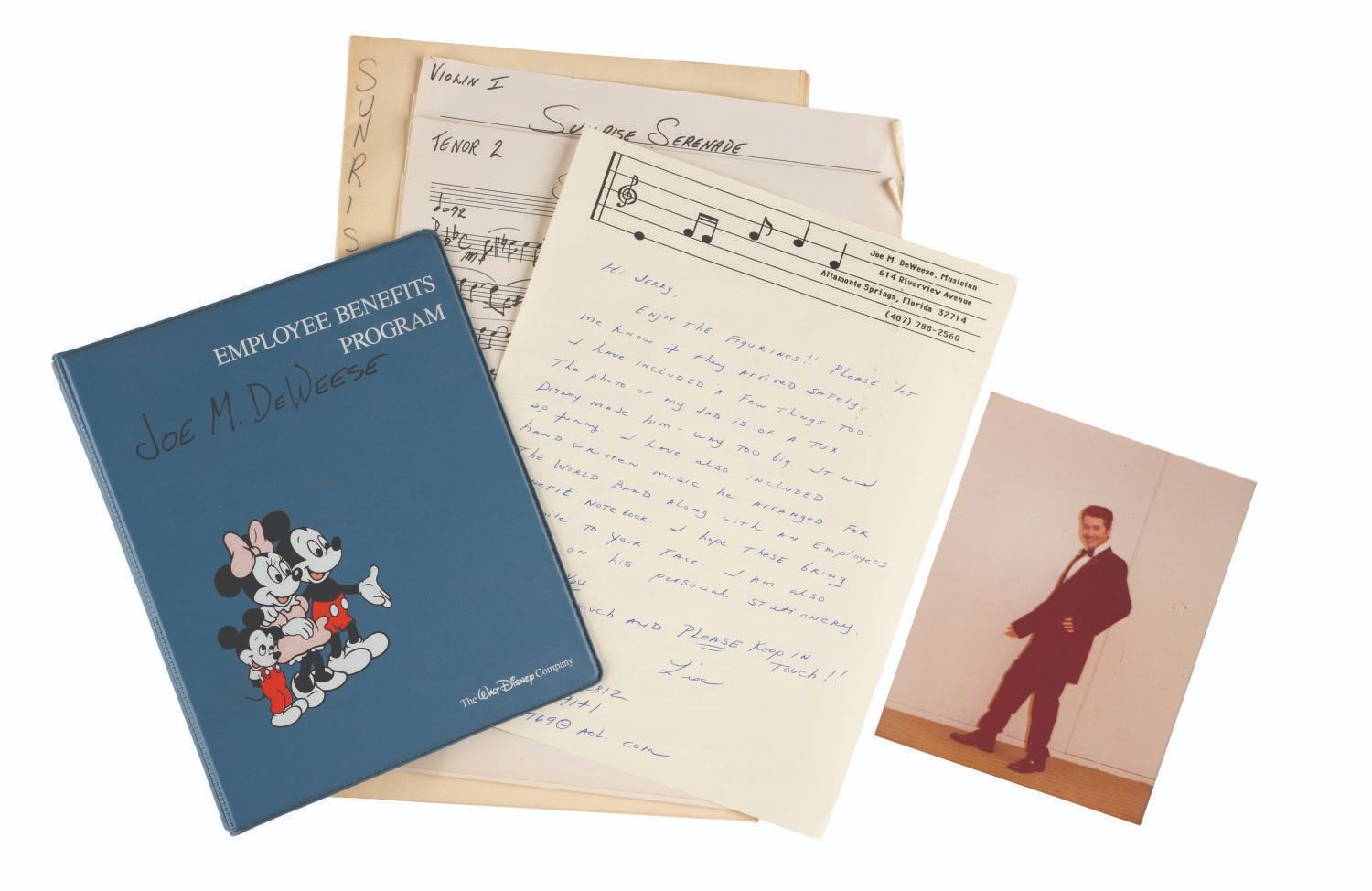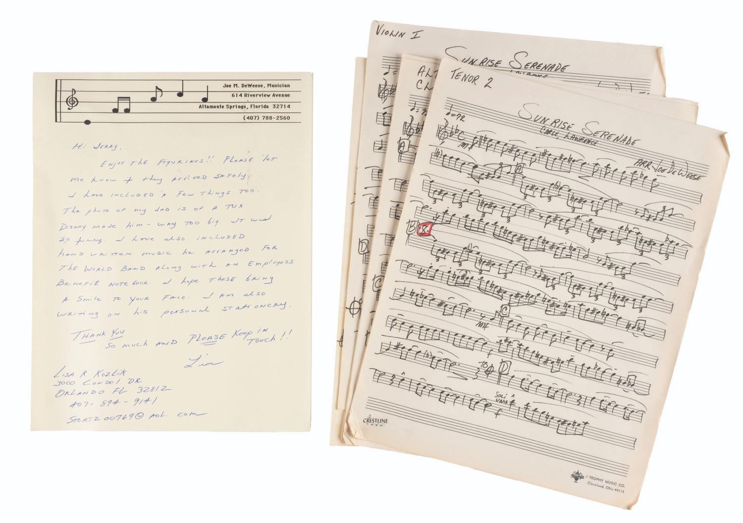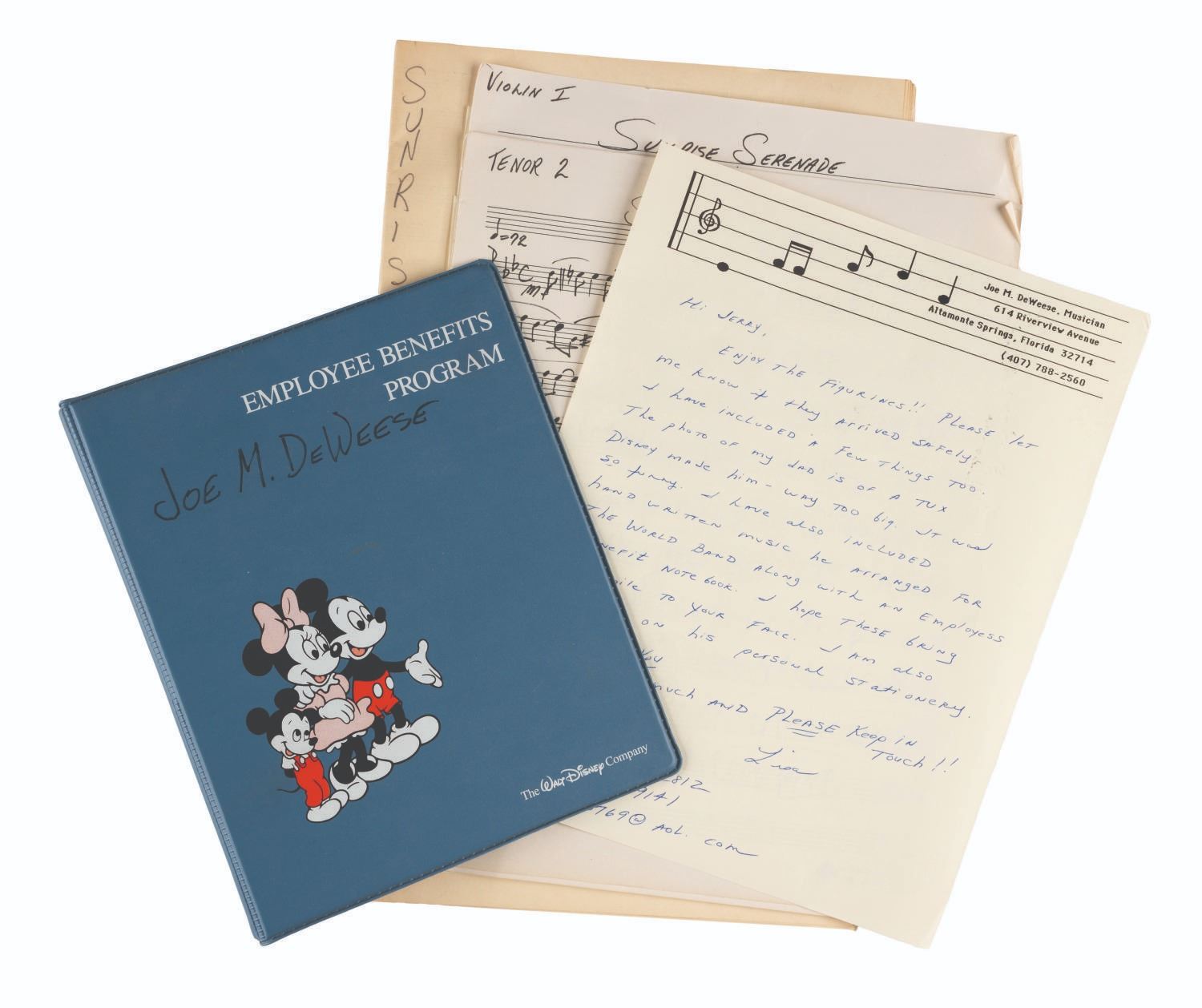 (Walt Disney World, 1980s-90s) An original arrangement of Glen Miller's "Sunrise Serenade" created for the Walt Disney World Band. Musician Joe M. DeWeese hand-wrote this arrangement with sheets for Tenor 2, Violin 1, and the full arrangement. This lot also includes DeWeese's Disney Employee Benefits binder cover with his name written on the front. The sheet music measuring up to 14" x 17" open is accomplished in pencil and felt tip, and in very good production-used condition. The 9" x 7" binder is in very good condition.