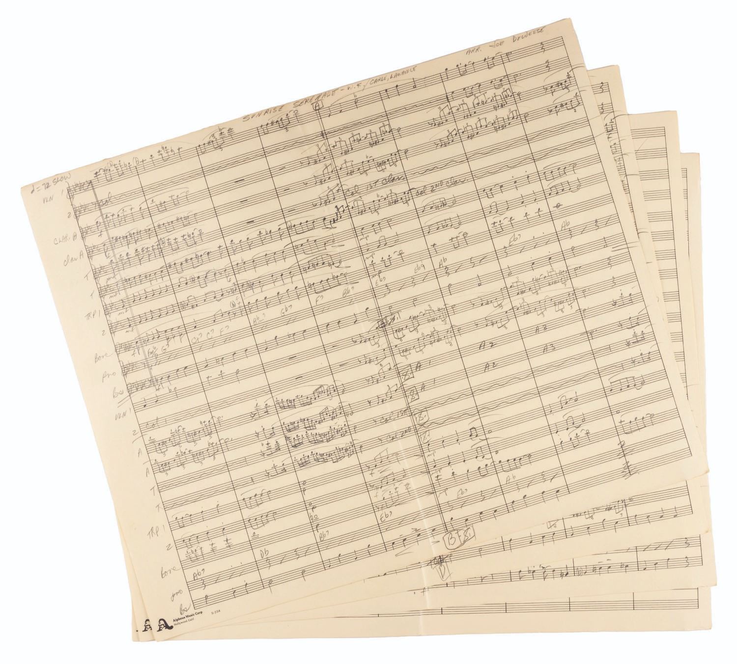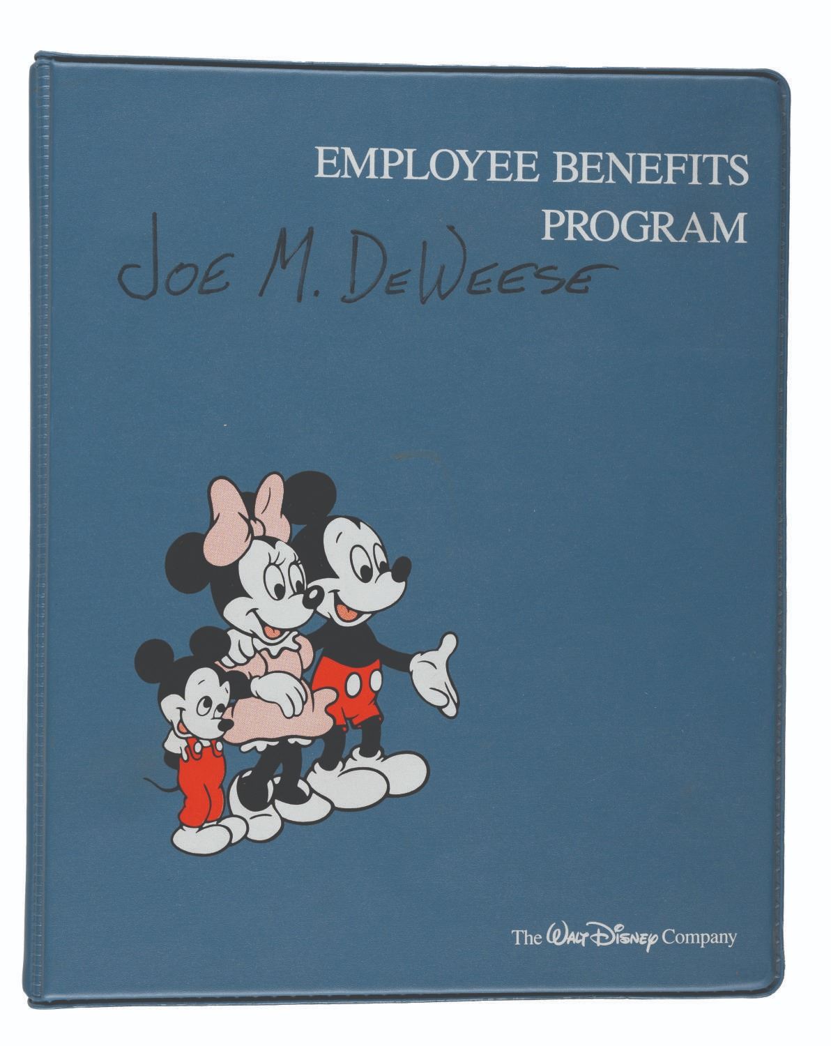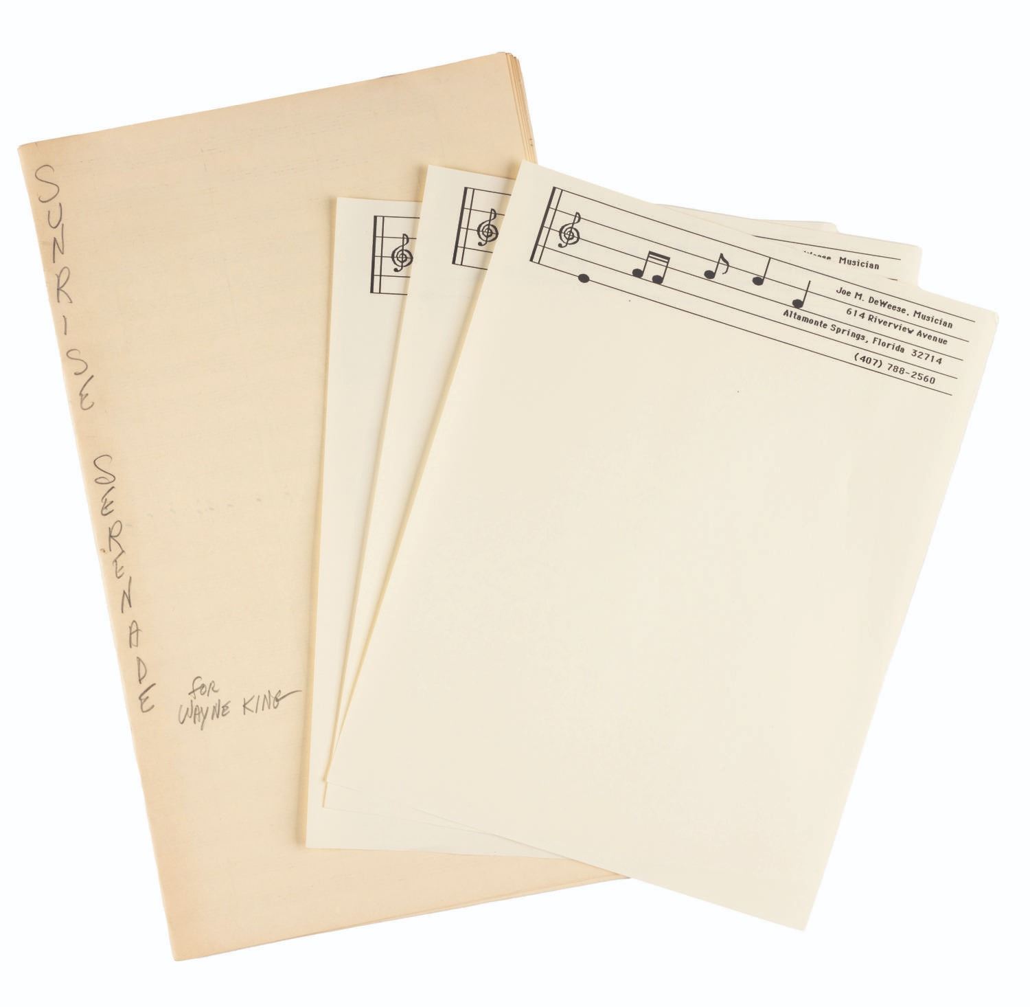 (Walt Disney World, 1980s-90s) An original arrangement of Glen Miller's "Sunrise Serenade" created for the Walt Disney World Band. Musician Joe M. DeWeese hand-wrote this arrangement with sheets for Tenor 2, Violin 1, and the full arrangement. This lot also includes DeWeese's Disney Employee Benefits binder cover with his name written on the front. The sheet music measuring up to 14" x 17" open is accomplished in pencil and felt tip, and in very good production-used condition. The 9" x 7" binder is in very good condition.