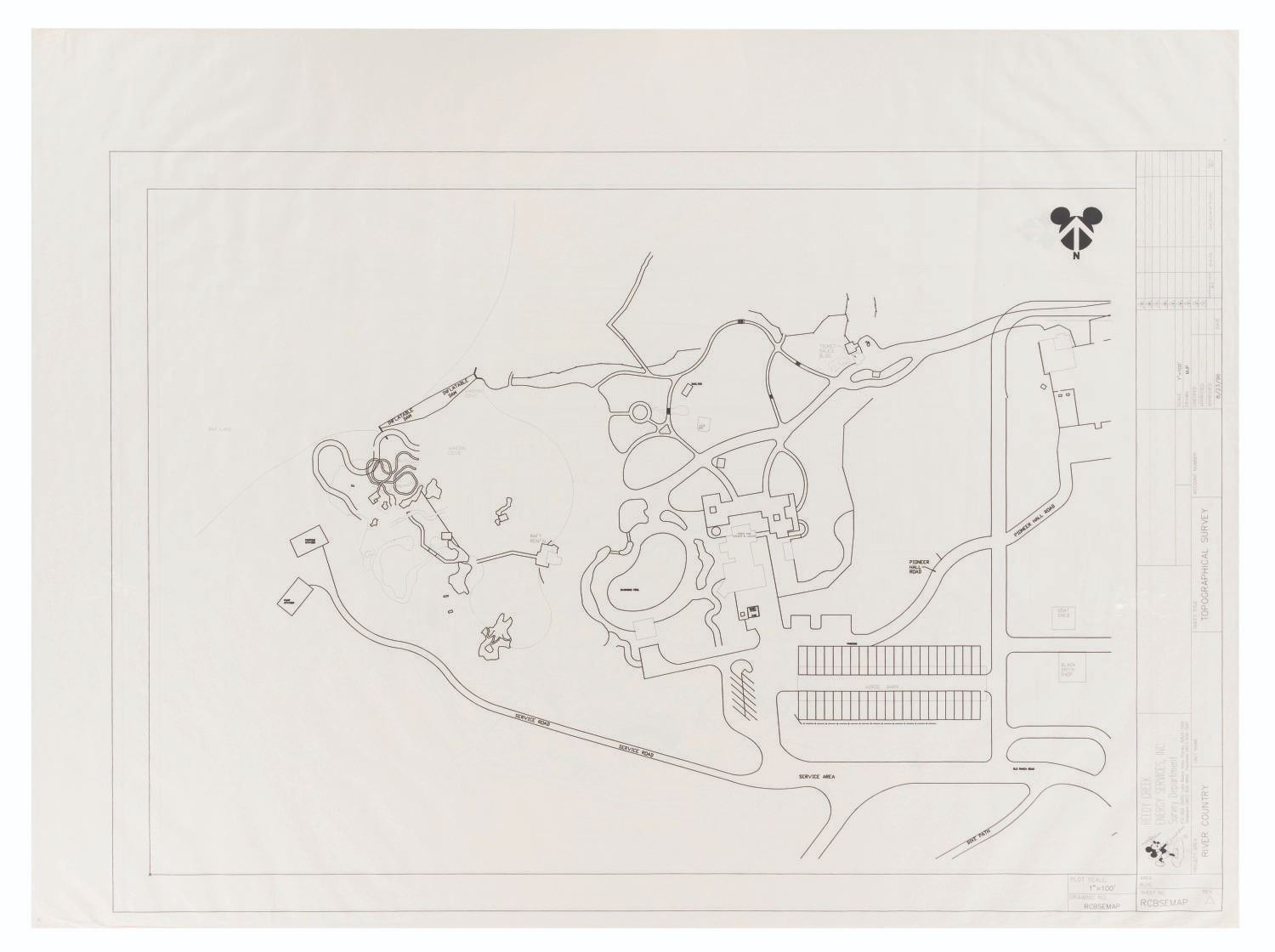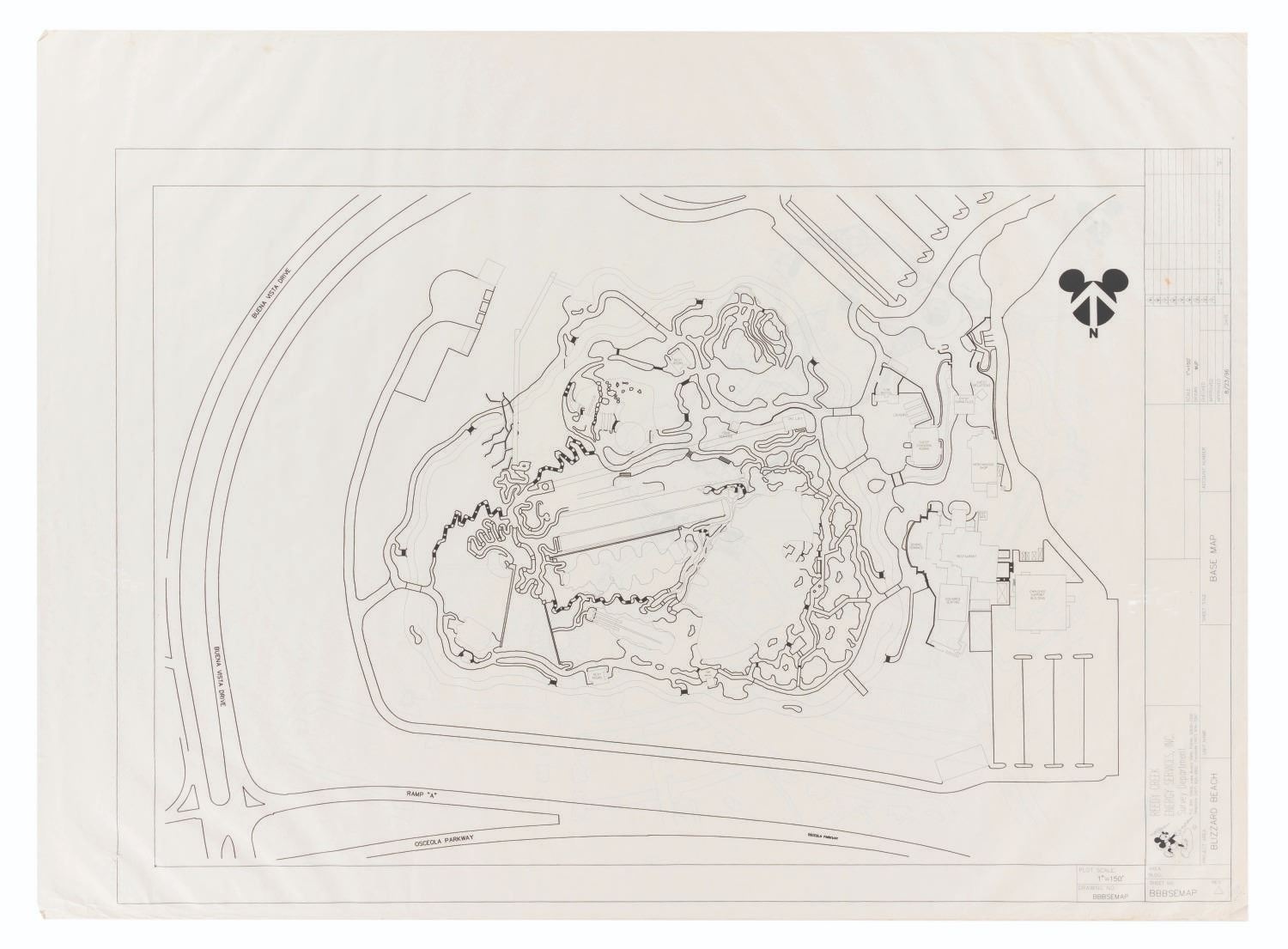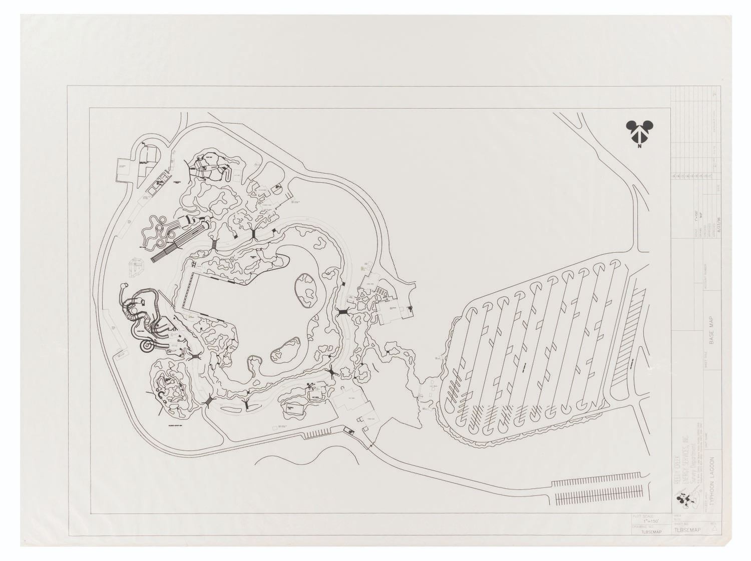 (Walt Disney World, 1996) A collection of six large blueprint plans of Walt Disney World. Among the survey blueprints are base maps and a topographical survey produced for Reedy Creek Energy Services, each depicting areas including the Magic Kingdom, Studio Tour, Typhoon Lagoon, Pleasure Island, River Country, and Blizzard Beach. Measuring 36" x 48" each, the blueprints are in good condition with light tears, creases, and wear.