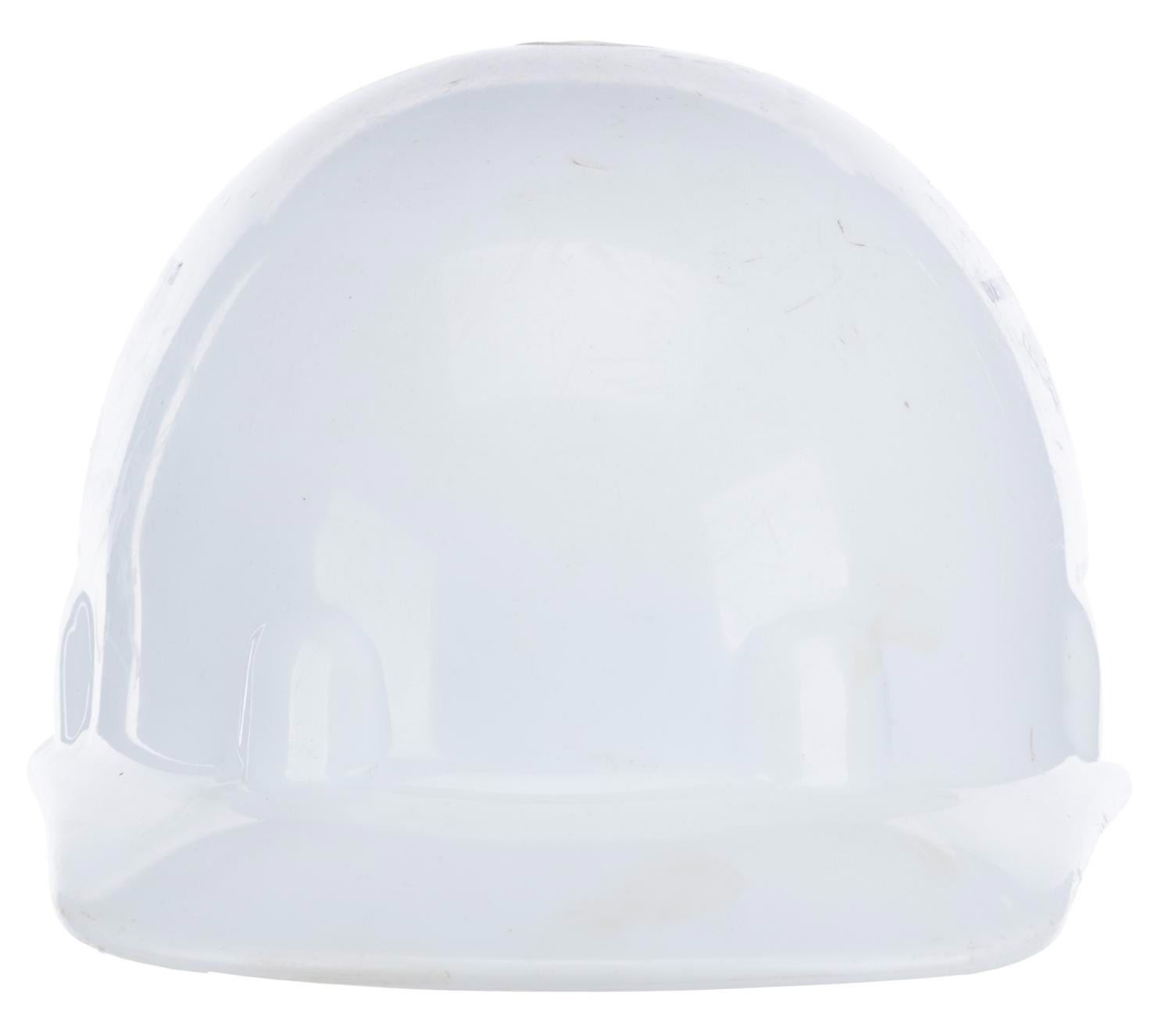 (Walt Disney World, 1970) A Buena Vista Construction Co. hard hat from construction of Walt Disney World. Measuring 8” x 11.5” x 6” tall with a 6” x 7.5” head opening, the hard hat is in good condition with typical scrapes, scuffs, stains, wear, and image loss from construction use.