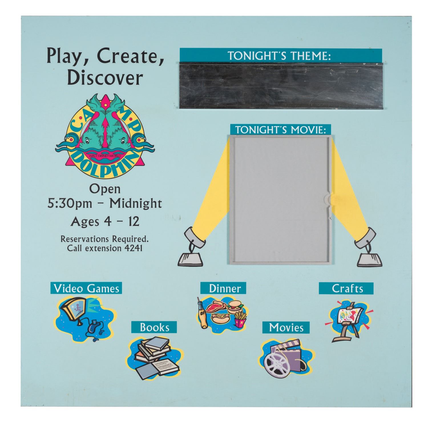 (Disney Dolphin Hotel, 2000s) A Camp Dolphin sign from the Disney Dolphin Hotel at Walt Disney World. The sign contains interchangeable marquee spots for activities, themes and movies featured at the club created exclusively for kids. Measuring 34.75"x34.75", the sign is in very good overall condition, despite slight scuffs from Resort use.