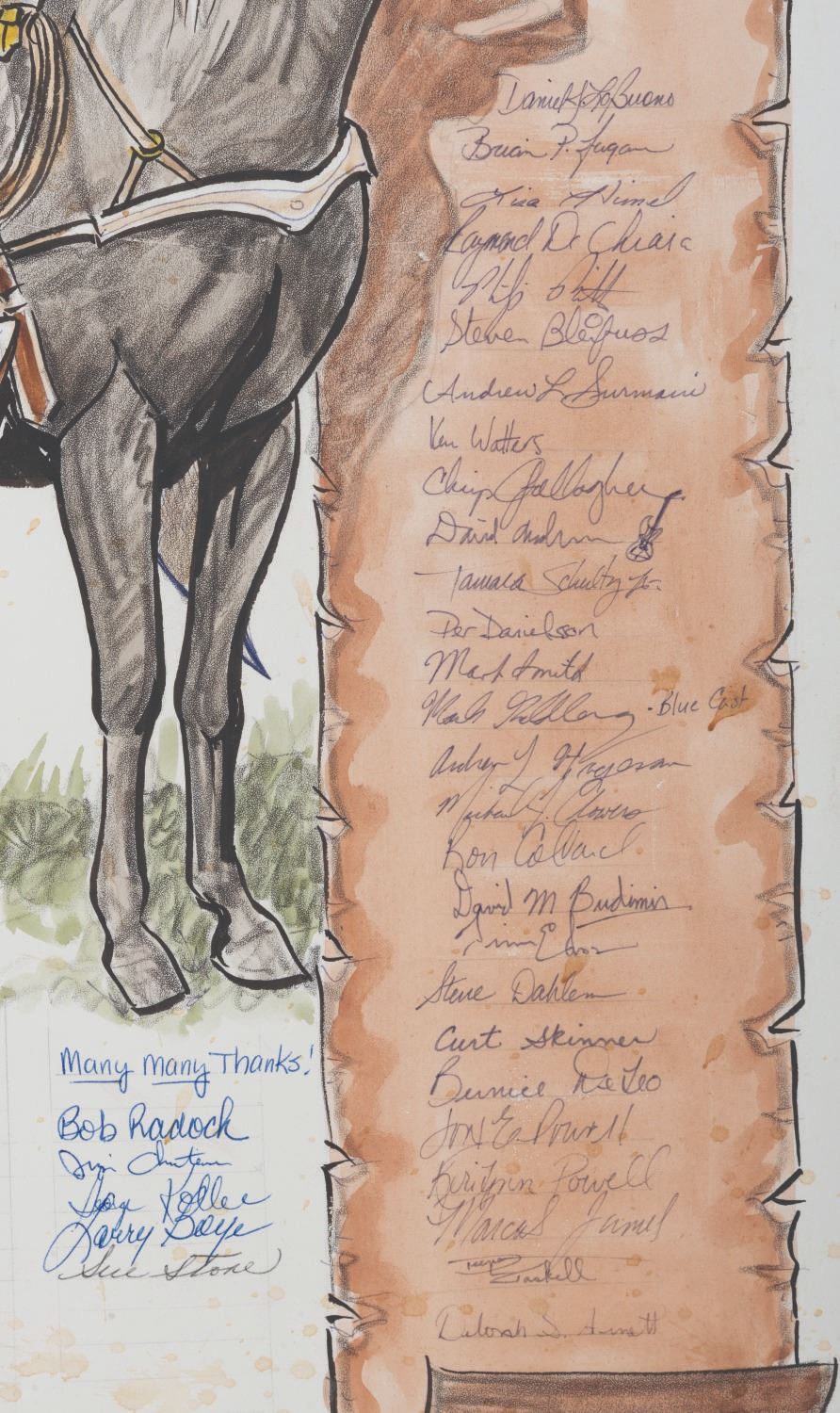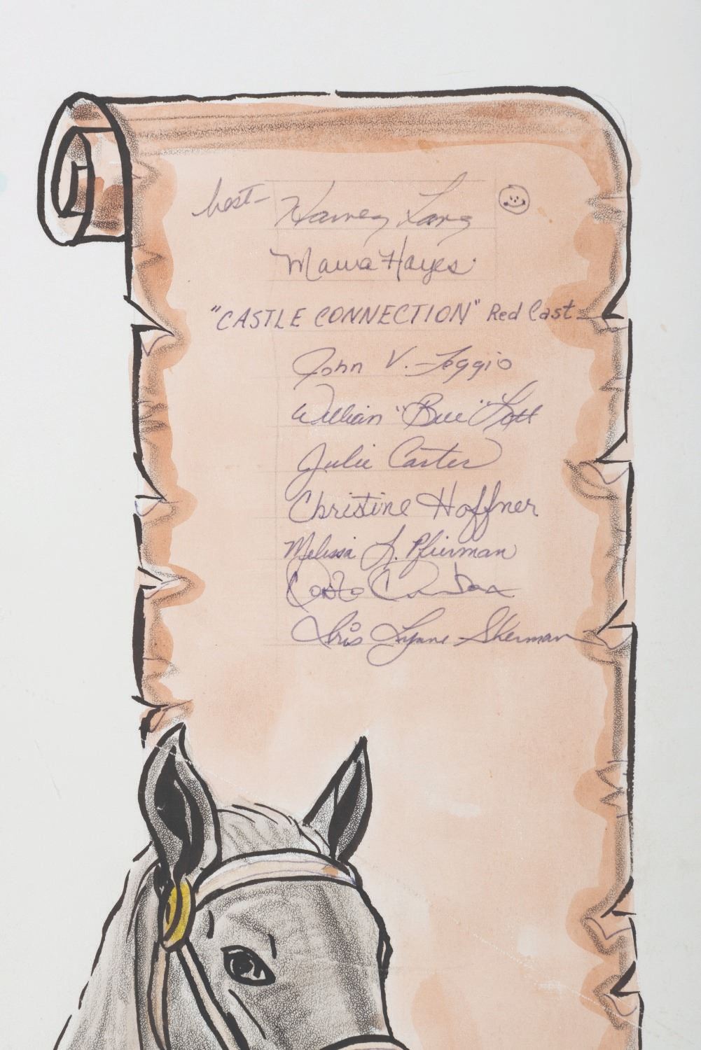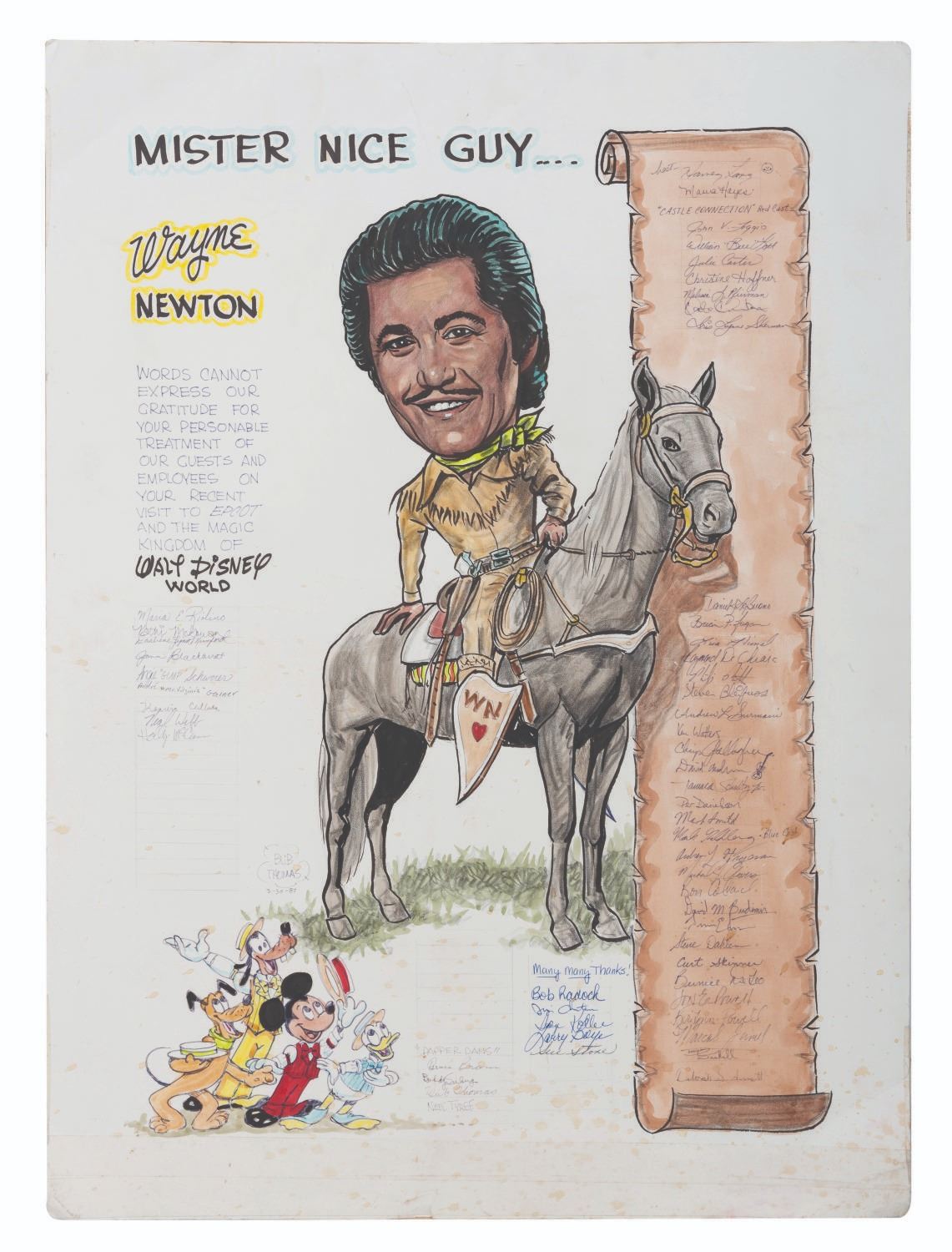 (Walt Disney World/EPCOT, 1987) A large hand-drawn card of Wayne Newton on horseback with Mickey and friends, signed by Walt Disney World and EPCOT Cast Members in appreciation of his “personable treatment of our Guests and employees” while performing at the Magic Kingdom. The card is signed by both the Dapper Dans singing group and “The Castle Connection,” a rock group who performed at the Parks. A barcode on the back identifies the card as coming from the Wayne Newton Museum collection. Measuring 22” x 30”, the card is accomplished in marker and displays in good condition, with wear overall including tape residue, scratches, scuffs, and a spray of light spotting mostly across the lower half.