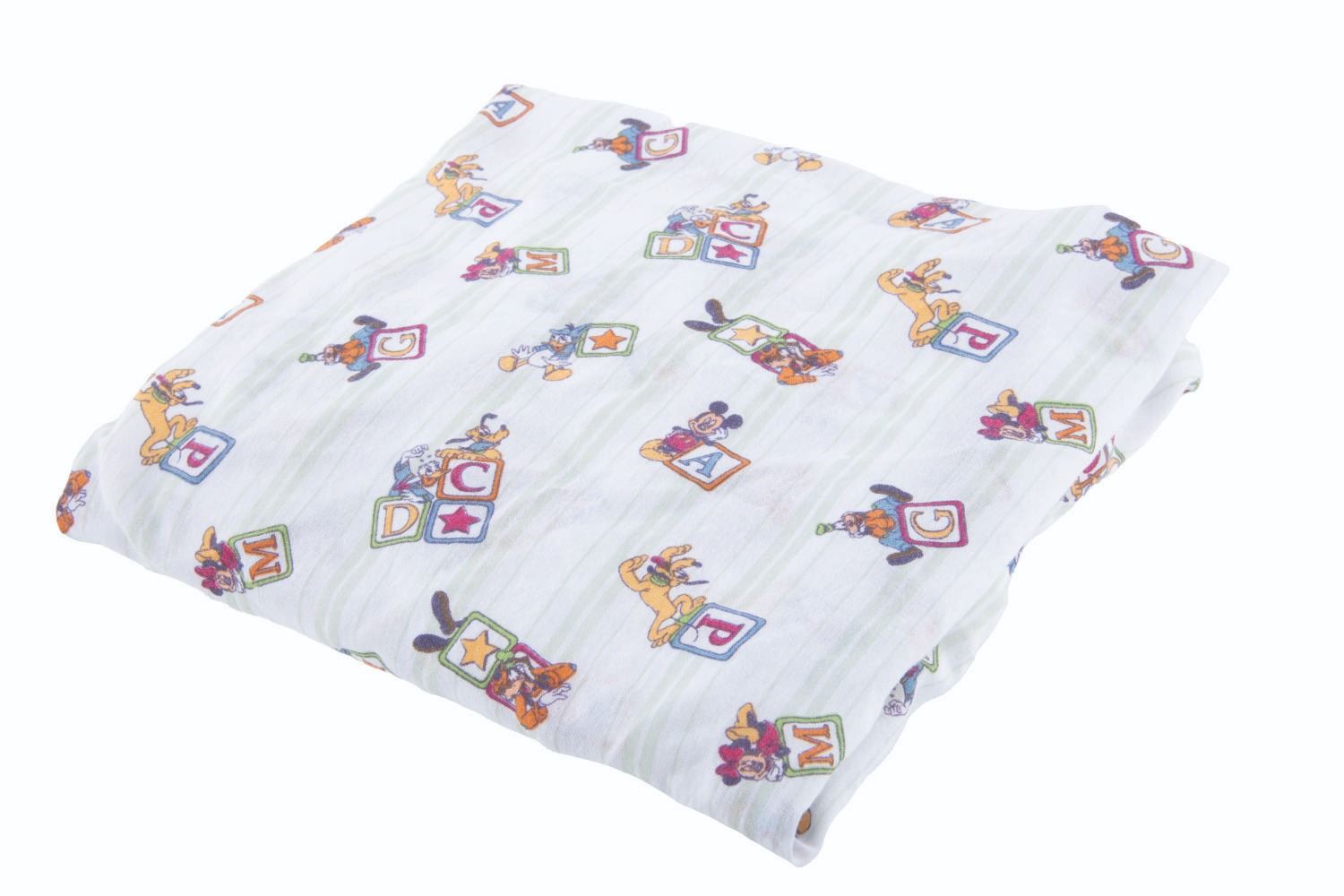 (Walt Disney World, 1970s-90s) A Fab Five and ABC block pattern crib sheet, used at changing stations across the Resort. Measuring 28” x 43”, the crib sheet is in good condition with color fading and wear.