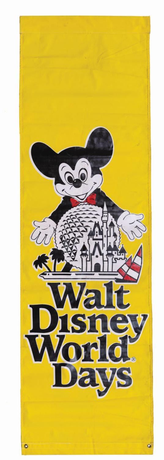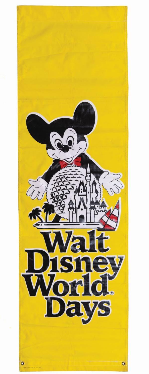 (Walt Disney World, 1980s) A large Walt Disney World Days banner featuring Mickey Mouse, Cinderella Castle, and Spaceship Earth. Measuring 29" x 94", the banner is in good condition with soiling, scuffs, scratches, and wear from Resort use.