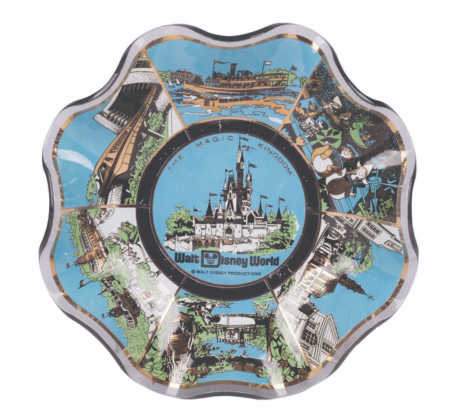 (Walt Disney World, 1970s) A ruffled glass Walt Disney World souvenir dish. Many versions of this dish were sold at Disneyland and Walt Disney World. Measuring 7.5" in diameter, this glass dish is in very good condition with light wear.