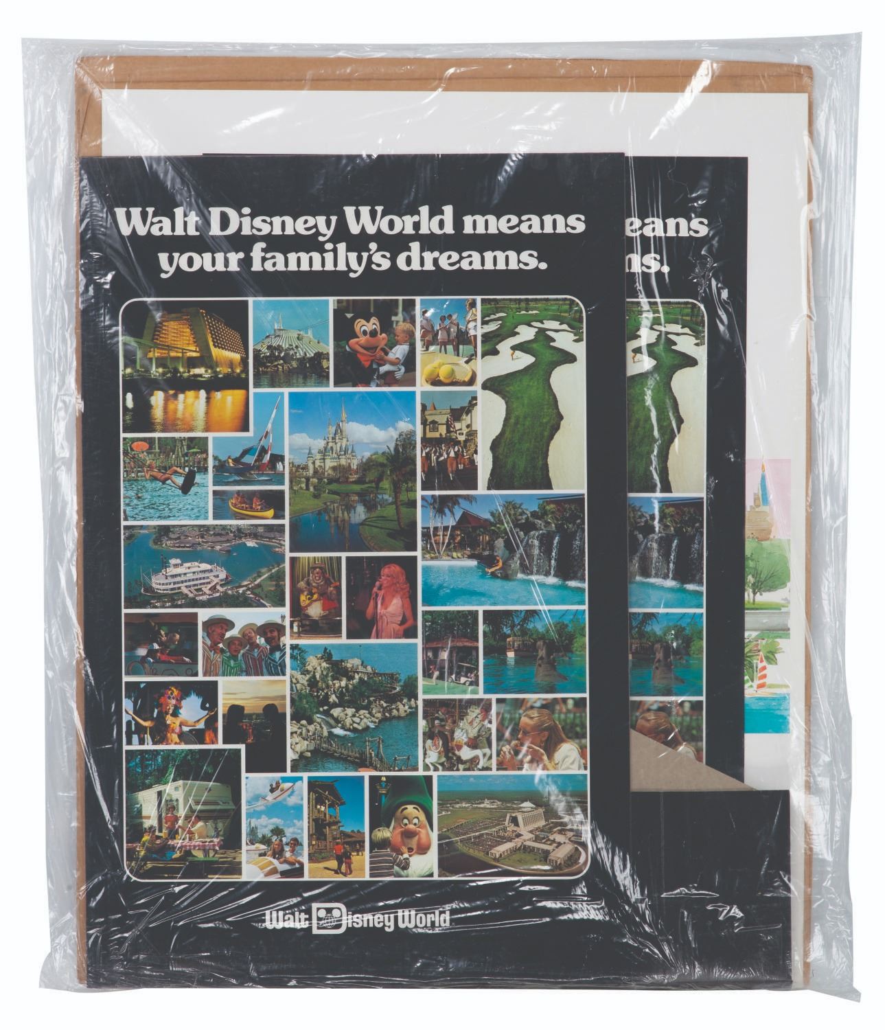 (Eastern Airlines, 1976) A promotional kit of lobby stands created for Eastern Airlines and Walt Disney World. Among the lot are an unknown number of unused posters and cardstock displays sealed in their original packaging. Measuring various sizes under 28.5" x 22.25", the pieces are in fine as-new condition.