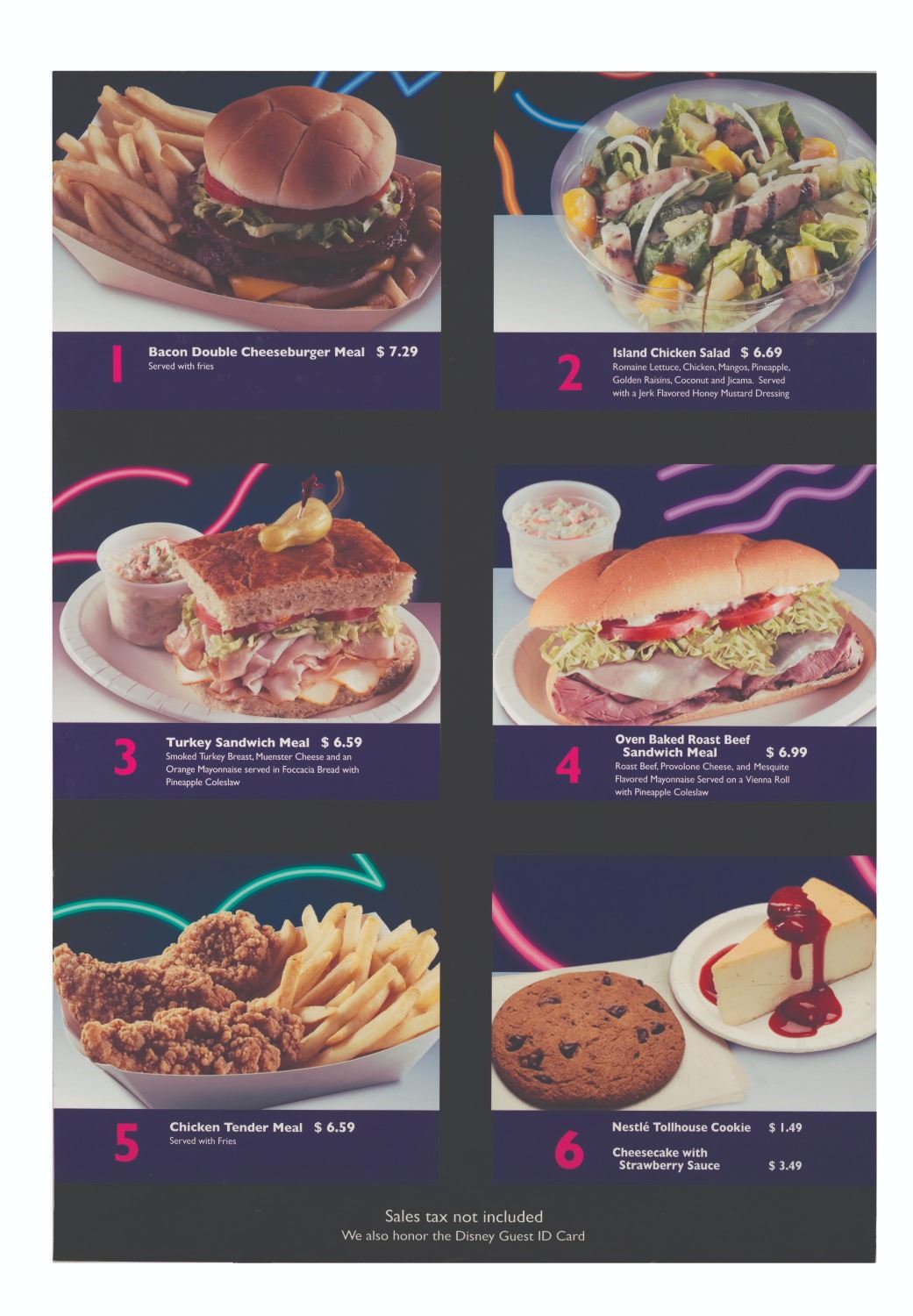 (Epcot, 1990s-2010s) An oversized menu sign from the Electric Umbrella restaurant, which closed on February 15, 2020. Located in Epcot’s Future World, the counter service restaurant dished out casual American cuisine to hungry Guests. Measuring 31.75” x 46”, the sign is in very good condition with indents and wear from Park use.