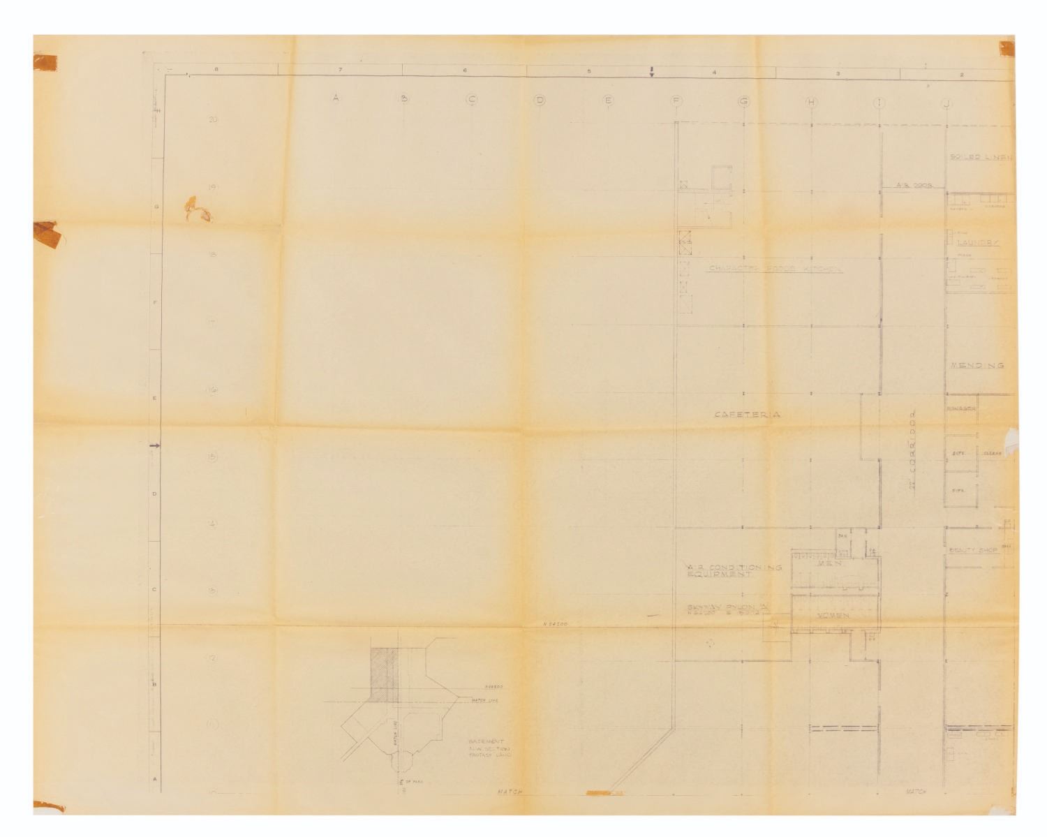 (Walt Disney World, 1960s) A Walt Disney World blueprint for the North-West section of the Fantasyland basement. The plans include space for a cafeteria, character foods kitchen, and laundry room. Measuring 34.5" x 43.5", the blueprint displays in good condition with pieces of tape on the corners and edges, discoloration along the edges and folds, stains, and creasing.