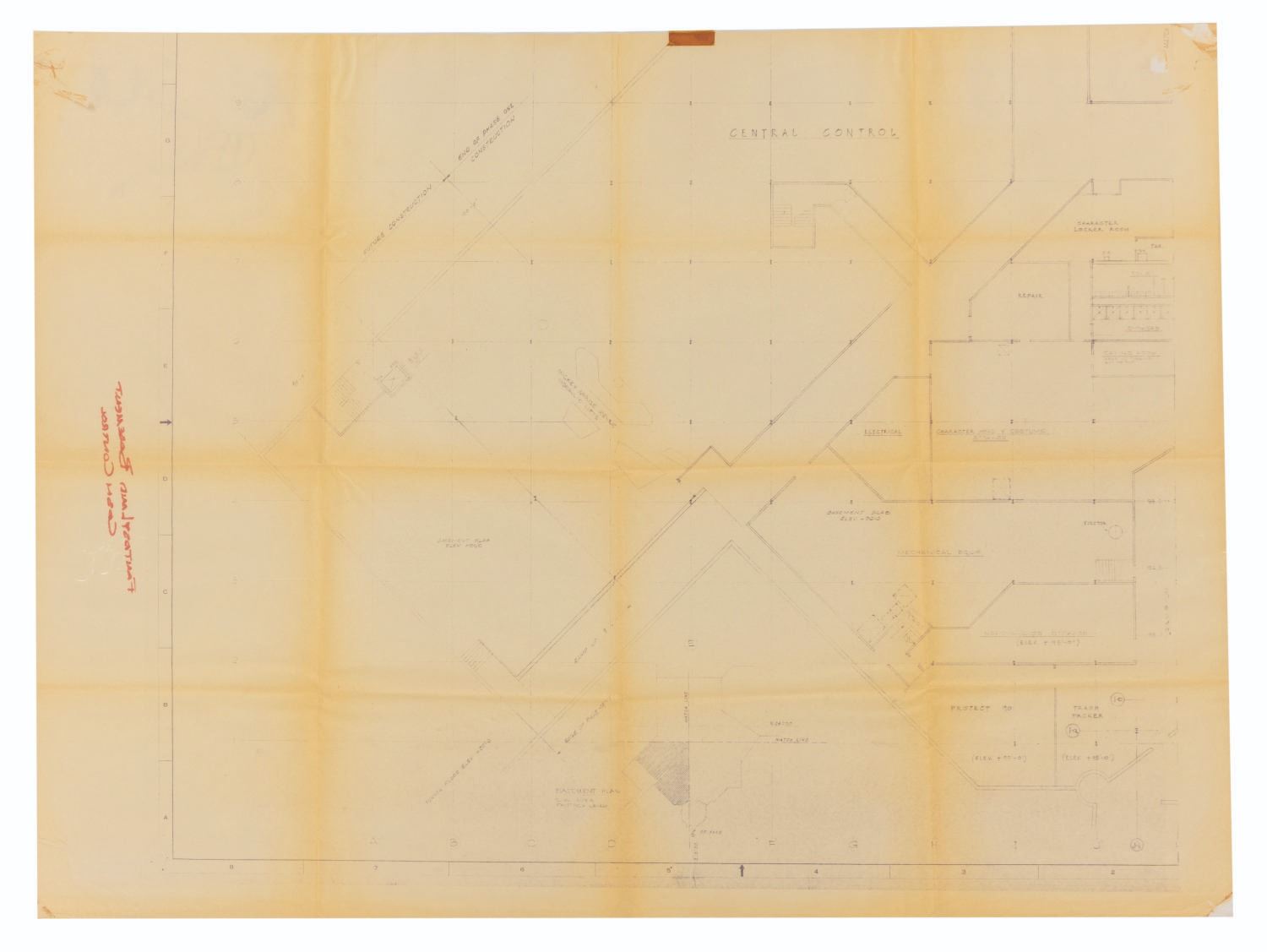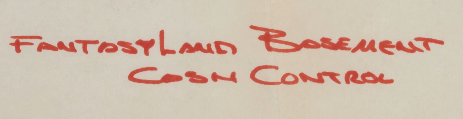 (Walt Disney World, 1960s) A Walt Disney World blueprint for the South-West section of the Fantasyland basement. The plans include space for Mickey Mouse Revue hydraulic lifts, merchandise storage, and character head and costumes storage. Measuring 34.5" x 45", the blueprint displays in good condition with pieces of tape in the corners and edges, discoloration along the edges and folds, stains, areas of surface loss to the top right corner, “Fantasyland Basement Cash Control" written in red ink on the reverse, and creasing.