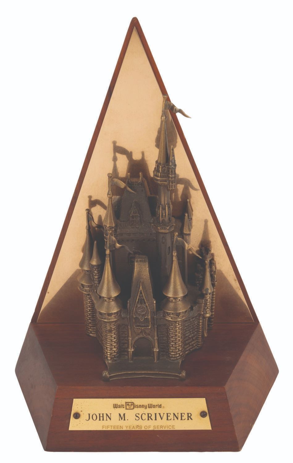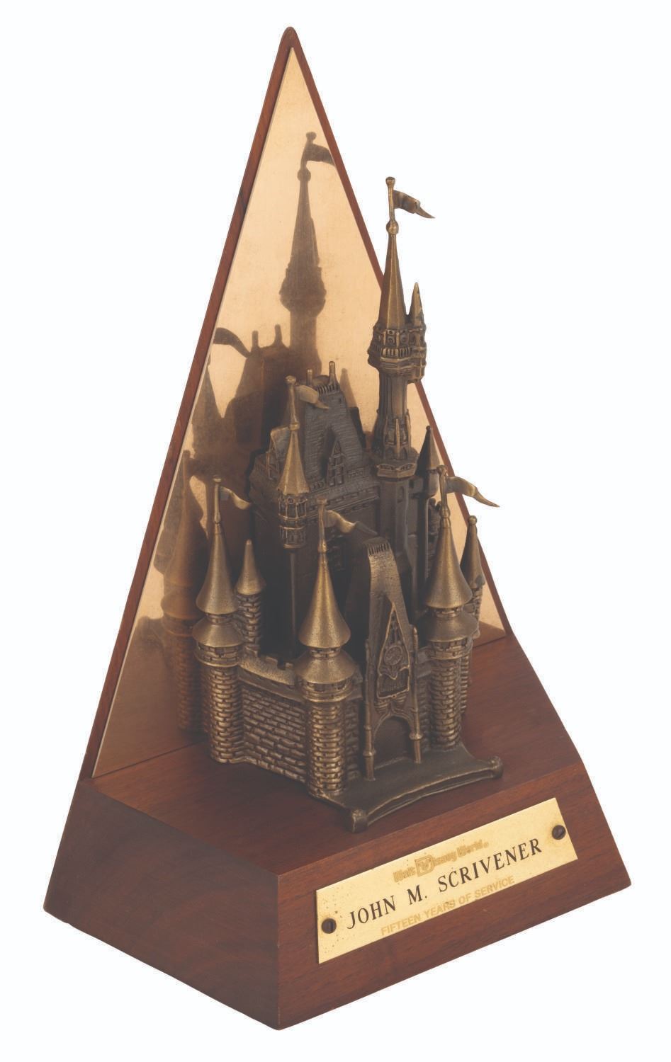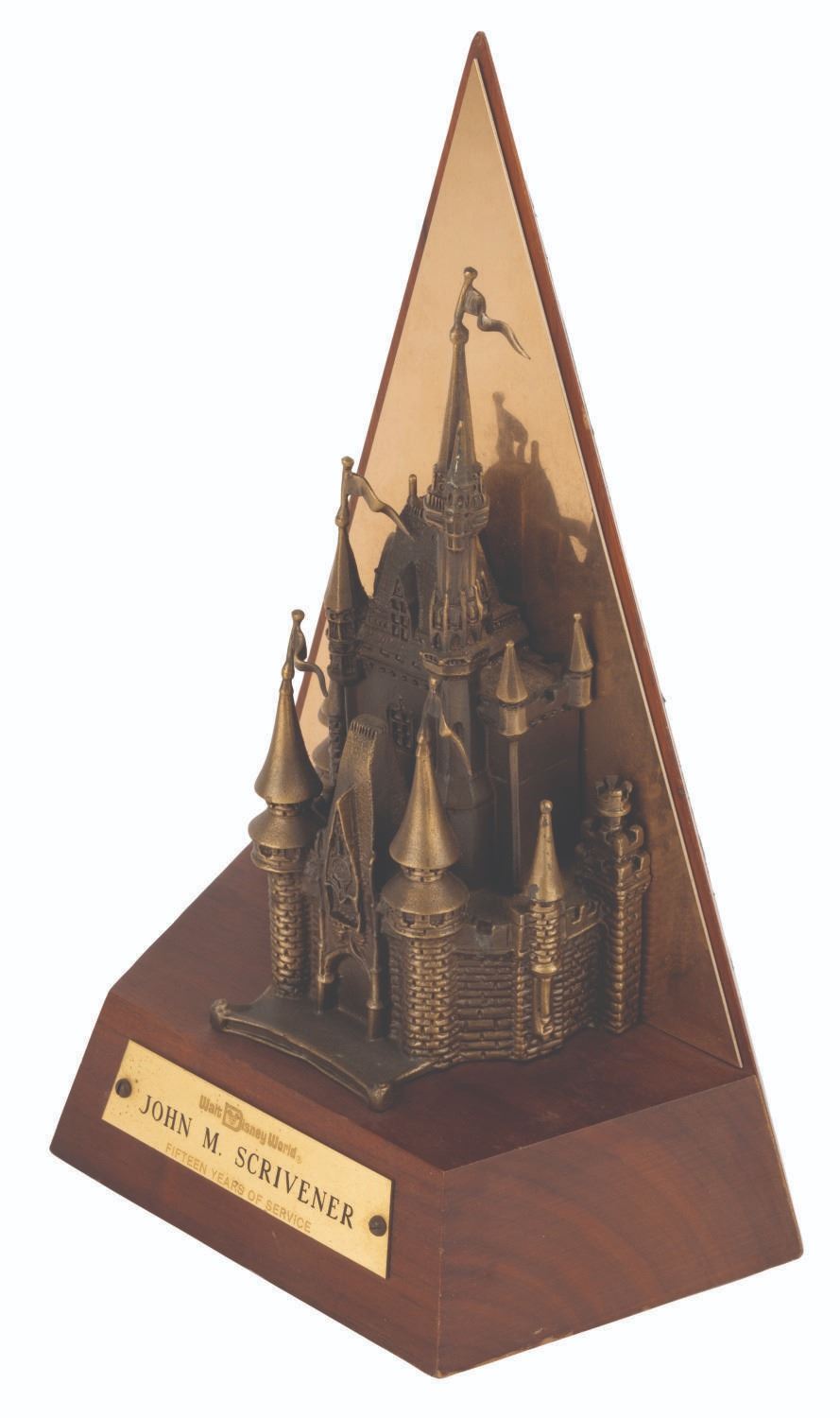 (Walt Disney World, 1980s-2000s) A rare award given to Walt Disney World Cast Members to honor fifteen years of service to The Walt Disney Company. This award features a metal figure of Cinderella Castle with a mirrored backing and wooden base. The nameplate reads, “John M. Scrivener, fifteen years of service.” Measuring 6.5” x 9”, the award is in very good condition with light oxidation, a 6.5” scratch on the reverse, smudges, and wear.