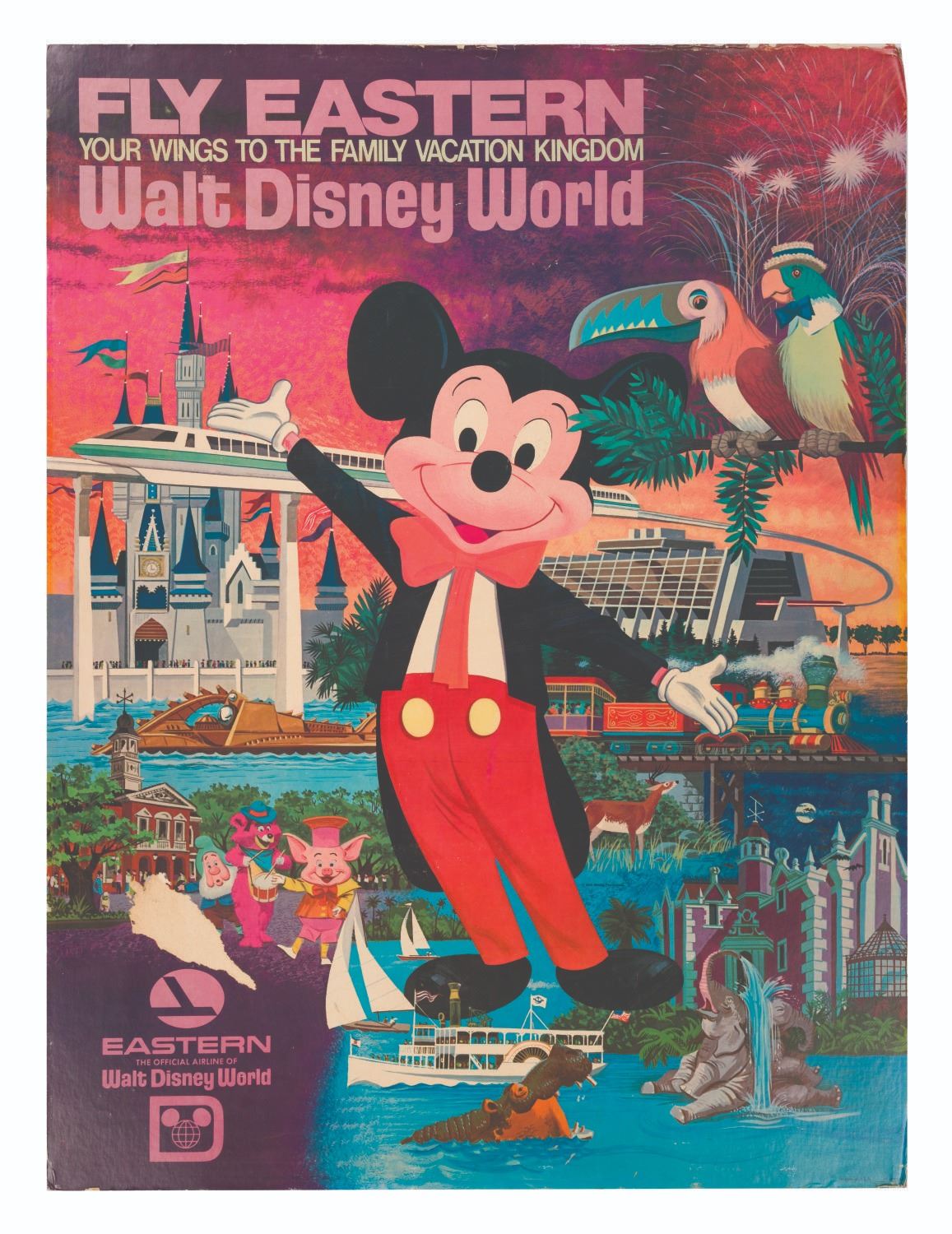 (Eastern Airlines, 1971) A rare travel poster from Eastern Airlines promoting the newly opened Walt Disney World. This beautifully printed poster promotes Eastern as "Your Wings to the Family Vacation Kingdom" and features Mickey Mouse with Walt Disney World landmarks. Measuring 40"x29.75", the poster is mounted to heavy cardboard and is in fair condition with light fading, edge-wear especially to the top and bottom, and a 2.25” x 6” area of paper loss in the lower left corner above the Eastern logo.