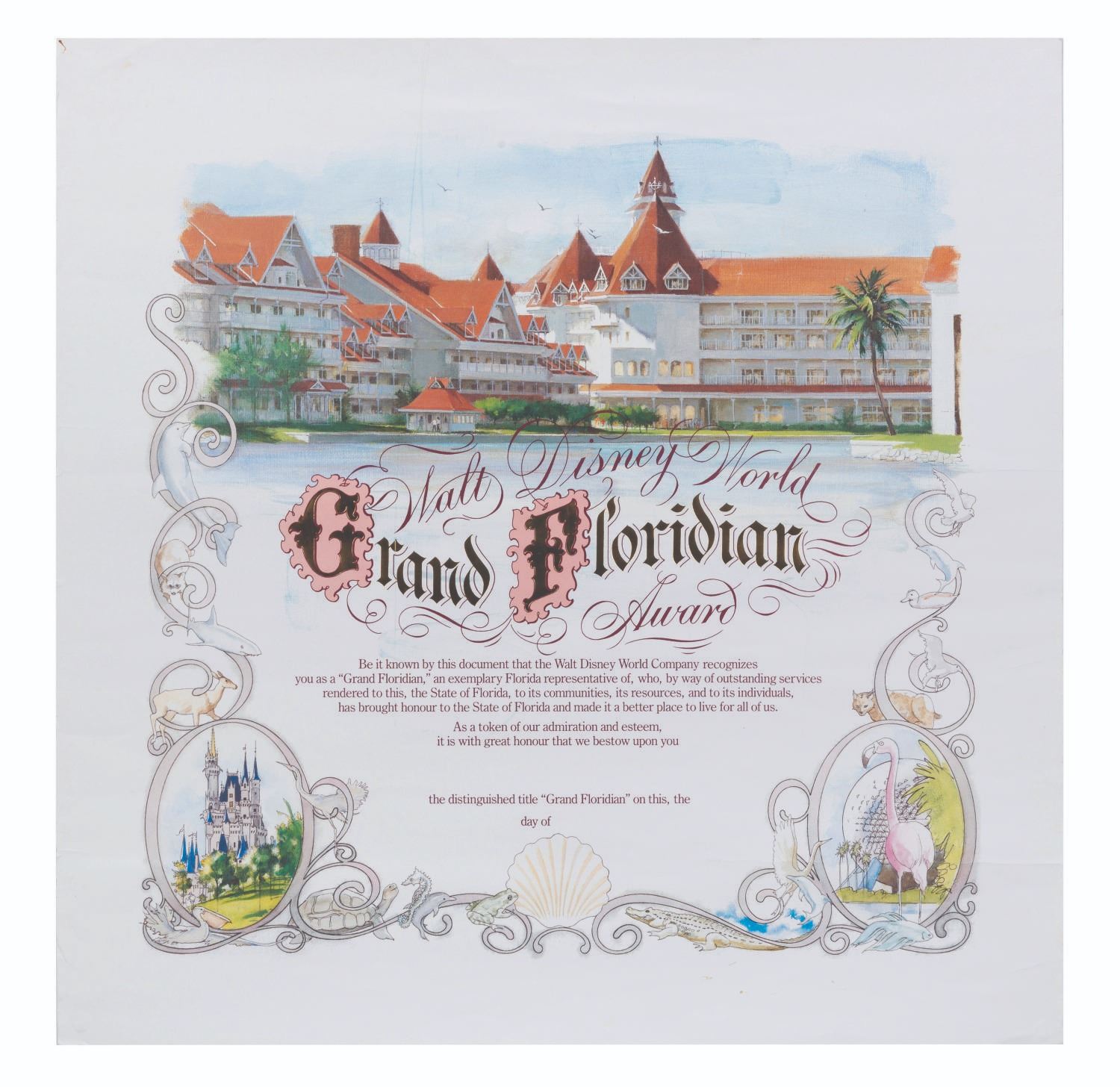 (Walt Disney World, 1988) A Walt Disney World Grand Floridian Award certificate, naming the recipient as a "Grand Floridian" in recognition of outstanding services rendered to Florida, its communities, and individuals. This award was given to Cast Members for landmark service and noted VIPs such as John Glenn. Measuring 19.5" x 19.5", the unused award certificate displays in good condition with edge wear, scuffs, and some creasing.