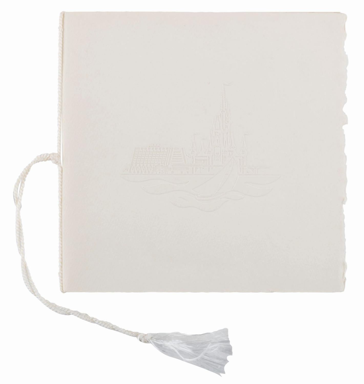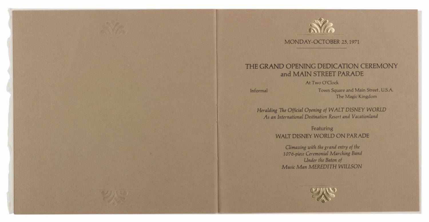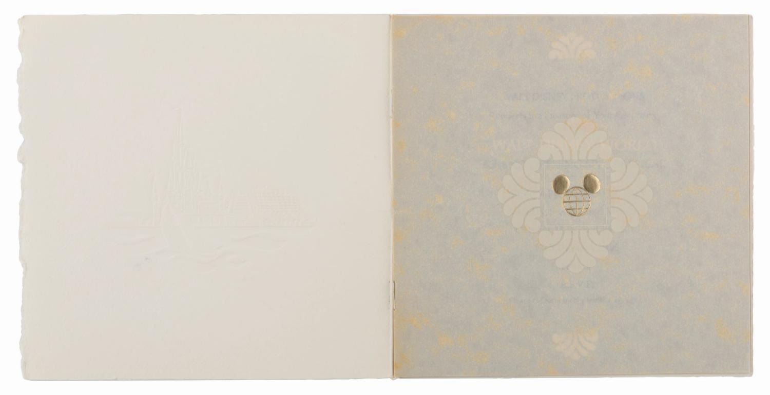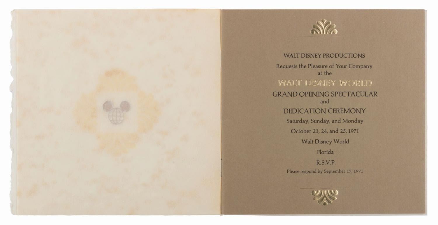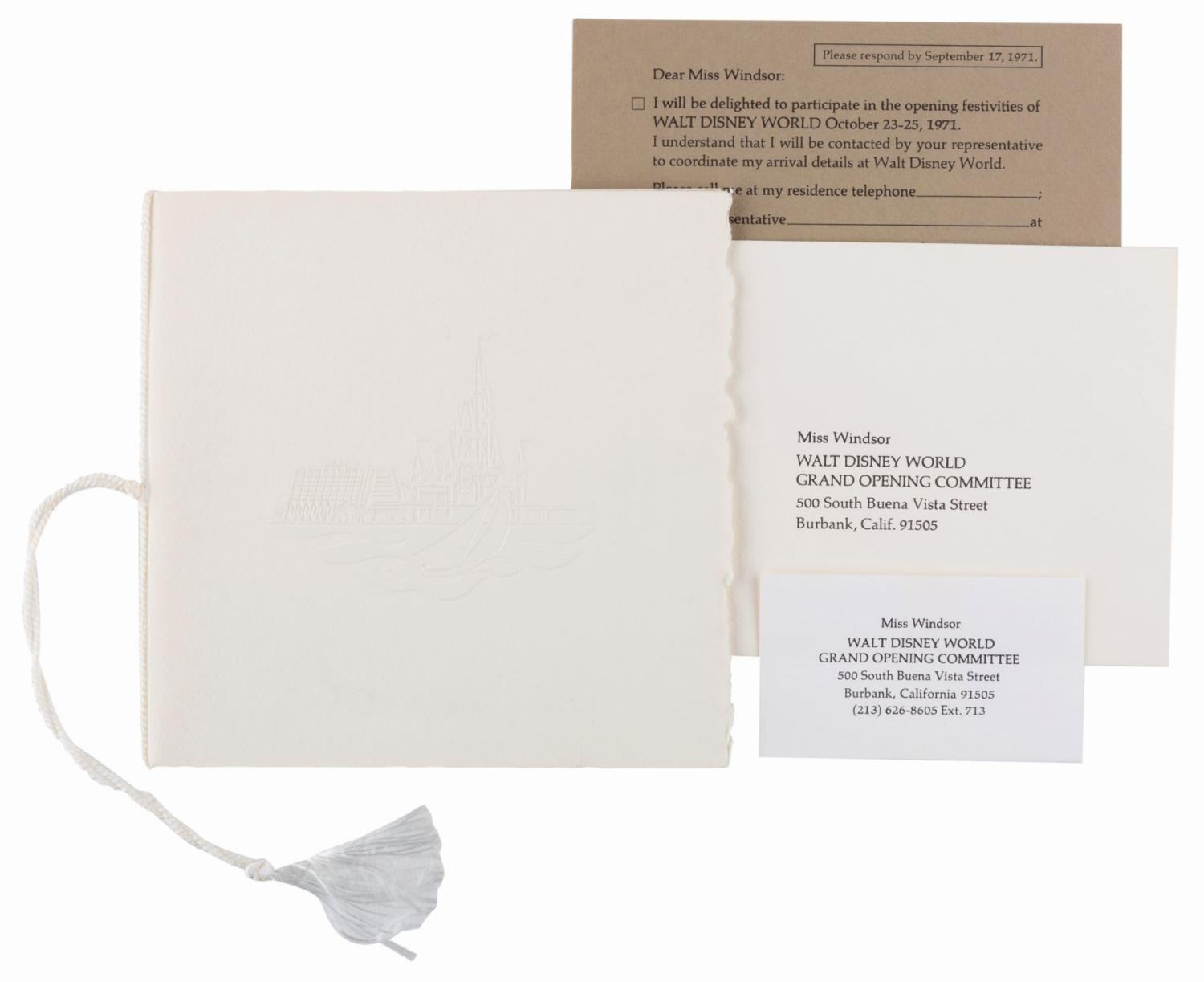 (Walt Disney World, 1971) An invitation and RSVP card for the Walt Disney World Grand Opening and Dedication Ceremony held from October 23 to 25th, 1971. The invitation features a beautiful embossed graphic of Cinderella Castle and the Contemporary Hotel on the cover, with each day's events described on separate pages within. Measuring 6.25" x 6.25" with an 8" tassel, the invitation is in fine condition.