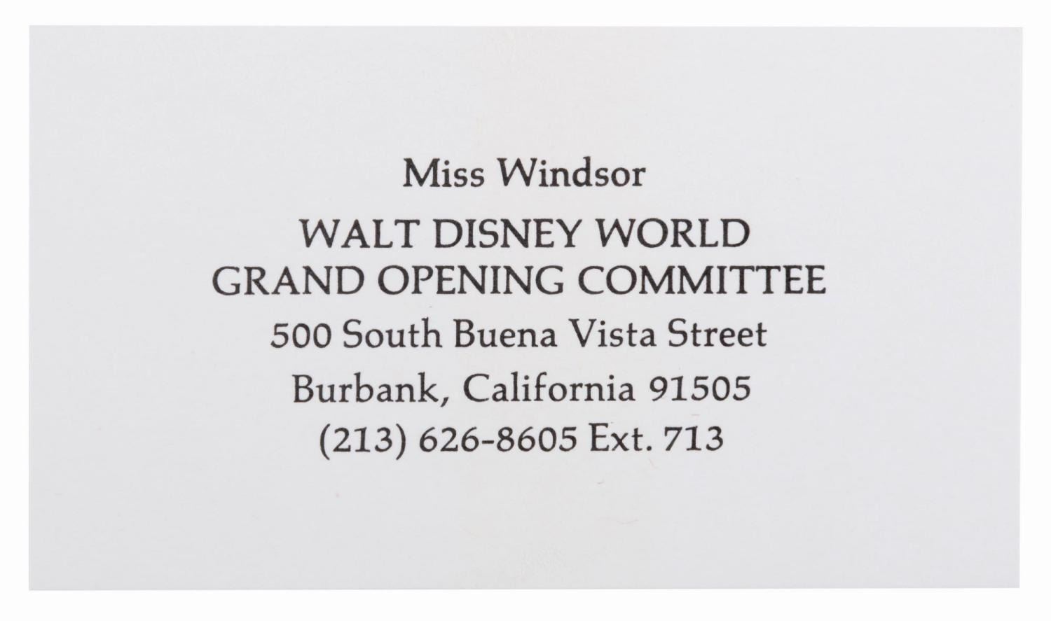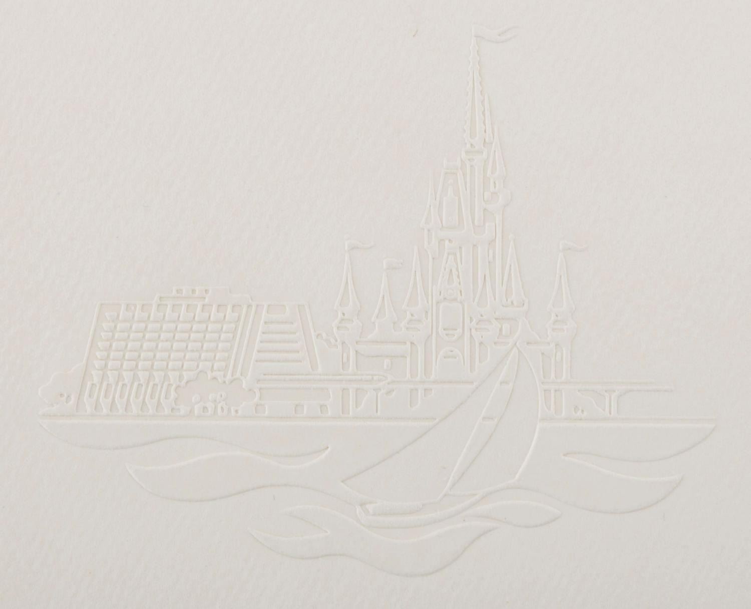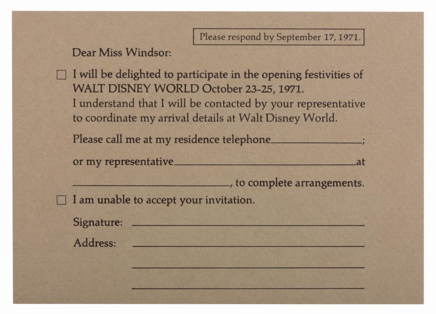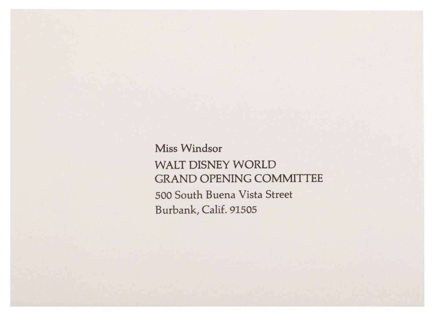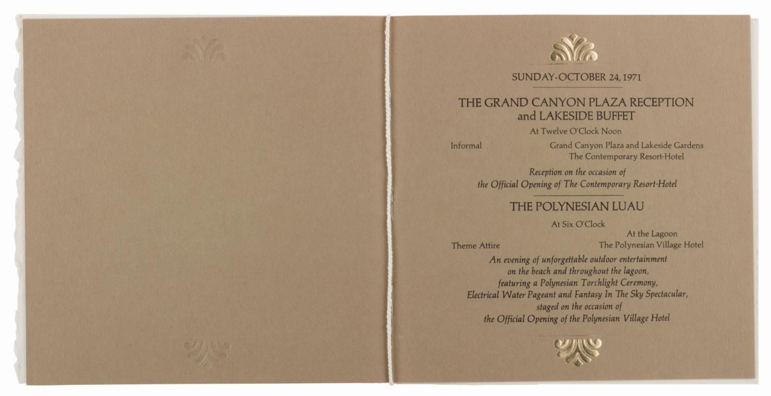 (Walt Disney World, 1971) An invitation and RSVP card for the Walt Disney World Grand Opening and Dedication Ceremony held from October 23 to 25th, 1971. The invitation features a beautiful embossed graphic of Cinderella Castle and the Contemporary Hotel on the cover, with each day's events described on separate pages within. Measuring 6.25" x 6.25" with an 8" tassel, the invitation is in fine condition.