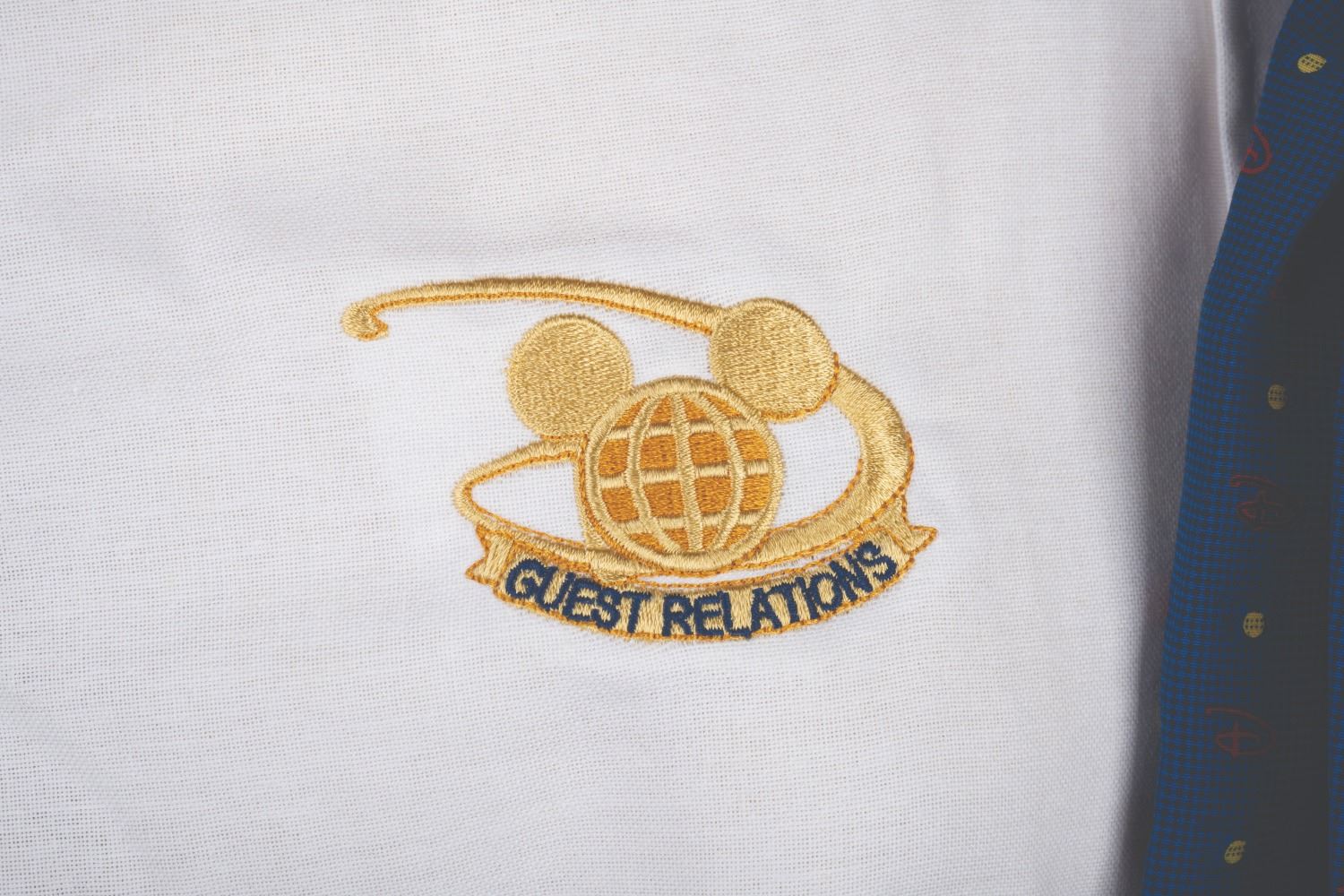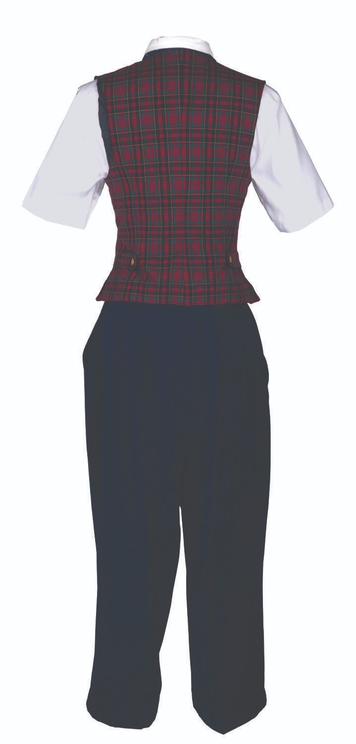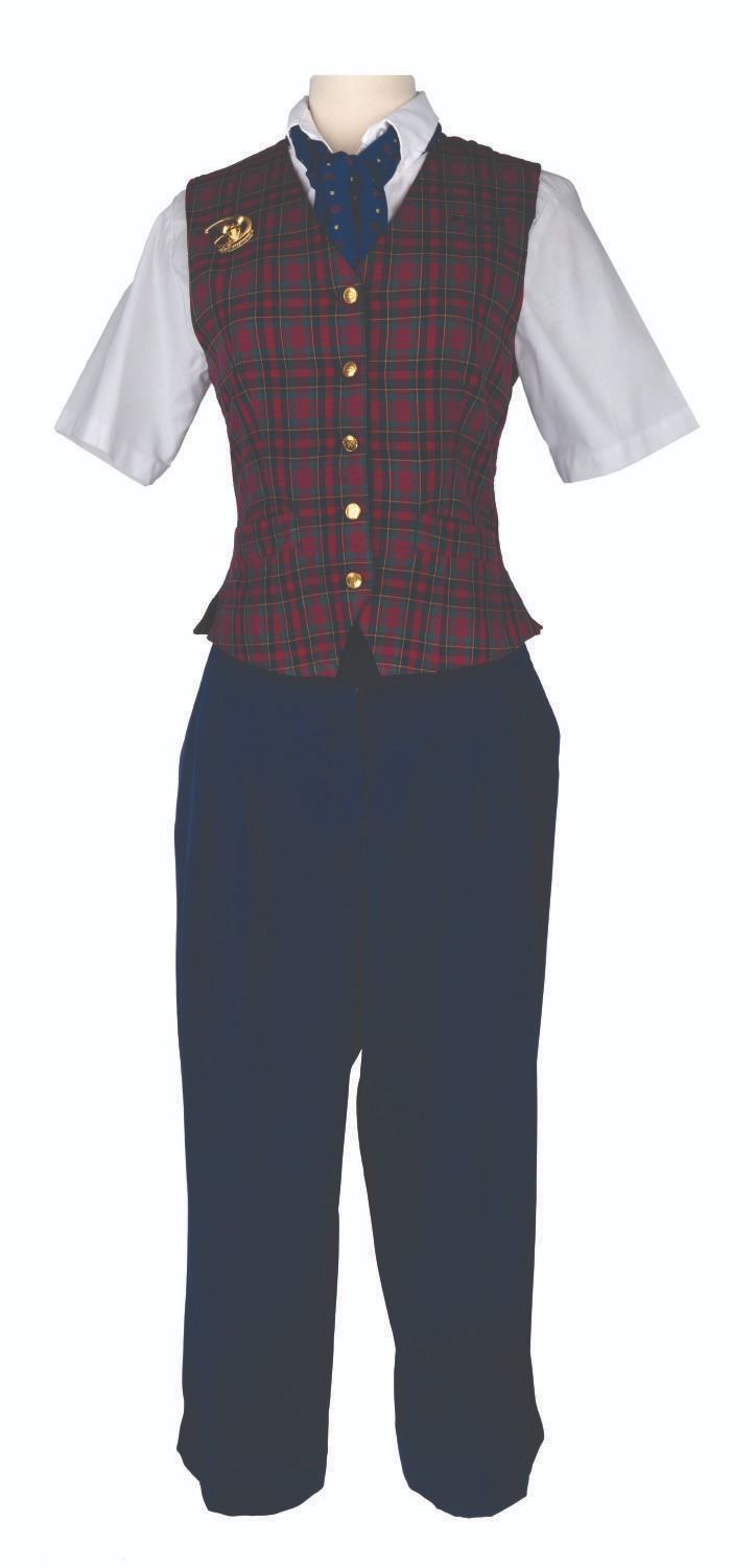 (Walt Disney World, 2000s) A costume worn by various Guest Relations Department Hostesses at Walt Disney World including a shirt, a pin, a vest from Disney-MGM Studios, and an ascot and pants from Epcot. The shirt measures a female size small, the vest is a size "8R," the pants are a size 18 x 30, the ascot is 50" x 10", and the pin is 2" x 1.5". Each piece is in good condition with wear from Cast use.