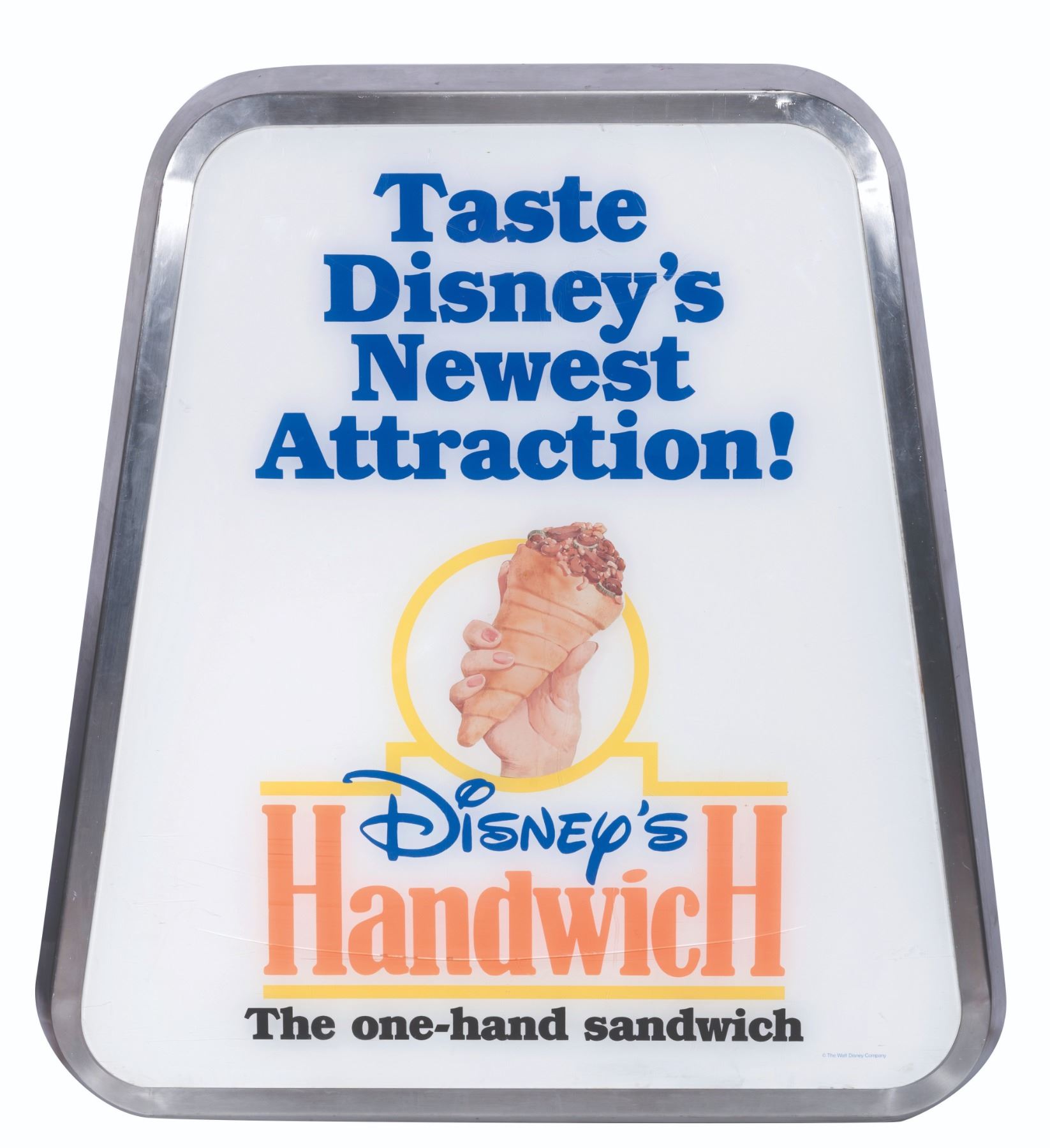 (Walt Disney World, 1980s) A large metal and plastic sign promoting the newest addition to the Disney Parks: the Handwich. The Handwich was meant to be a futuristic take on a sandwich, a conical version that could be eaten with one hand. Michael Eisner’s experiment did not catch on with Guests and was discontinued in the 1990s. Measuring 39” x 6.5” x 42.5” tall, the sign displays in good condition with heavy scratches, scuffs, and stains from Park use, including a 23.5” crack in the plastic. Due to size and weight, this item will require special shipping arrangements. Please inquire before bidding.