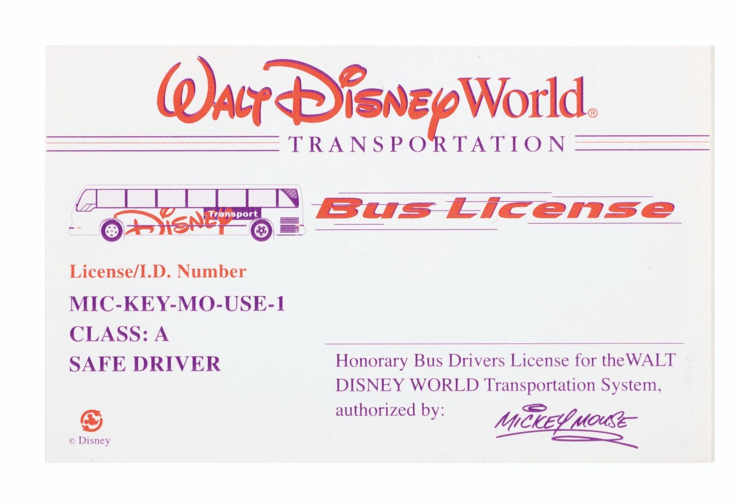 (Walt Disney World, 2000s) A complimentary souvenir Honorary Bus Driver's License from the Walt Disney World Transportation Buses. Measuring 3.5" x 2", the license is in fine condition.