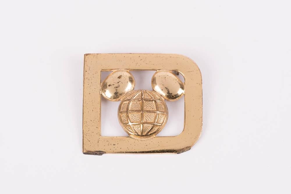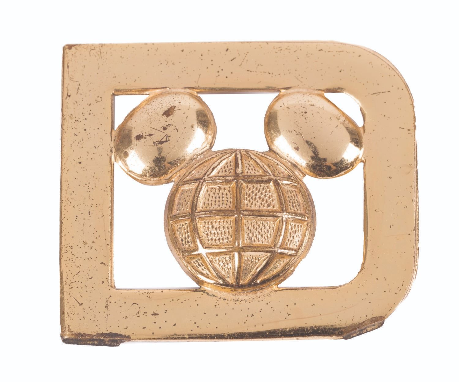 (Walt Disney World, 1970s-80s) A very rare “D” and Mickey Globe emblem from a Walt Disney World Host or Hostess badge. The banner on the bottom which identifies the Cast member’s title and forms a full badge is missing. Measuring 1.5” x 1.5”, the emblem is in good condition, with surface wear from handling and age.
