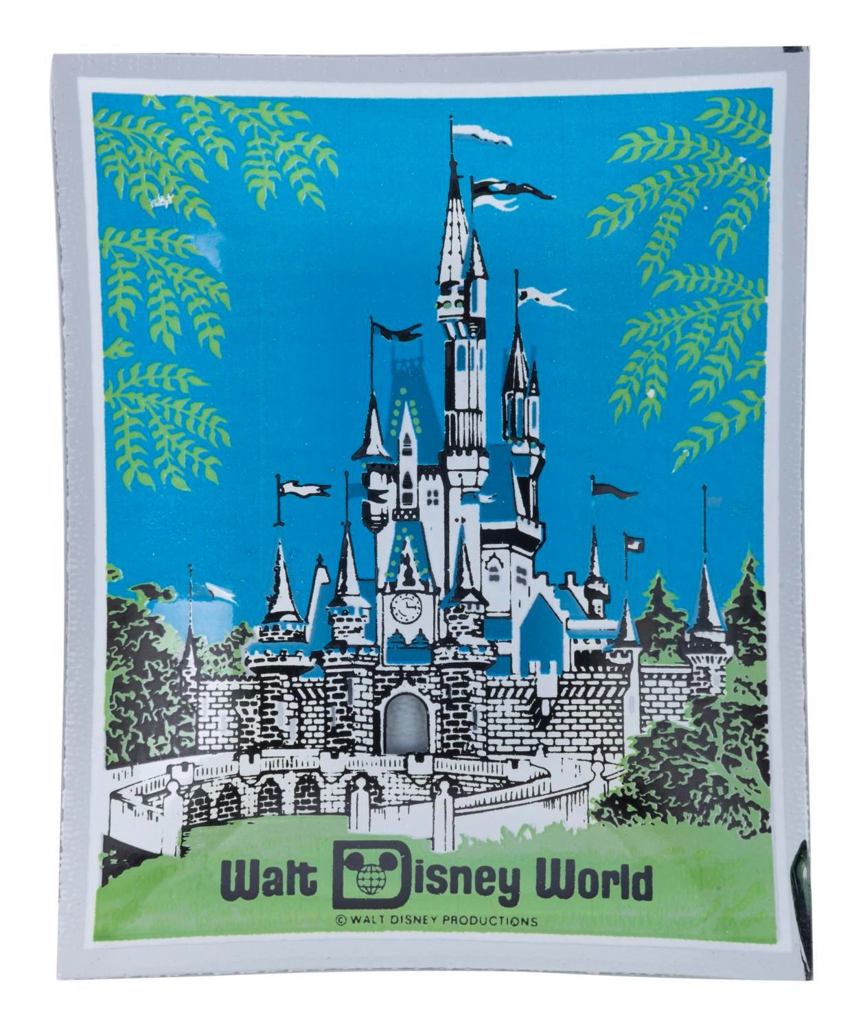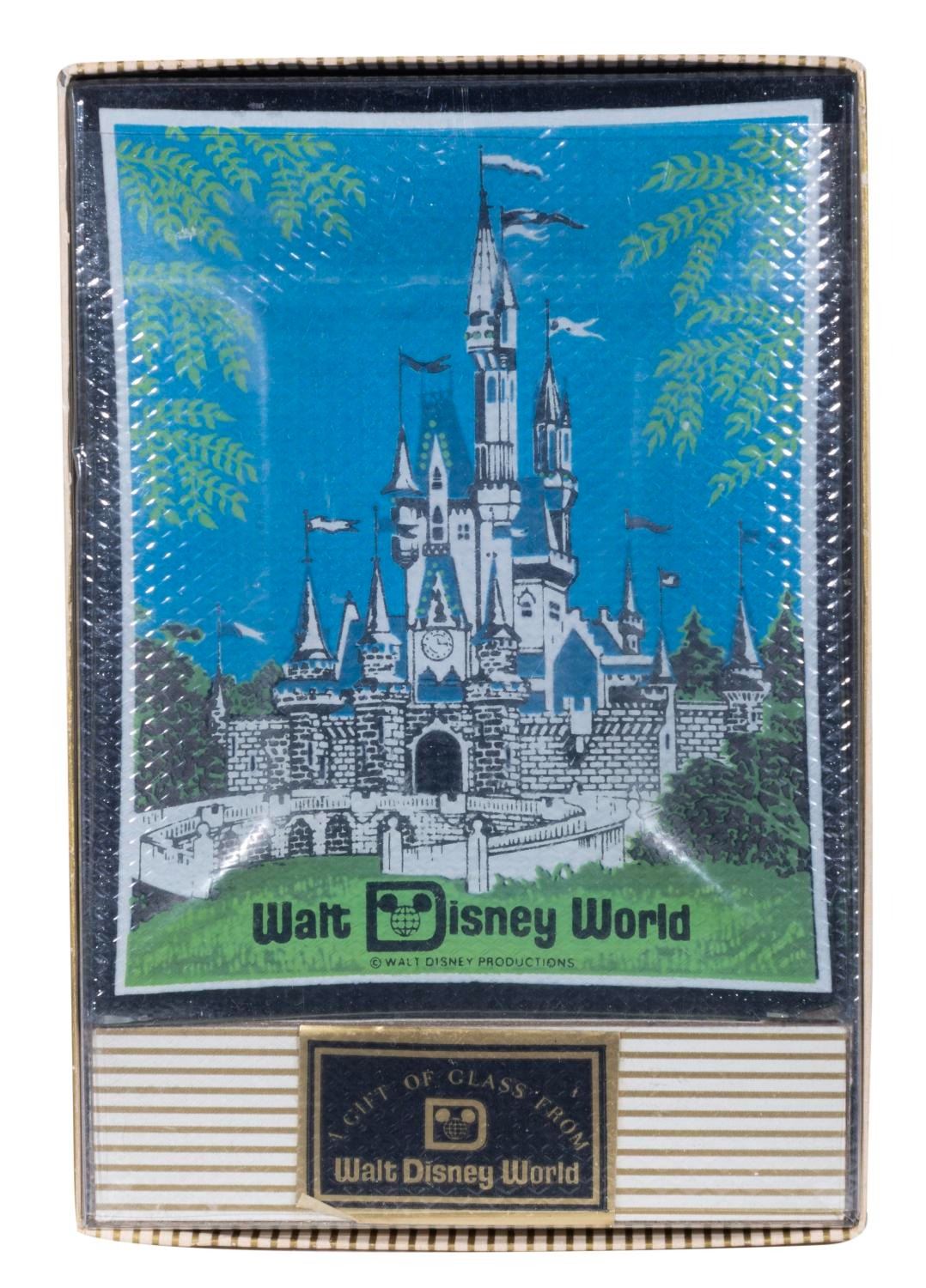 (Houze Art, 1970s-80s) A Houze Art glass tray souvenir of Walt Disney World featuring spectacularly detailed two-color imagery of Cinderella Castle with gold finished accents presented in its original plastic and cardboard gift box. Measuring 4.75" x 3.75" within a 6" x 4.25" box, this glass piece is in fine condition, and the box is in very good condition with yellowing, scuffs, and surface wear.