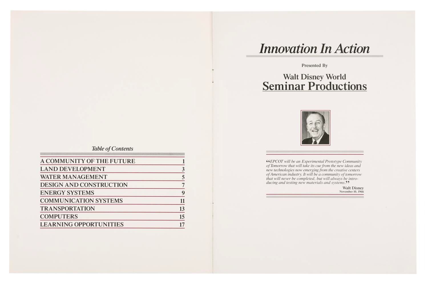 (Walt Disney World, 1990s) An internal Seminar Productions booklet titled Innovation in Action created to provide information on the ideals of EPCOT. Measuring 8.5" x 11", the booklet is in fine condition with light creasing on the spine.