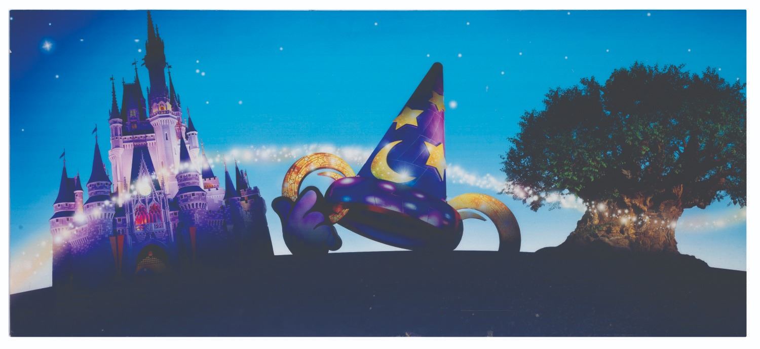 (Walt Disney World, 2001) A sign featuring Cinderella Castle from the Magic Kingdom, the Sorcerer’s Hat from Disney-MGM Studios, and the Tree of Life from the Animal Kingdom. This sign is from the Walt Disney World Resort’s Millennium Celebration and would be installed in front of The Great Movie Ride. Measuring 28.75” x 64.5”, the thick plastic sign is in good condition with spotting, scratches, and wear from Park use.