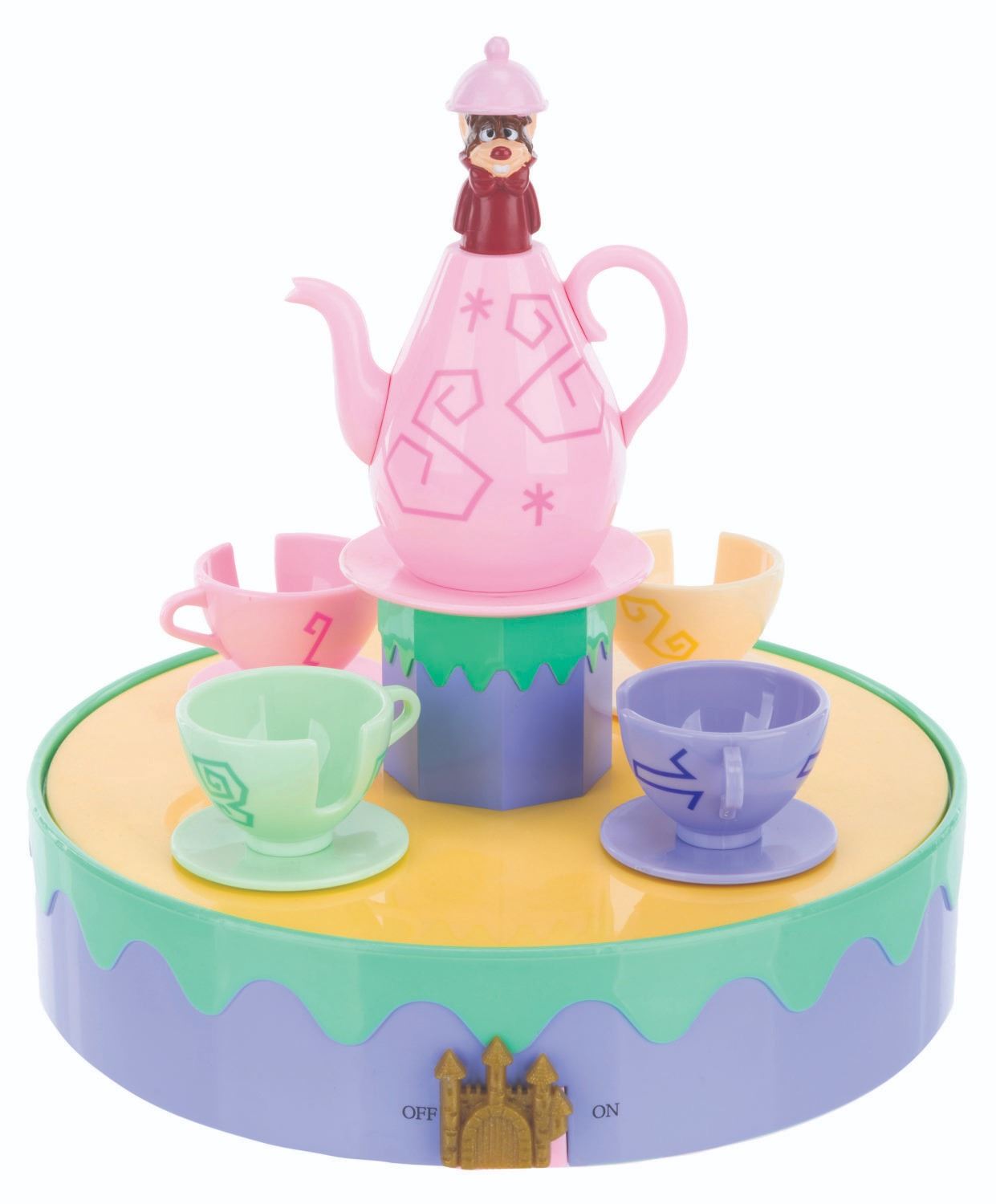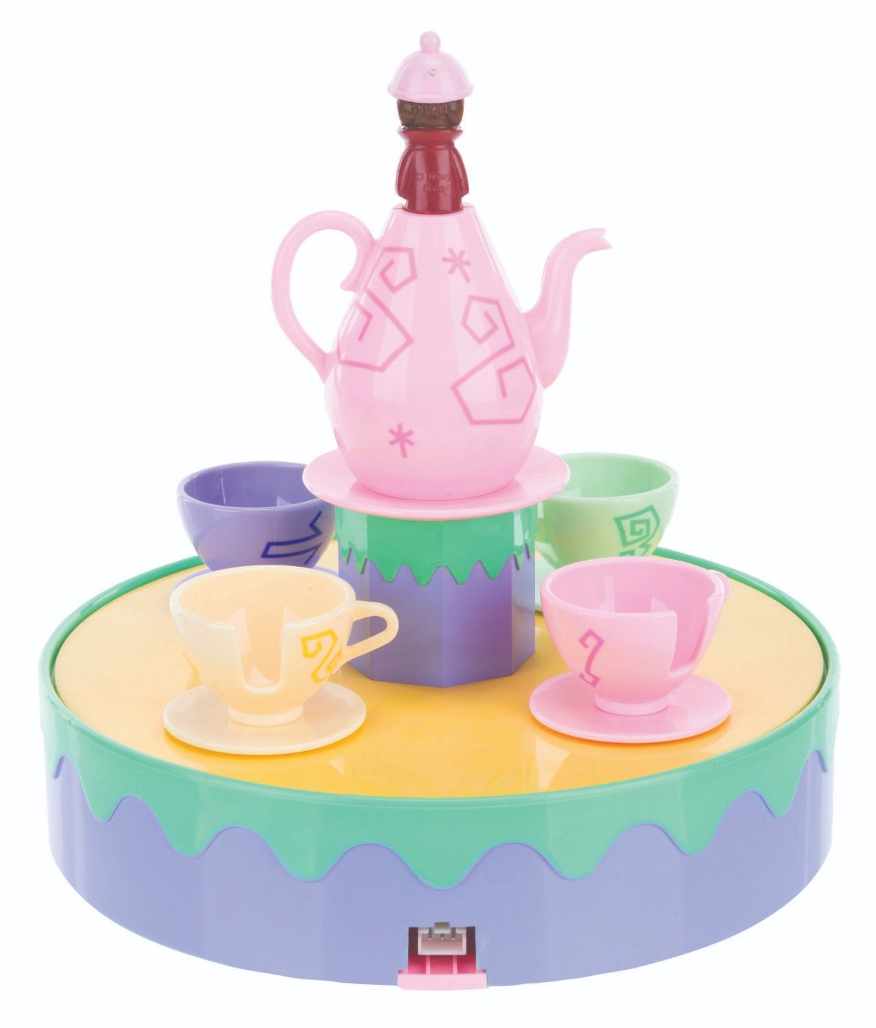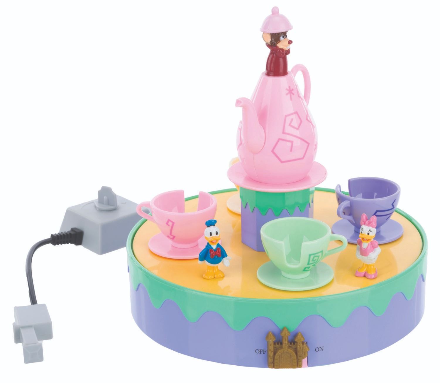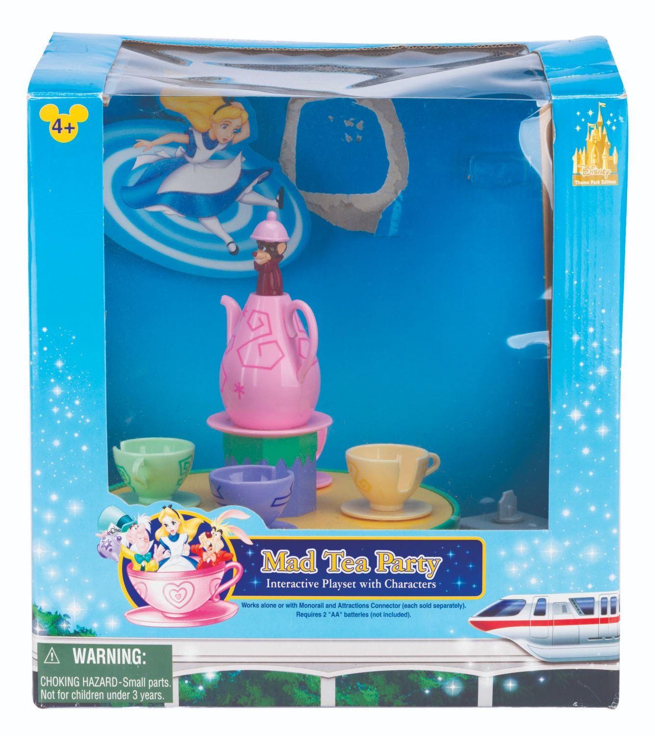 (Walt Disney World, 2000s) An interactive playset of the Mad Tea Party attraction located in the Magic Kingdom. Included with the playset are miniature figurines of Donald and Daisy Duck. With 2 AA batteries (not included), the playset’s cups spin around when turned on. Measuring 7.5” tall and 7” in diameter with its 8.75” x 10.25” x 11.25” tall original box, the playset has been tested and is in very good working condition with light wear.