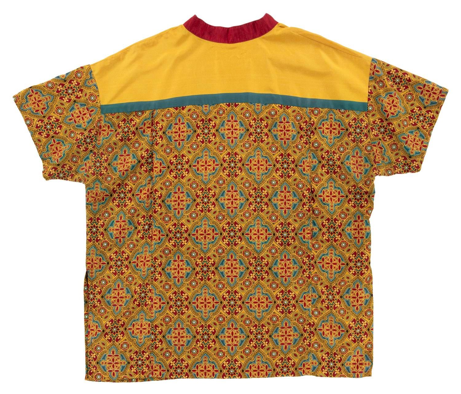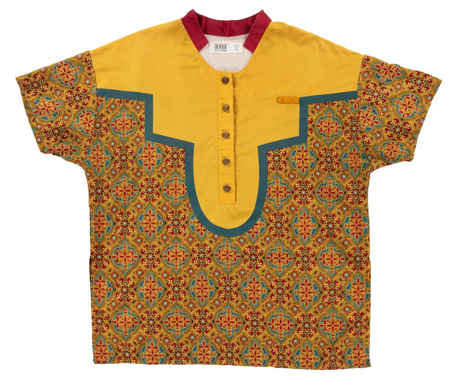 (Walt Disney World, 2000s) A brightly-pattered uniform shirt worn by Cast Members operating The Magic Carpets of Aladdin attraction in the Magic Kingdom. Labeled a size Female 2XL, the shirt is in good condition with typical color fading, light pilling, and wear from Park use.