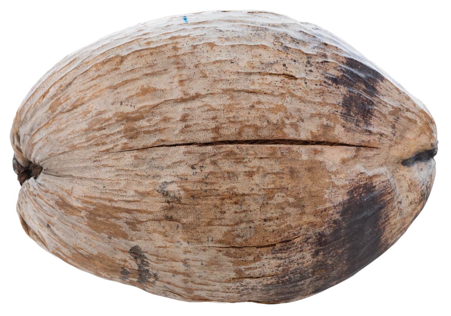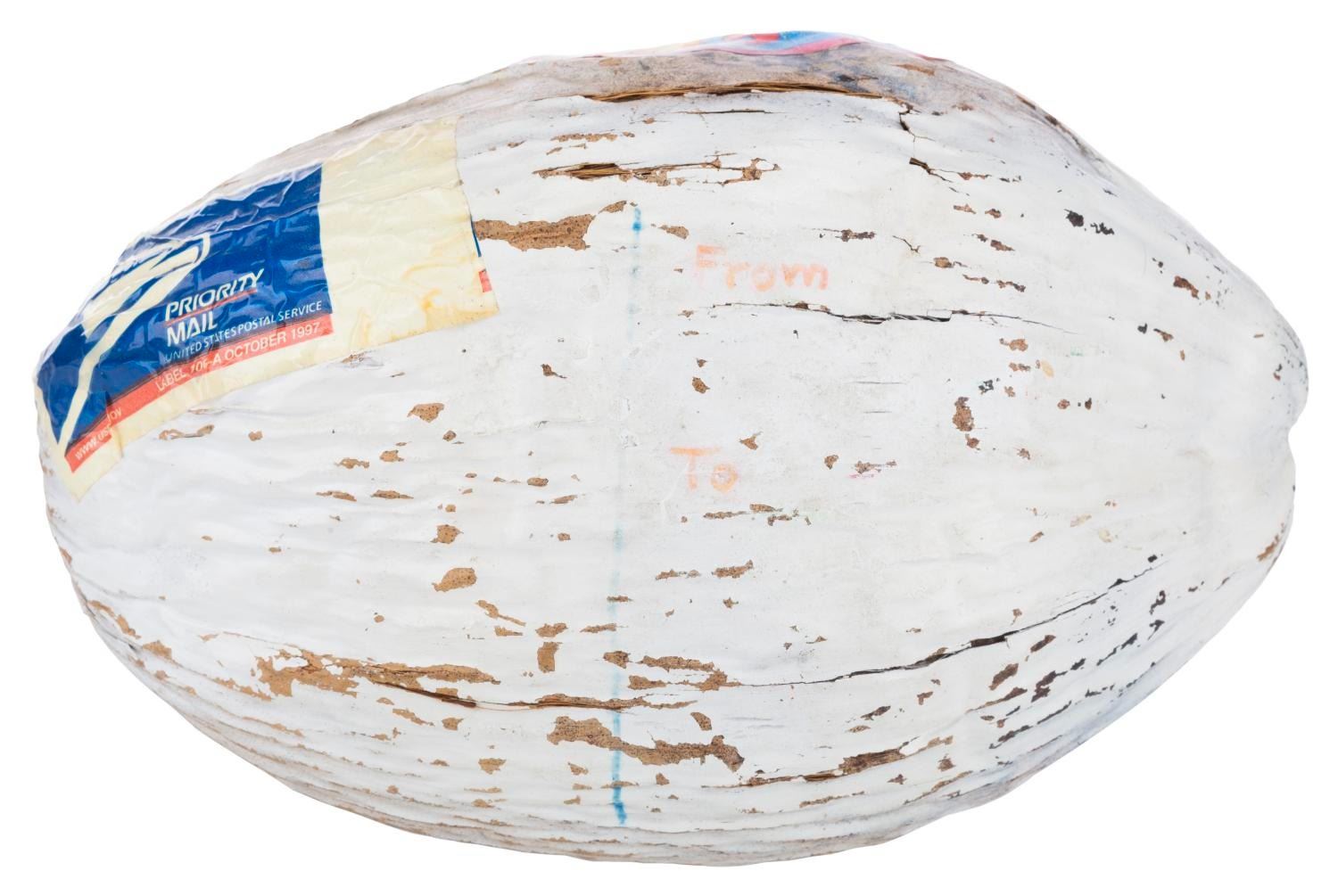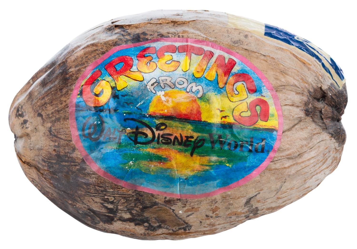 (Walt Disney World, 2000s) A souvenir mailable coconut, available for Guests to purchase and ship from select Walt Disney World shopping locations. Measuring 6" x 11" x 6.5" tall, the coconut is in good condition with paint loss, scuffs, light wear, and typical coconut cracks.