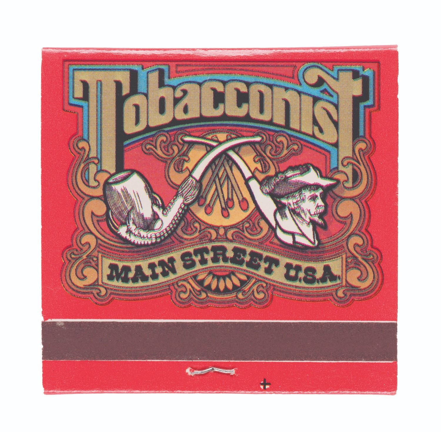 (Walt Disney World, 1970s) A matchbook from the Tobacconist shop on Main Street, U.S.A at Walt Disney World. This shop closed in the mid-1980s. Measuring 2" x 2", the unused matchbook is in very good condition with light wear from handling, and a small crease by the staple.