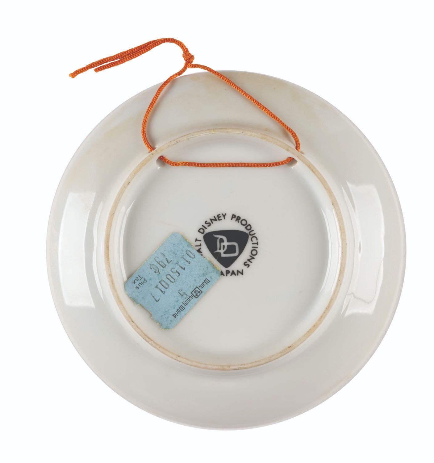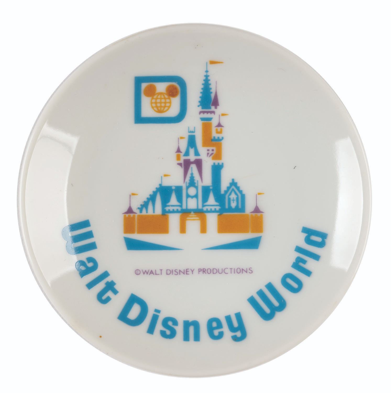 (Walt Disney World, 1970s) A Walt Disney World decorative souvenir plate featuring Cinderella Castle. Measuring 4" in diameter, the plate is in very good condition with the original price label sticker on the back, light soiling and a tiny yellow spot in the front glaze.