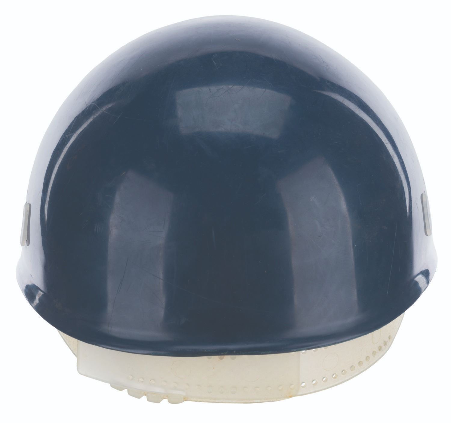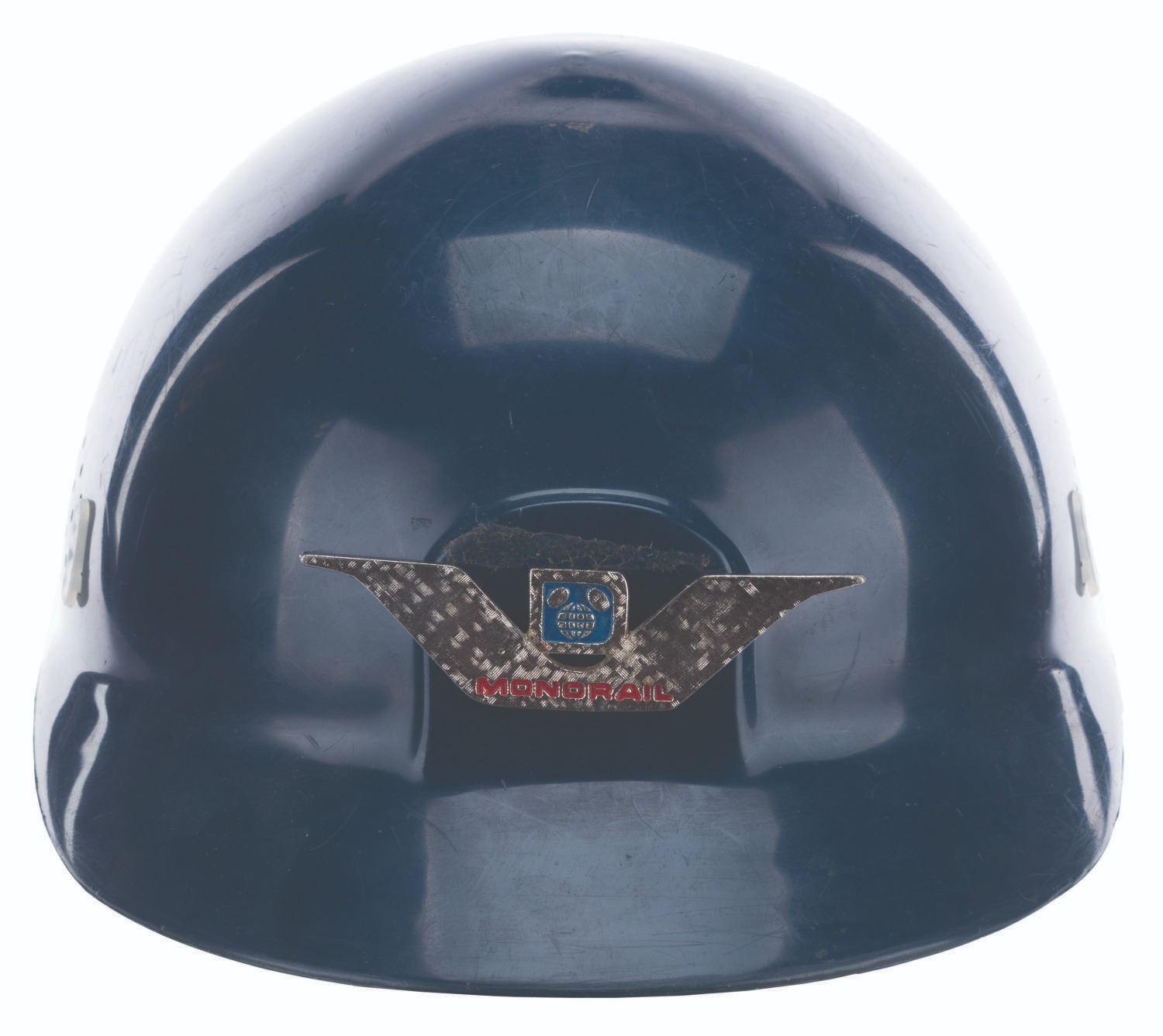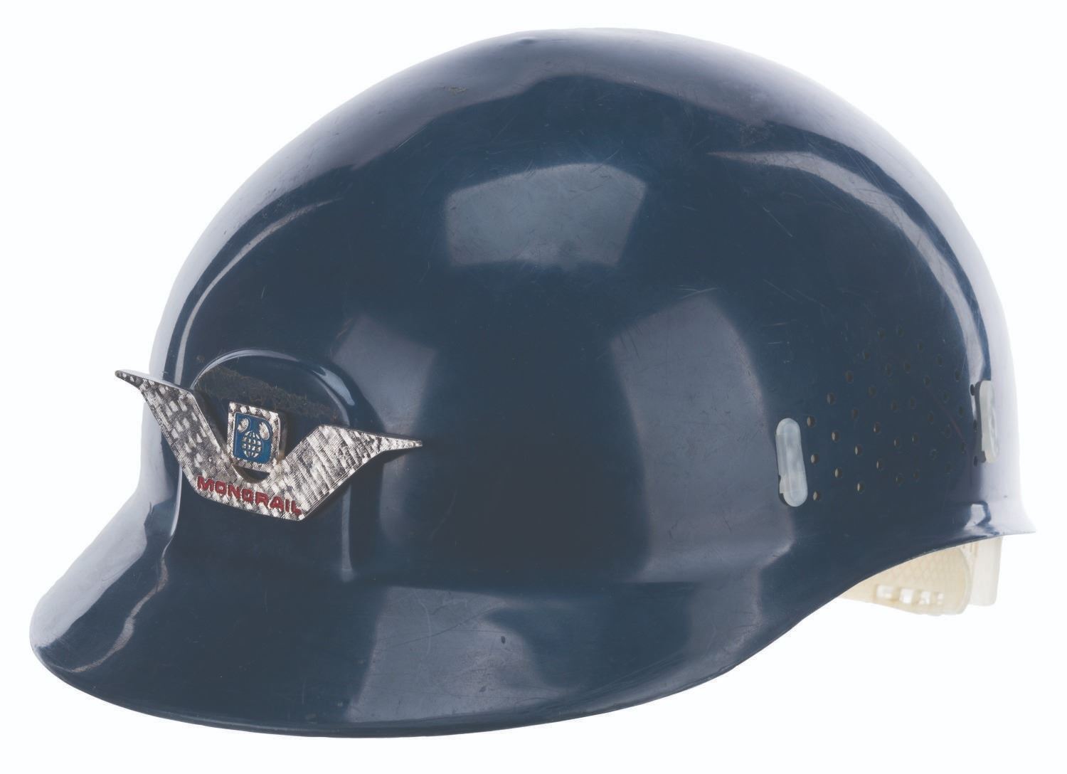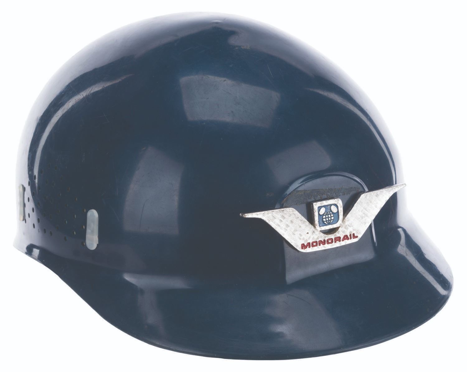 (Walt Disney World, 1971-80s) A Monorail pilot hat featuring a badge on the front with the Walt Disney World Logo and a wing-shaped design. Unlabeled but likely a size medium, the plastic hat is in good condition with scratches, stains, scuffs, and wear from Park use.