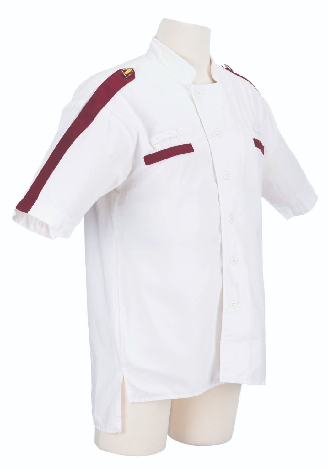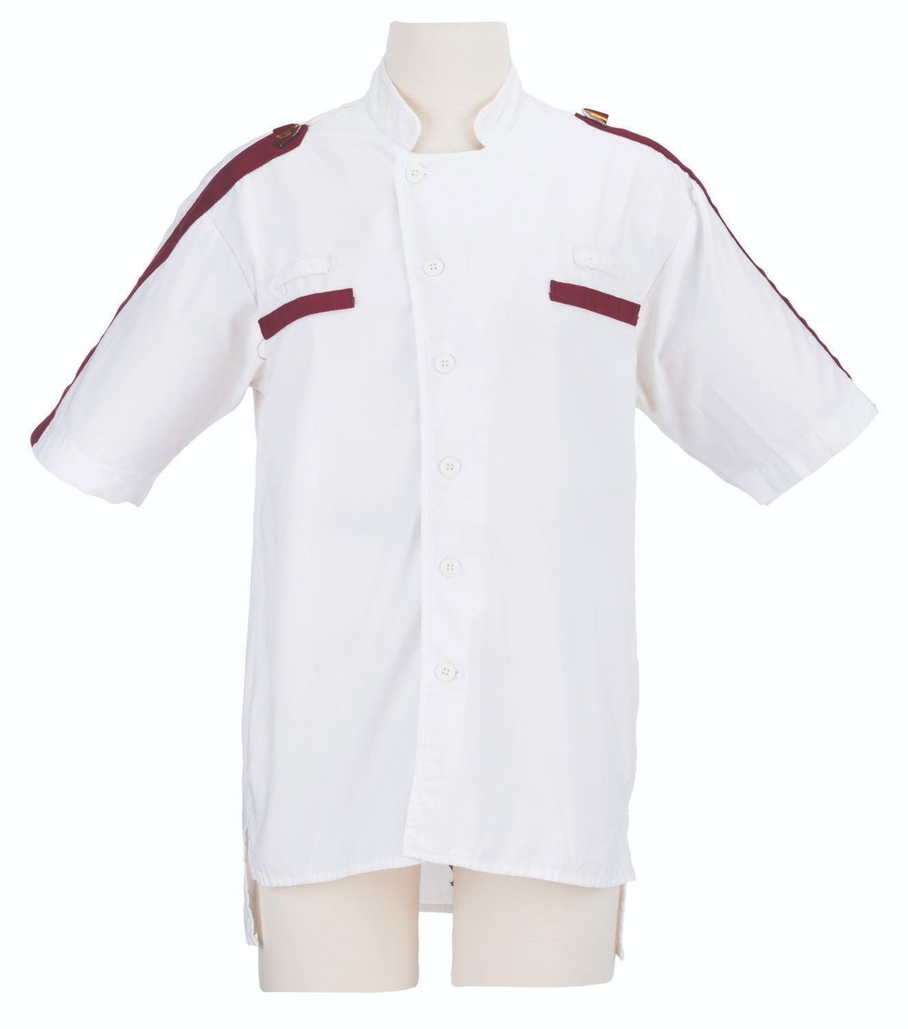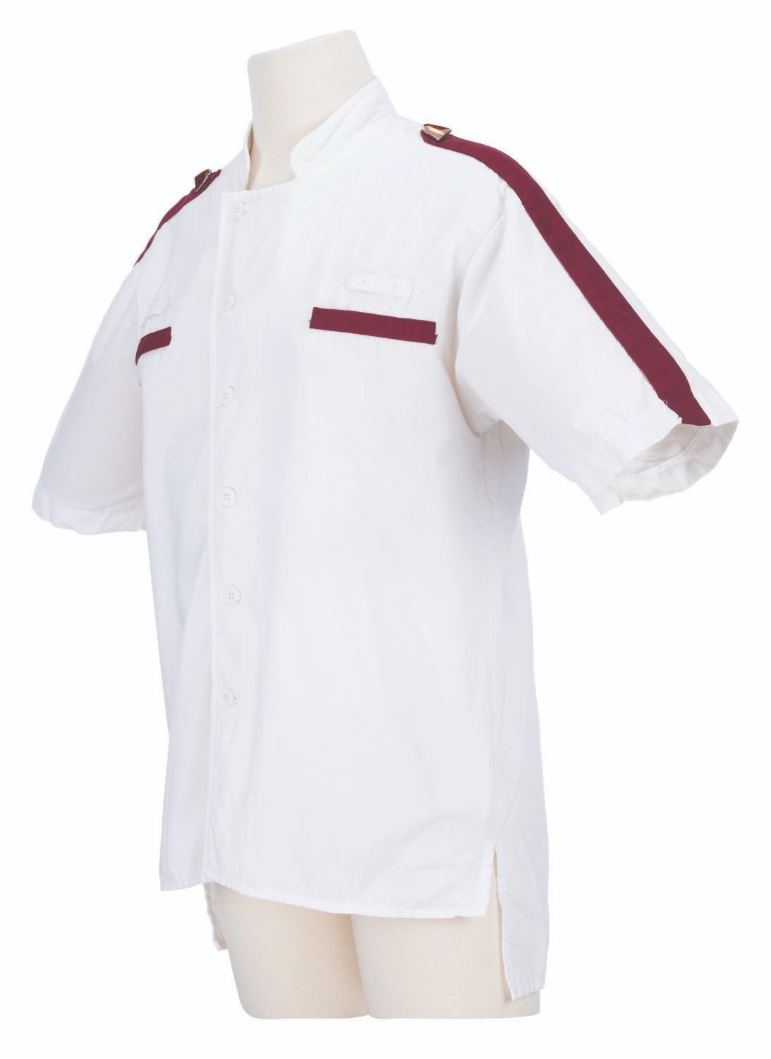 (Walt Disney World, 1990s) A Cast Member costume shirt for pilots of the Monorail at Walt Disney World, featuring two stylish Monorail buttons on the shoulders. Labeled a size S, the shirt is in fair condition with heavy stains throughout, fraying, and wear from Resort use.