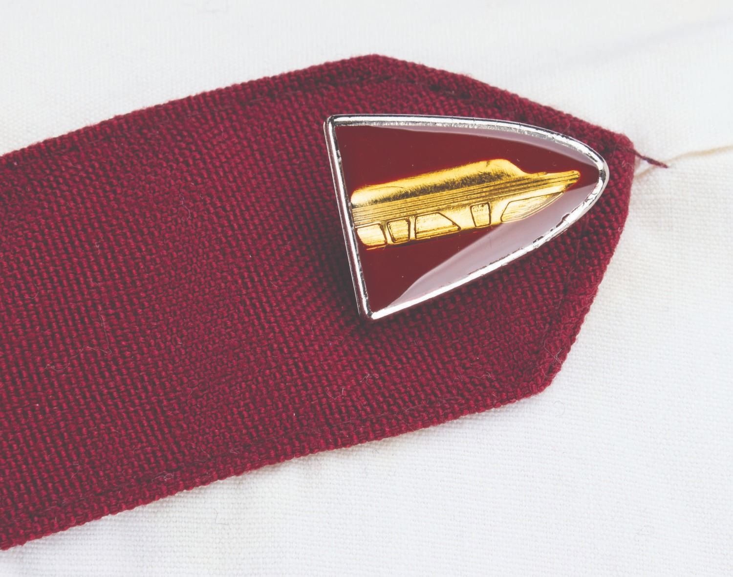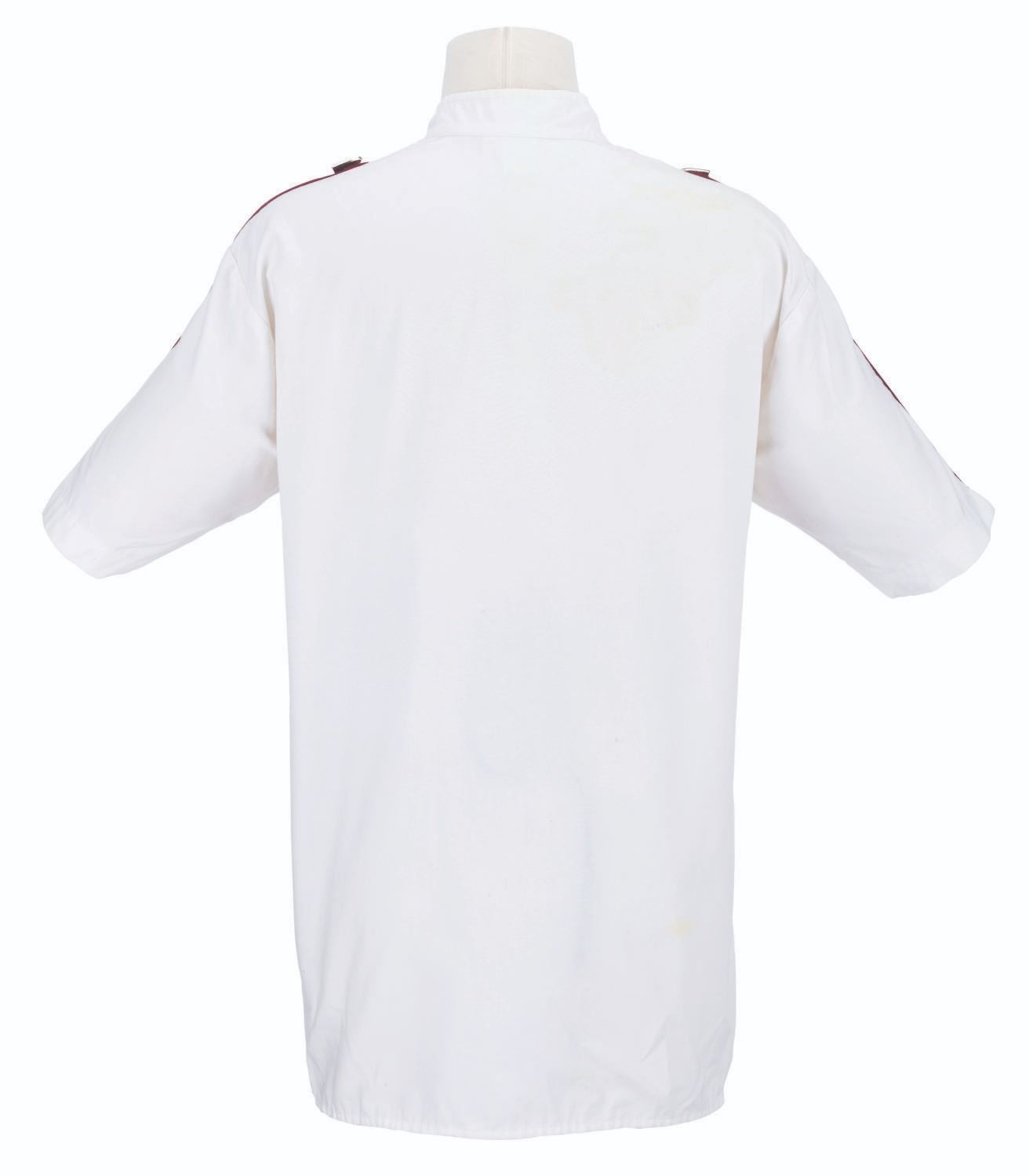 (Walt Disney World, 1990s) A Cast Member costume shirt for pilots of the Monorail at Walt Disney World, featuring two stylish Monorail buttons on the shoulders. Labeled a size S, the shirt is in fair condition with heavy stains throughout, fraying, and wear from Resort use.