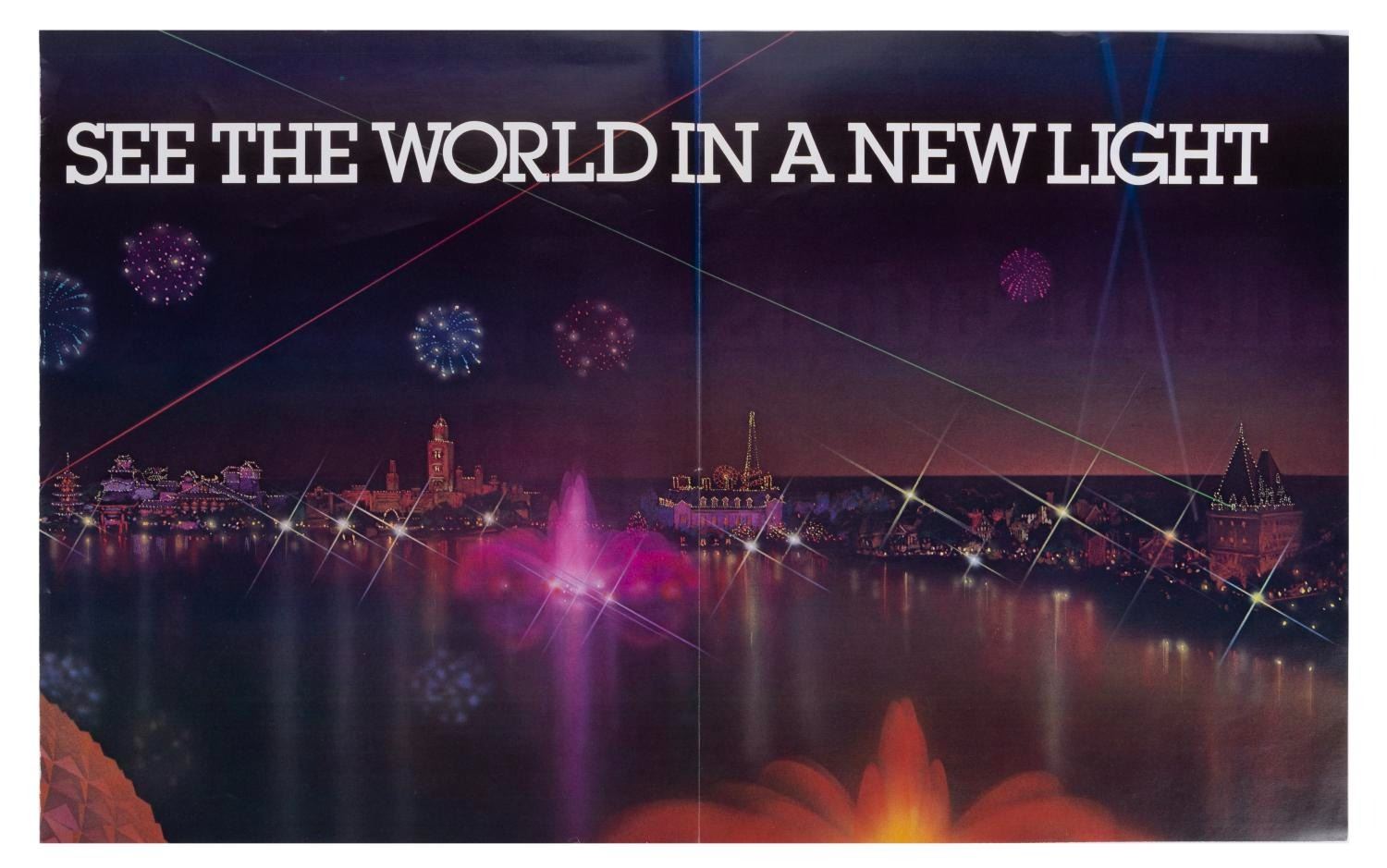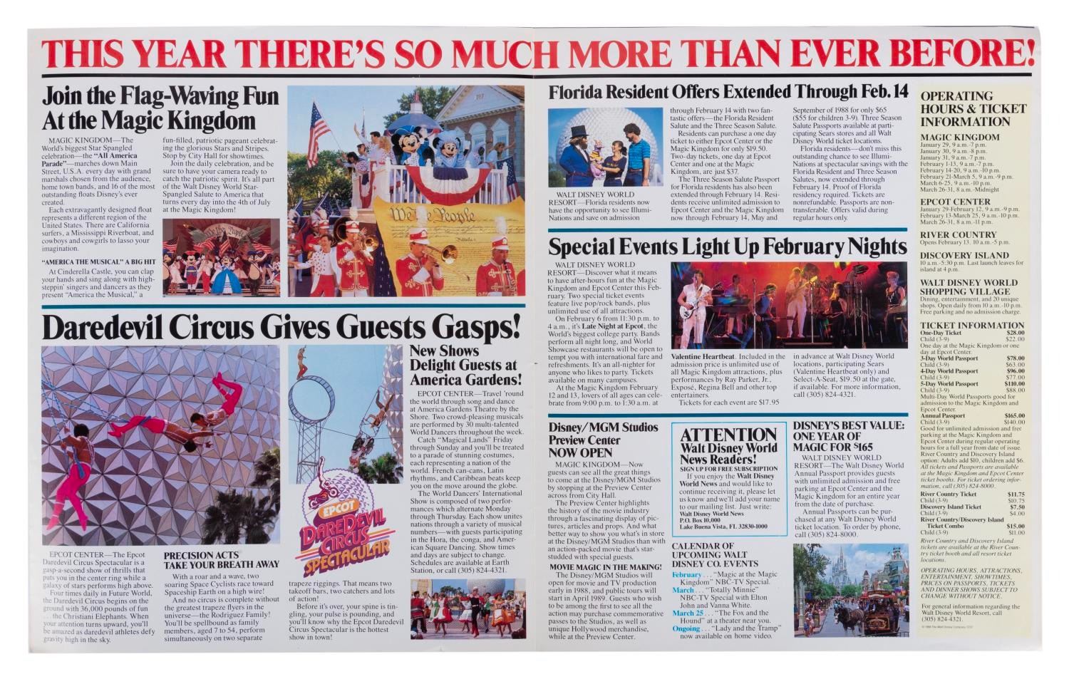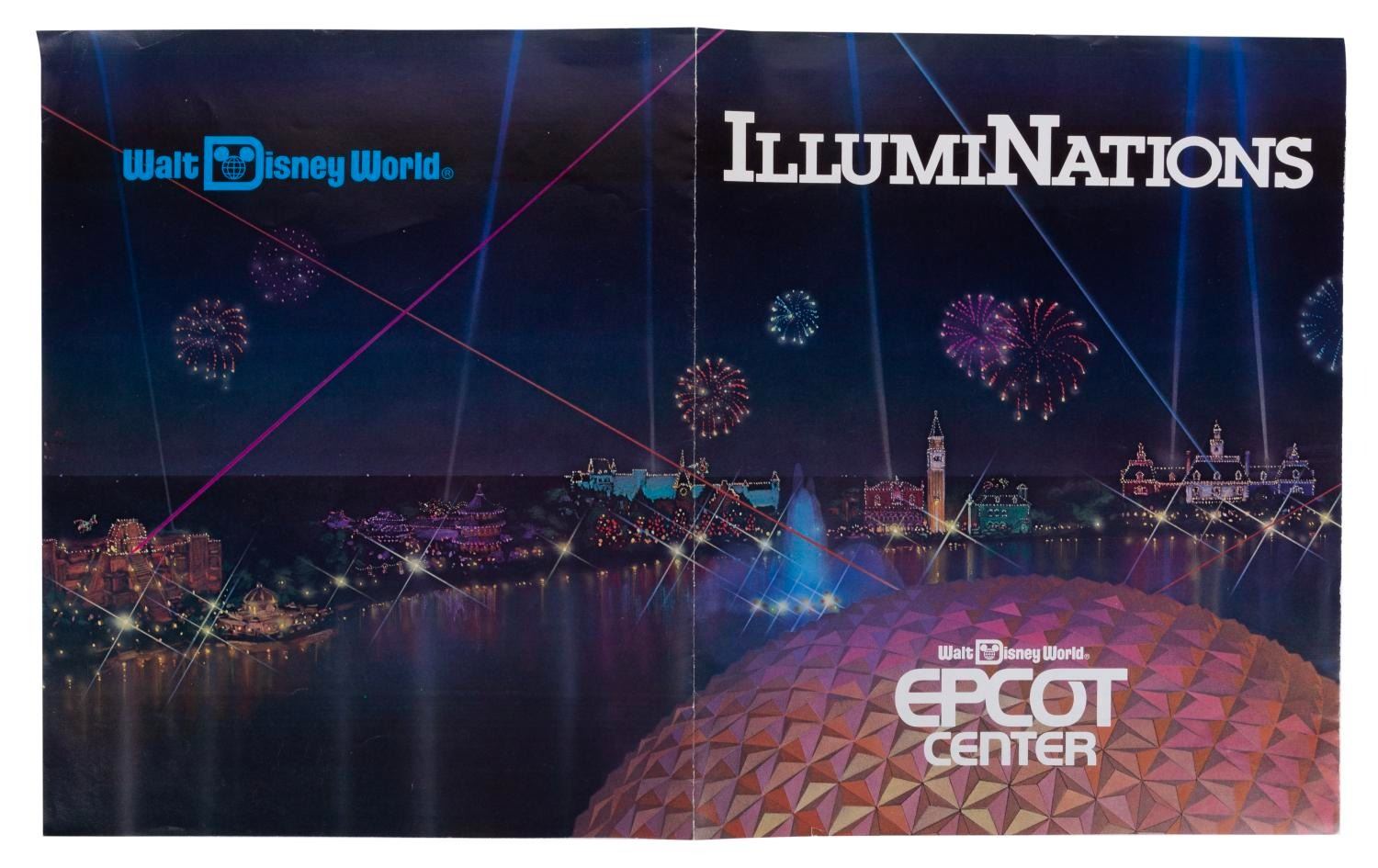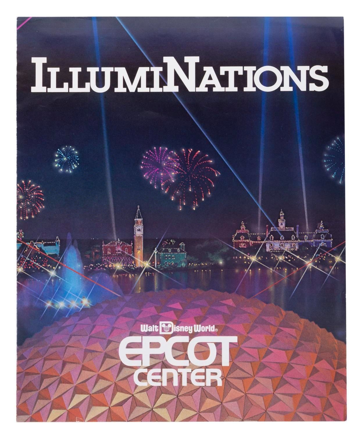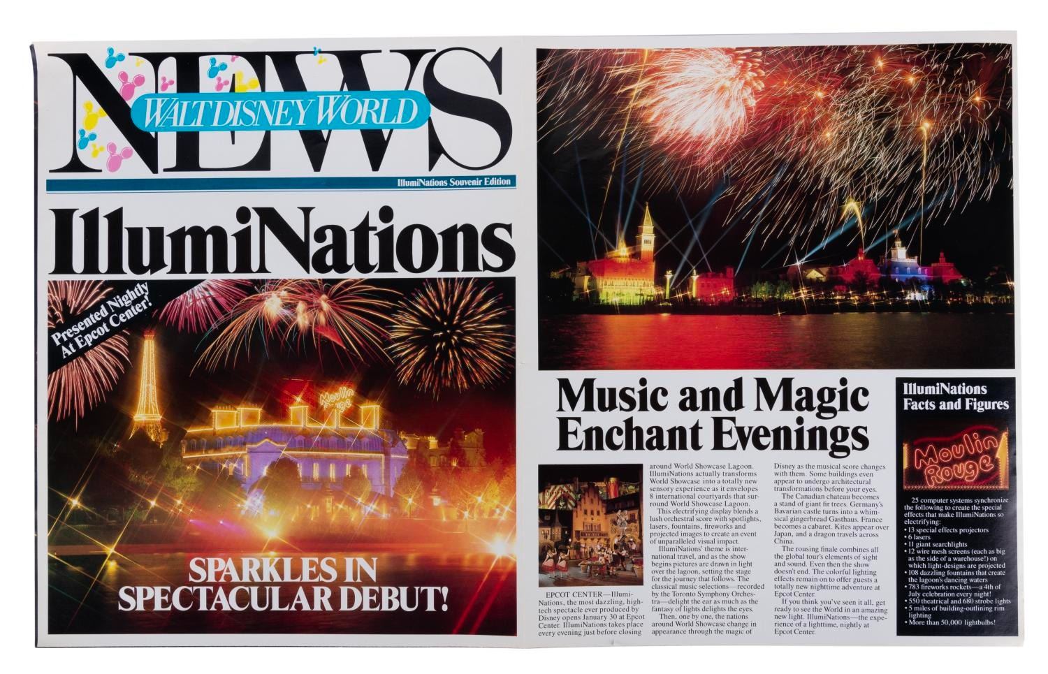 (EPCOT Center, 1988) A souvenir edition of Walt Disney World News spotlighting Illuminations at EPCOT Center. Supplementary articles of interest include the Daredevil Circus Spectacular and the Disney-MGM Preview Center. Measuring 11" x 13.5", the fold-out periodical is in very good condition with wear to edges and corners from handling and age.