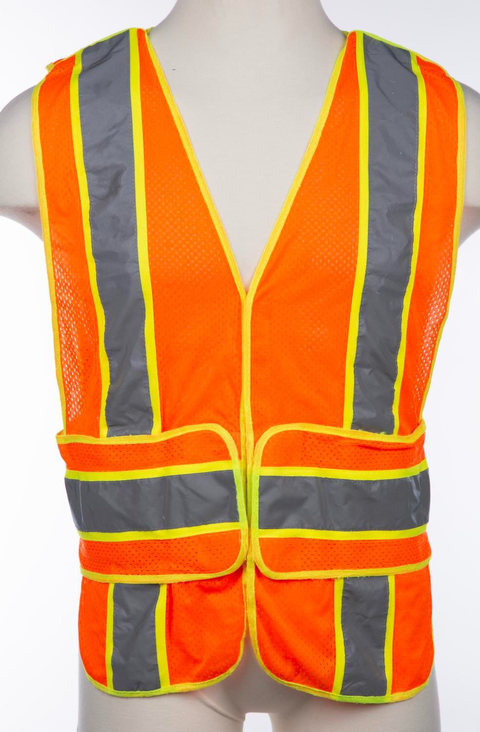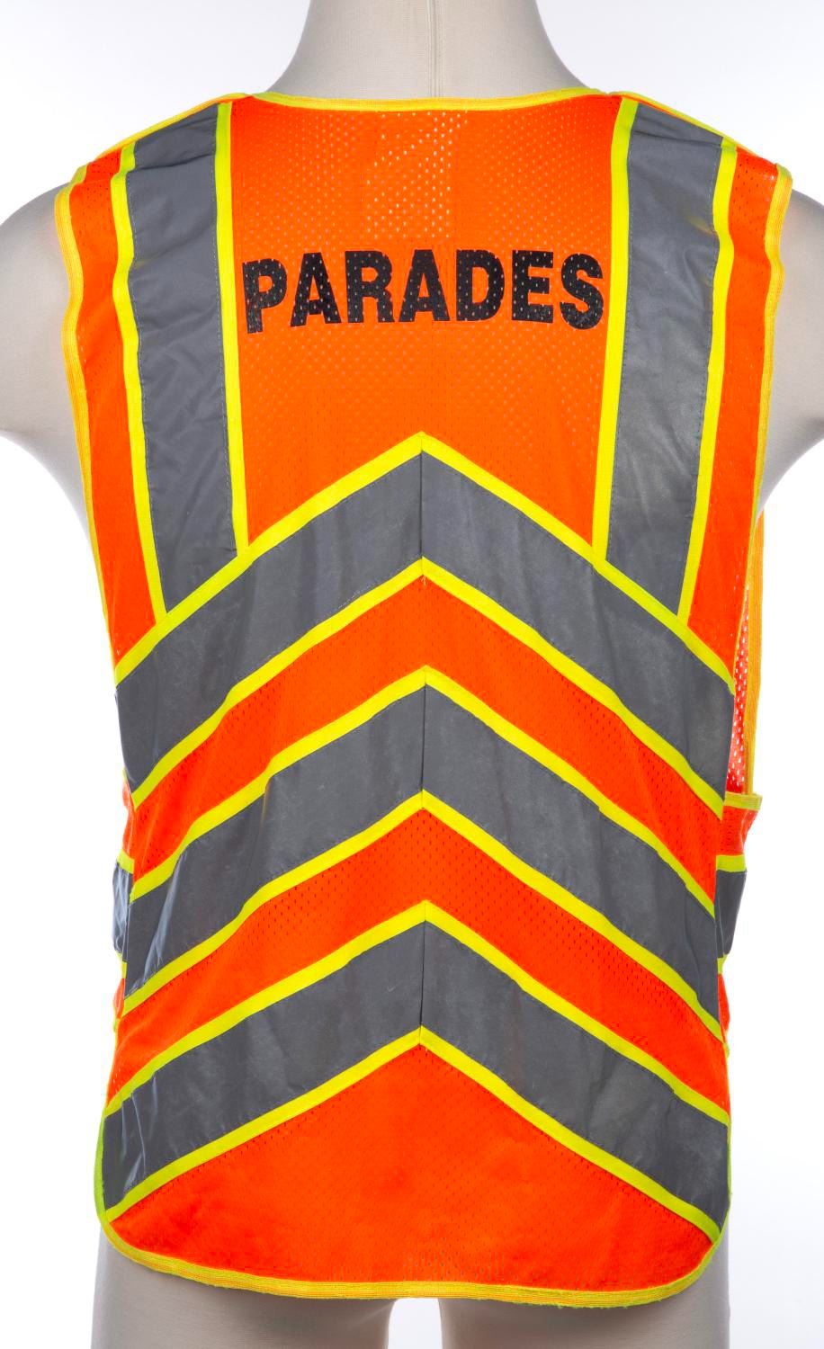 (Walt Disney World, 2000s) A reflective vest worn by Walt Disney World Resort Parades Crew Members. The reflective vest measures a size M-XL and is in very good condition with wear to material from Park use.