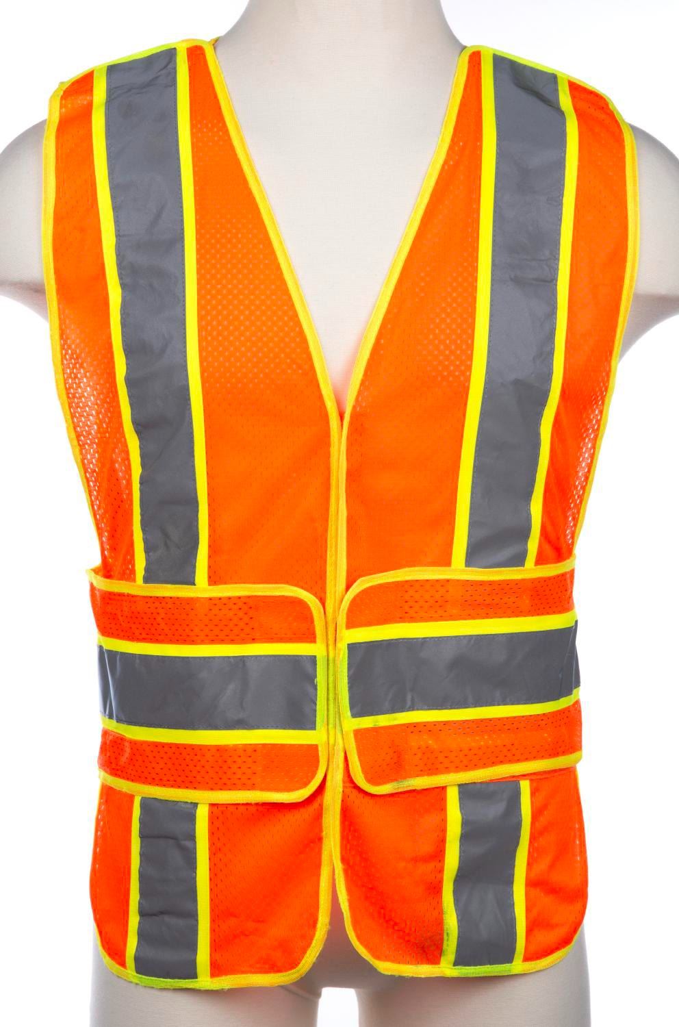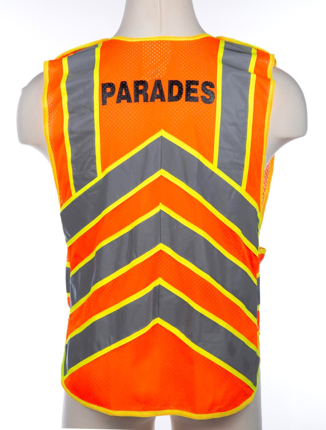 (Walt Disney World, 2000s) A reflective vest worn by Walt Disney World Resort Parades Crew Members. The reflective vest measures a size M-XL and is in very good condition with a tiny area of staining, and wear to material from Park use.