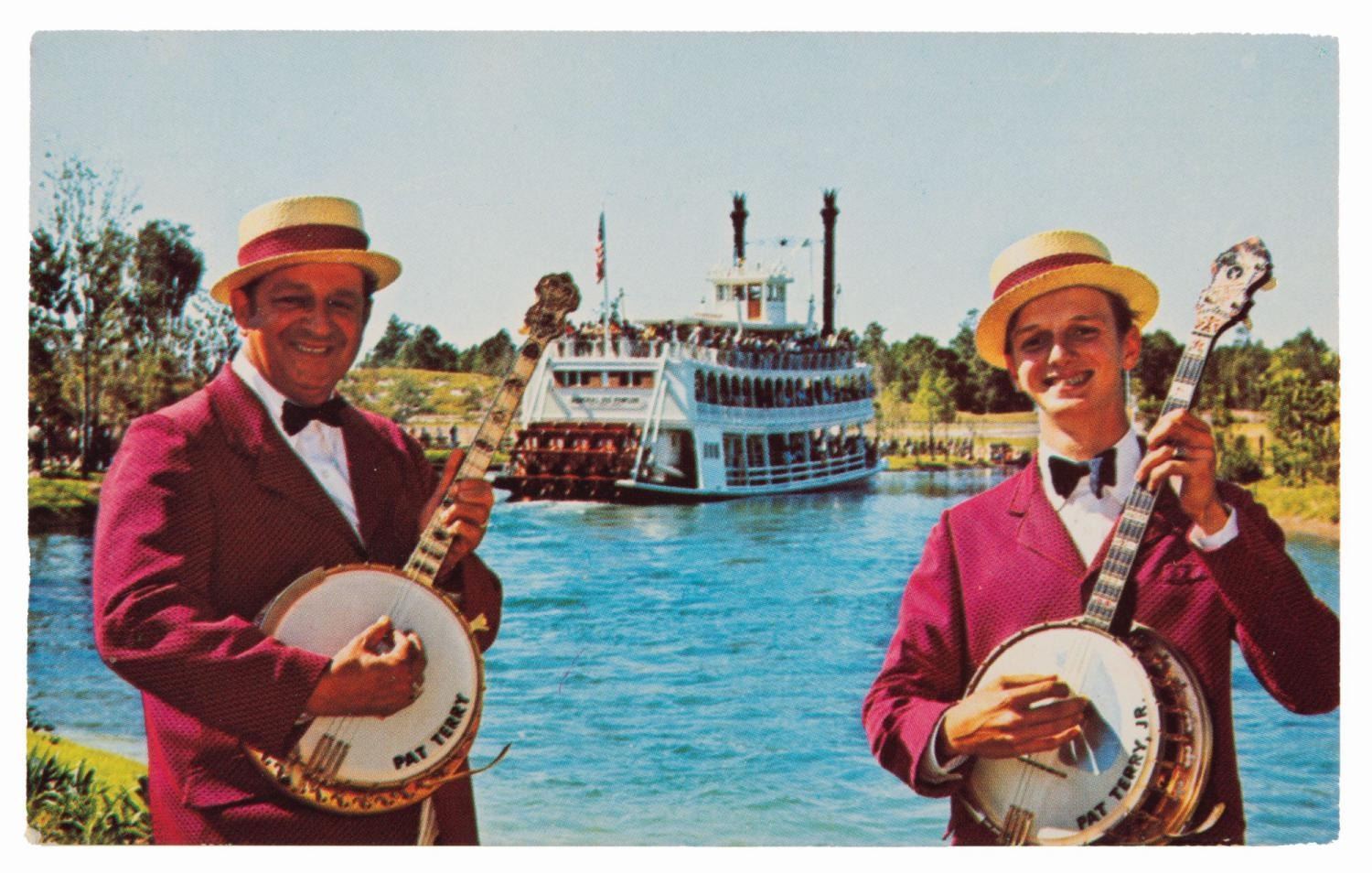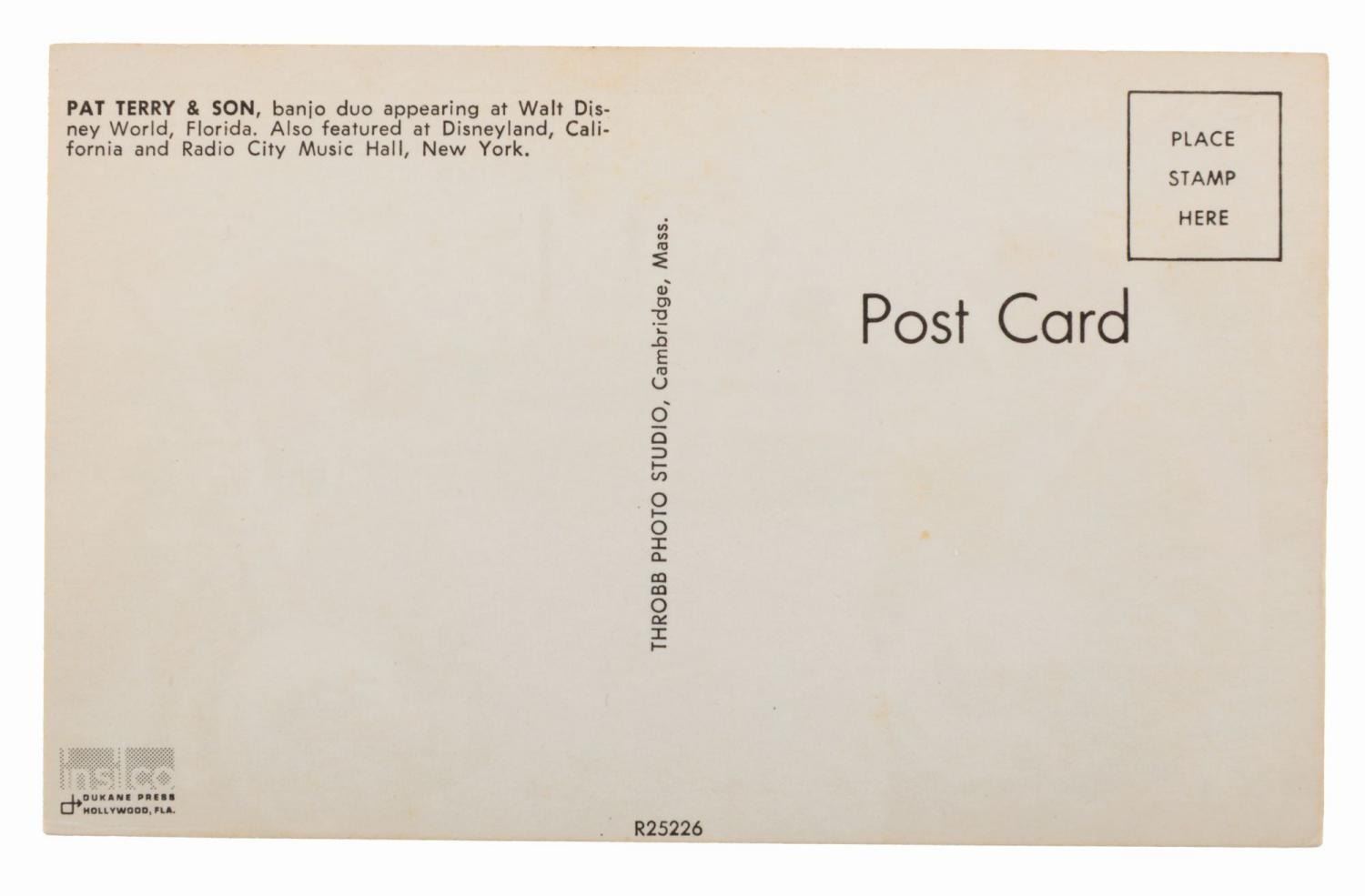 (Dukane Press, 1970s) A promotional postcard featuring Pat Terry and Pat Terry Jr. playing banjos at the very new Walt Disney World’s Magic Kingdom. Measuring 3.5" x 5.5", the card is in very good condition with light discoloration and minimal edge wear.