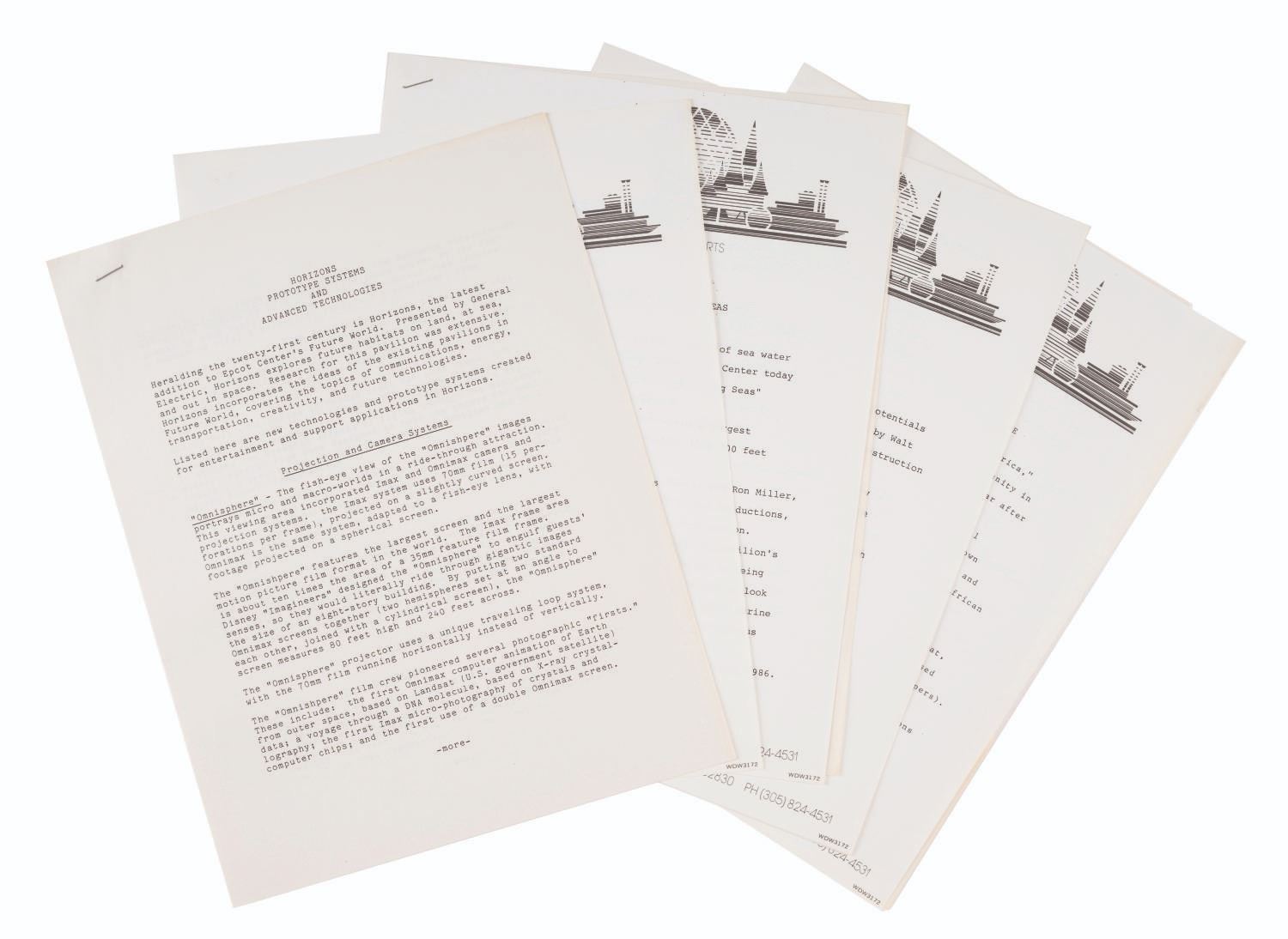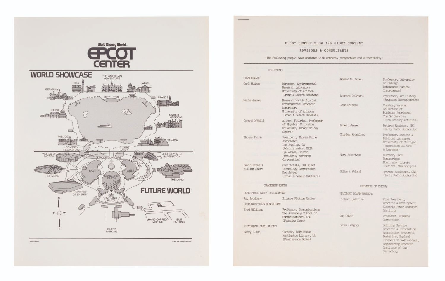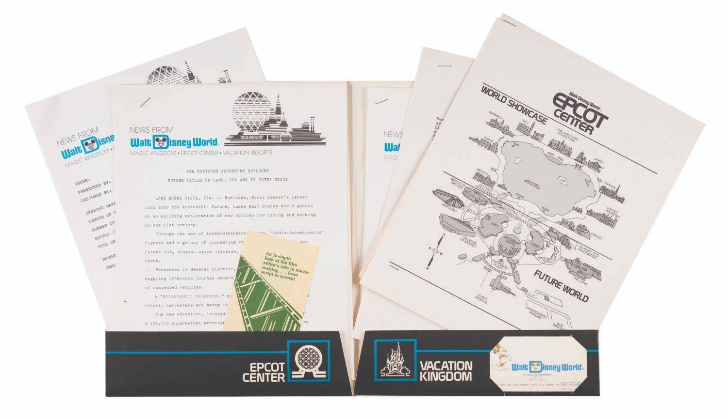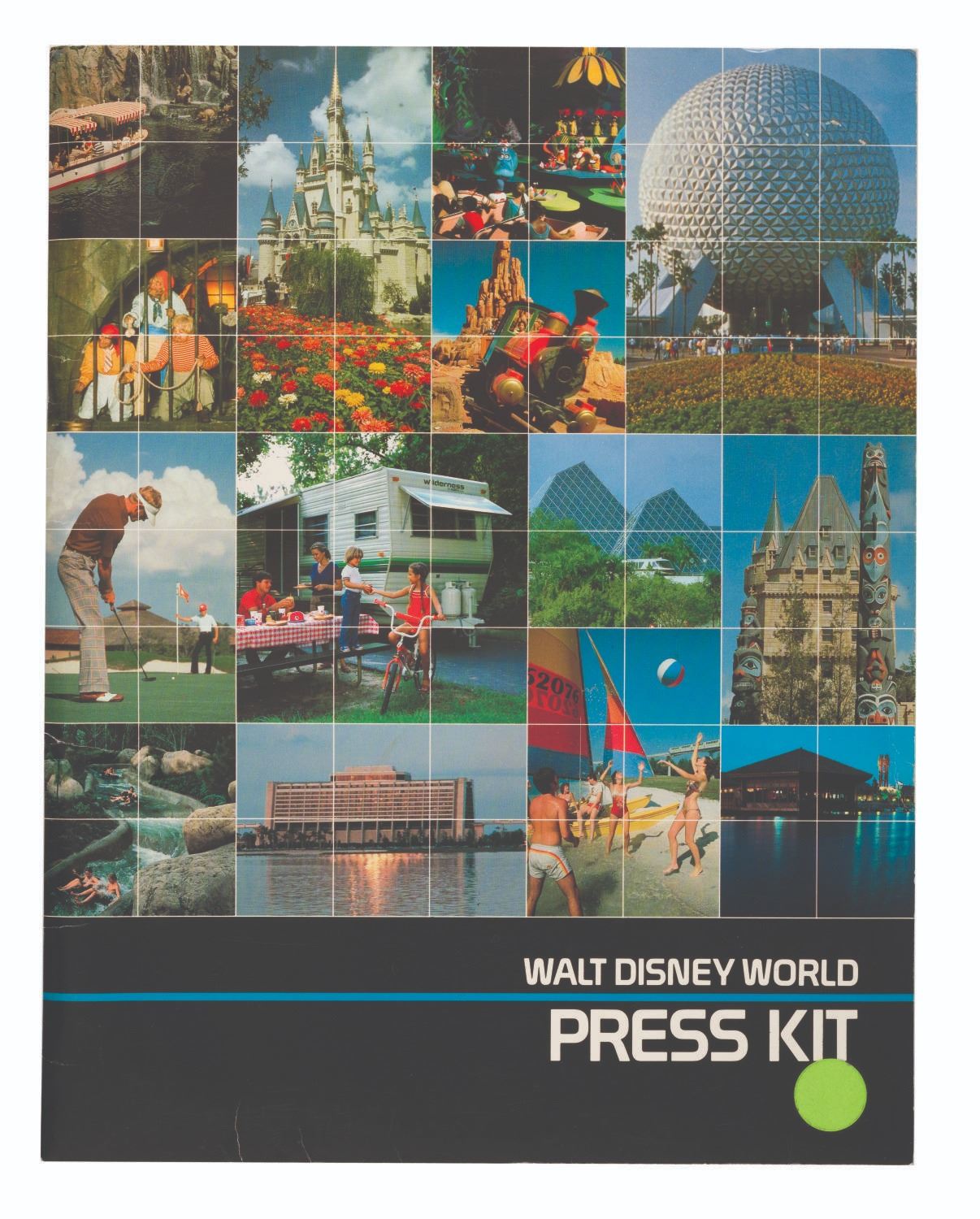(EPCOT Center, 1982-83) A Walt Disney World Press Kit. This Press Kit was prepared for media distribution and comes complete with the business card of Charley Ridgeway (Walt Disney World Director of Press and Publicity). Notably among this collection of promotional materials are (6) editions of News From Walt Disney World (detailing then-new Horizons adventure, construction of The Living Seas Pavilion and Morocco Showcase, and the 12th anniversary of Walt Disney World Resort). Also included is a 1982 EPCOT Center map, a 1983 Walt Disney World Operational Calendar, Horizons Fact Sheet, and a list of EPCOT Center Show Advisors and Consultants. Measuring 9"x11.75", this rare collection of papers offers a detailed view of EPCOT Center during 1983 and is in very good condition with few minor creases and folds, and wear to edges and corners from handling.