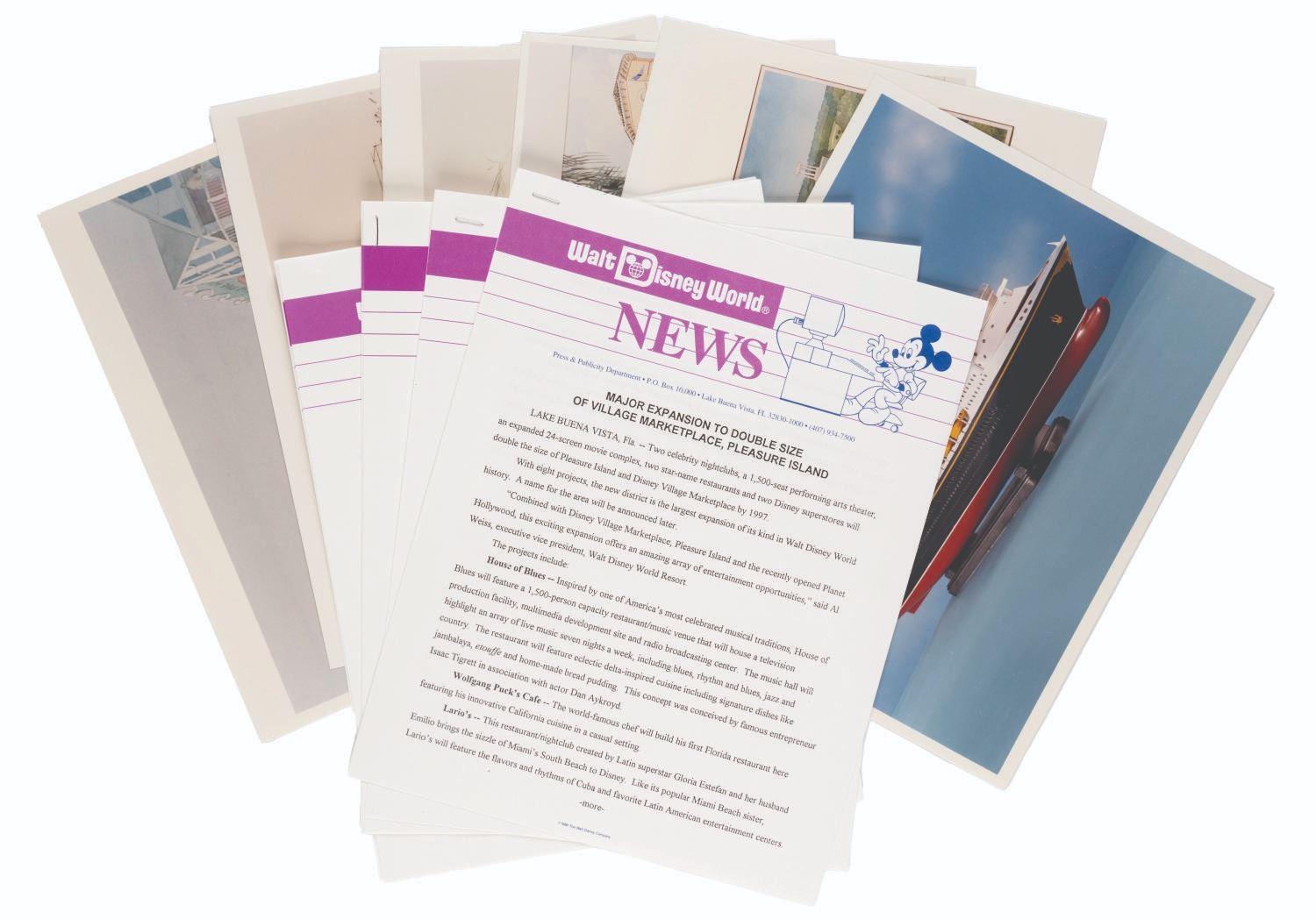(Walt Disney World, 1995) A Walt Disney World press information folder with nine press releases and six glossy color photos relating to events such as the Park’s 25th anniversary celebration and the opening of resorts and attractions such as the International Sports Complex, Epcot GM Pavilion, BoardWalk Resort, and Pleasure Island expansion. The releases measuring 8.5” x 11” and photos measuring 8” x 10” are all in fine condition. The folder measuring 9” x 12.25” is in good condition with edge wear and creases.