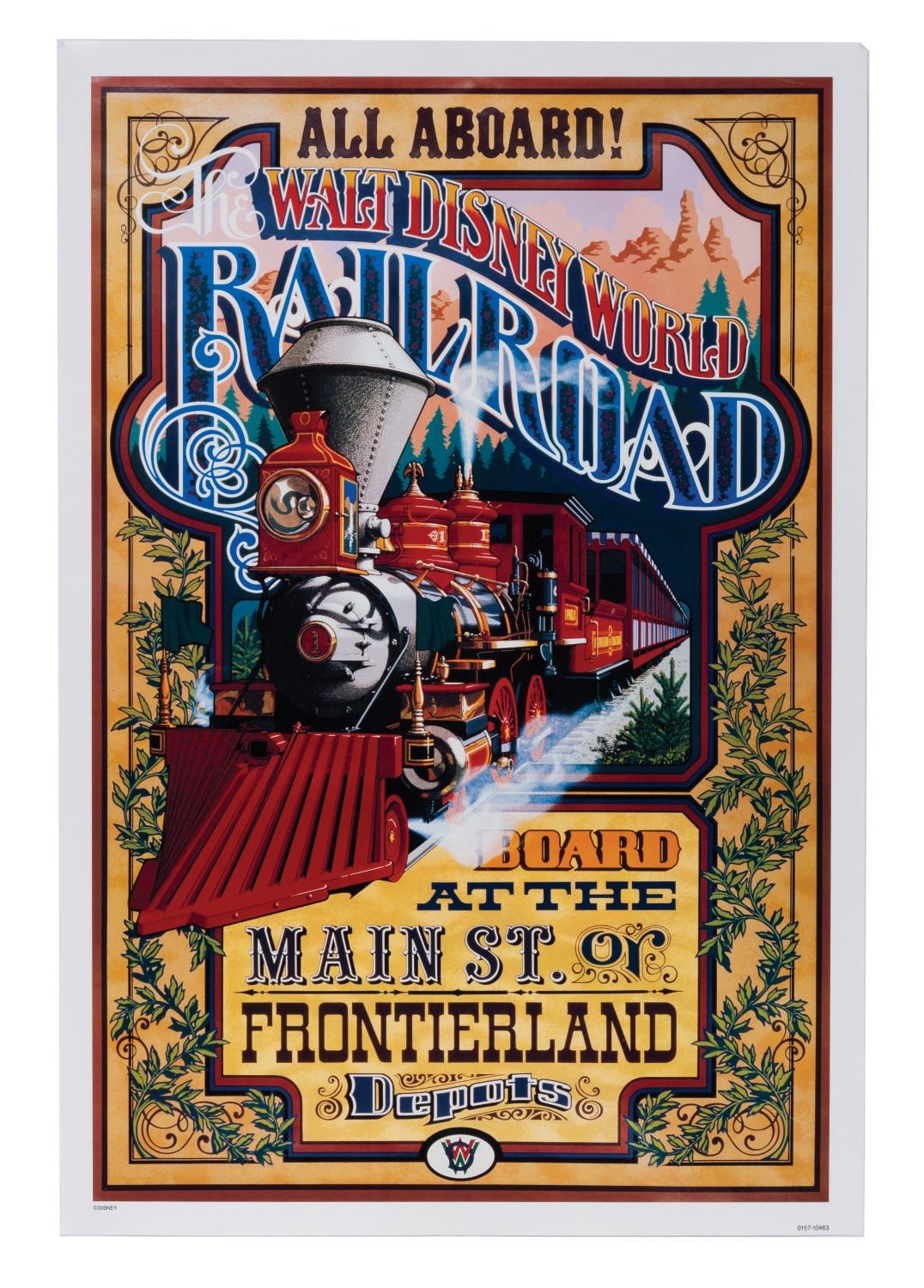 (Walt Disney World, 1976) A poster for the Walt Disney World Railroad. The poster features the Magic Kingdom depots with imagery of the Disneyland Railroad C.K. Holliday pulling Narragansett style cars as envisioned by artist Jim Michaelson. The same dynamic art was used to advertise the timeless attraction at several Disney Parks worldwide. Measuring 24"x36", the poster is in fine condition.
