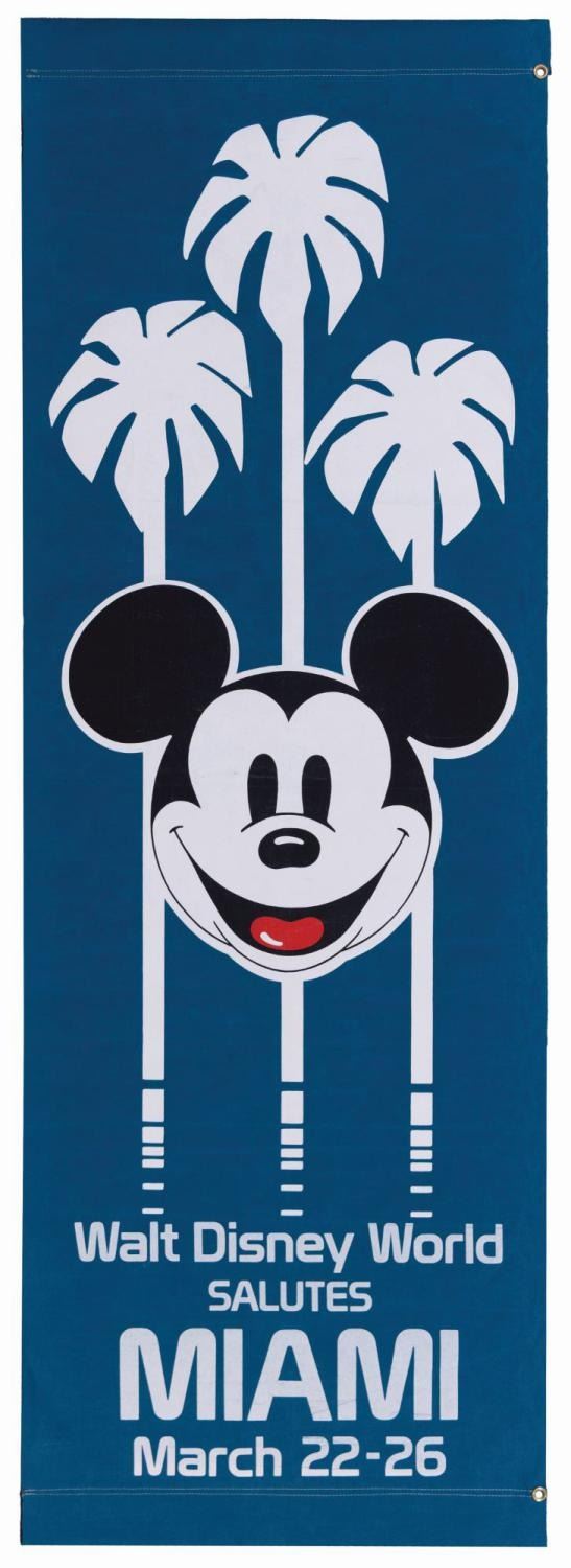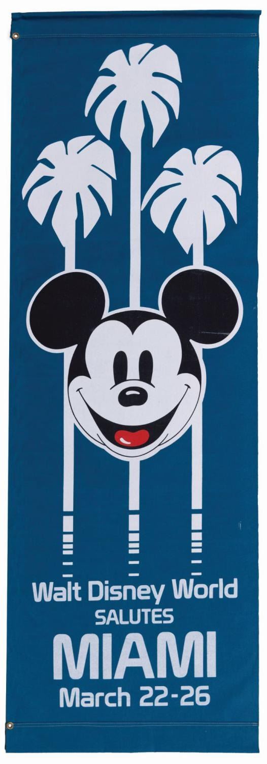 (Walt Disney World, 1990s-2000s) A large Walt Disney World Salutes Miami double-sided banner from a celebration of the city at the Resort, held March 22-26. Measuring 31" x 89", the banner displays in very good condition with scratches, soiling, wear from display, and fading from age.