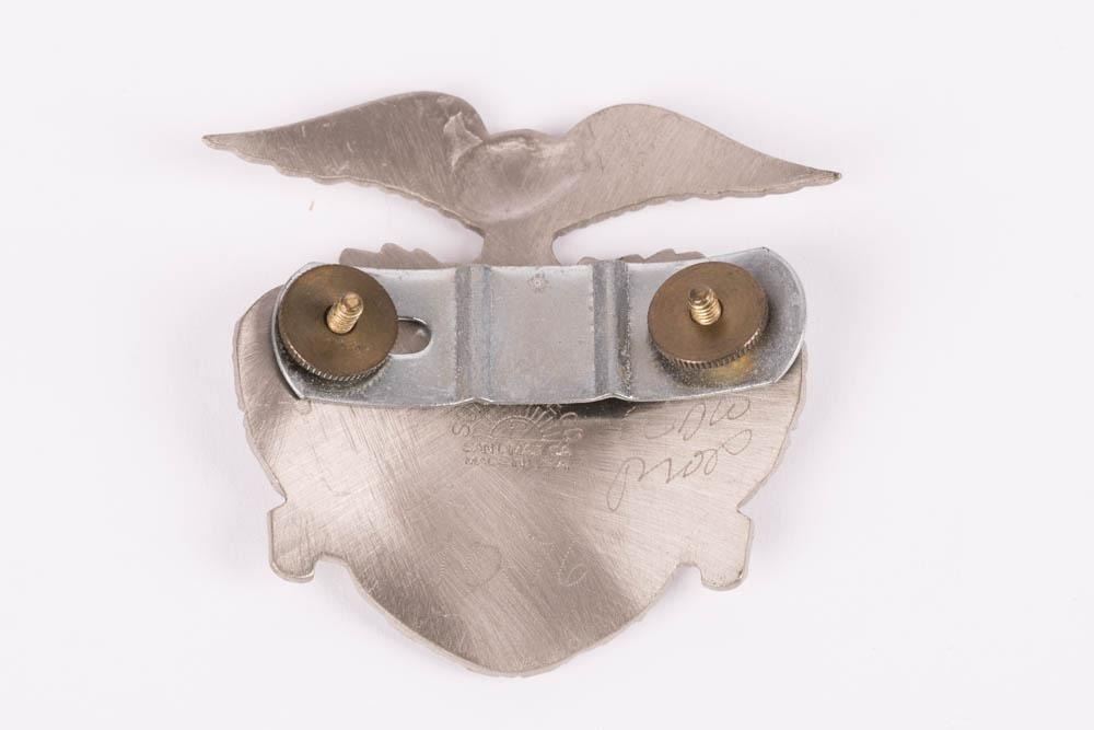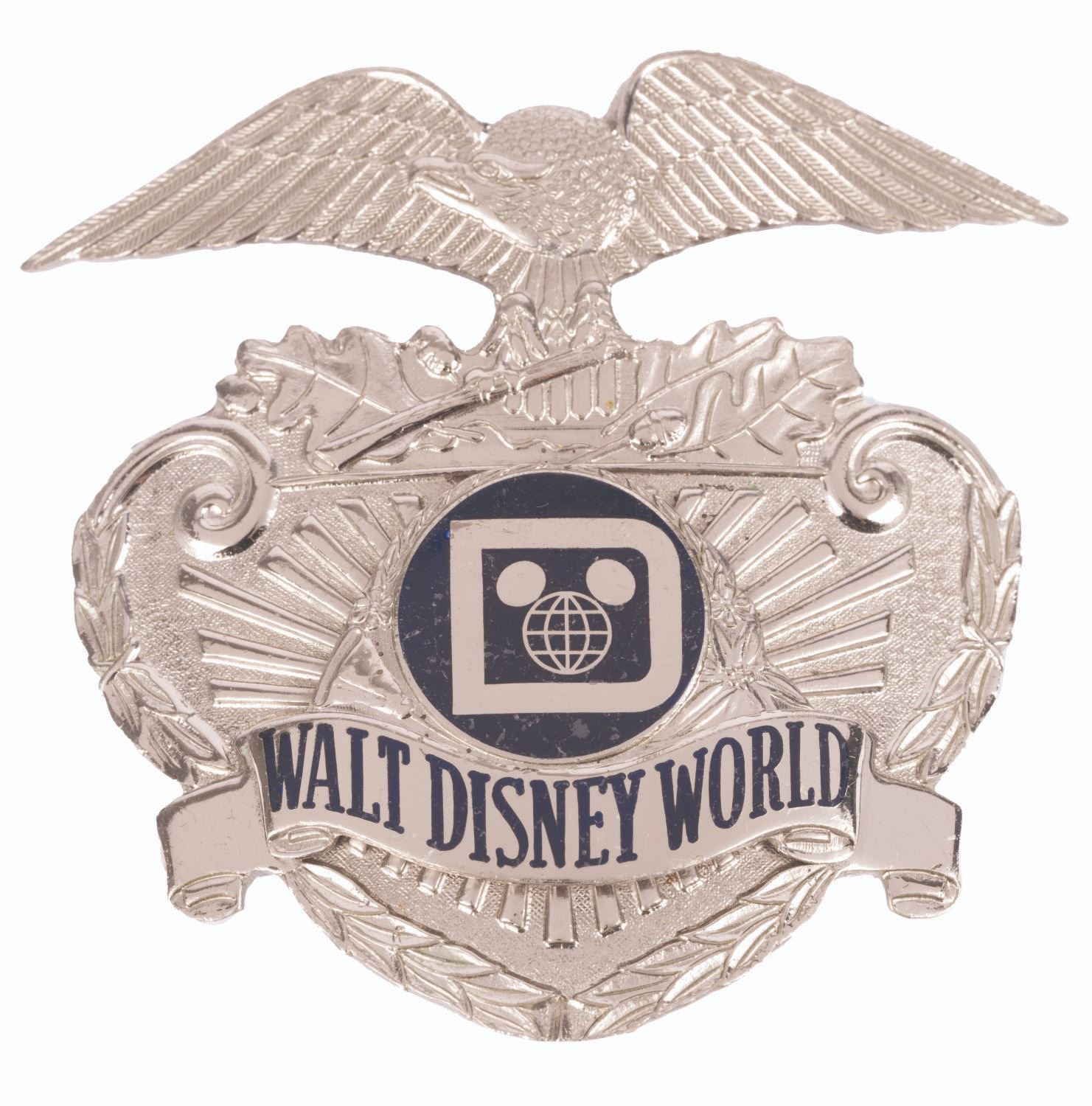 (Walt Disney World, 1970s) A badge worn by security officers at Walt Disney World, featuring the original Walt Disney World logo. Measuring 2.75" x 2.5" the badge is in good condition with scuffs and wear.