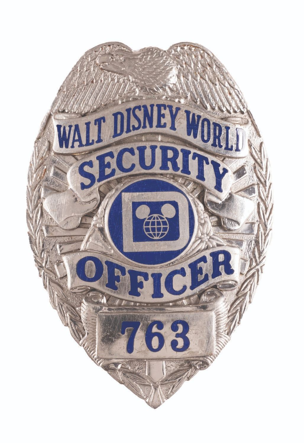 (Walt Disney World, 1990s) A Walt Disney World Security Officer badge numbered 763. Measuring 2.25"x3.25", the badge is in very good condition, with scuffs and wear from Cast use.