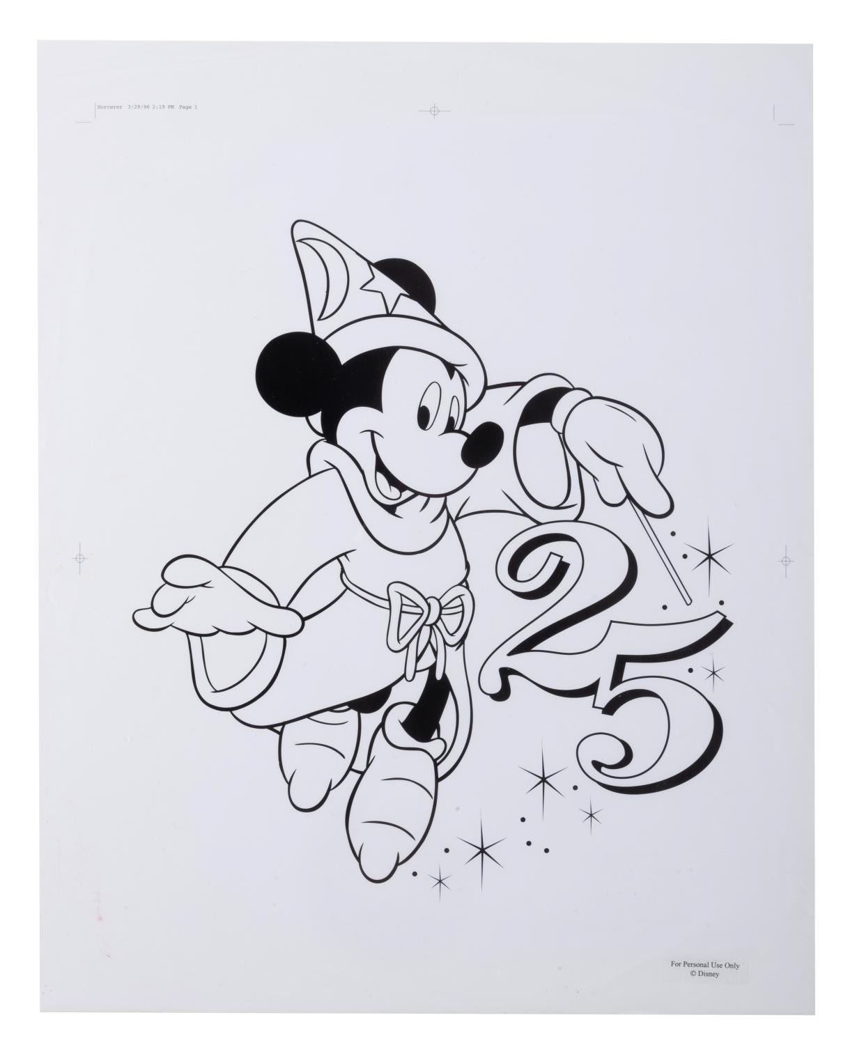 (Walt Disney World, 1996) A printing stat of a Sorcerer Mickey graphic used in the promotion of Walt Disney World's 25th anniversary. With an image size of 12.5" x 13.5" on 16" x 20" paper, the printing stat displays in good condition with heavy creasing and scuffs.